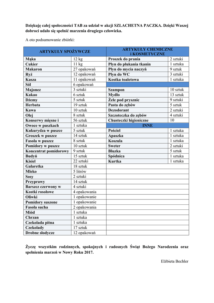 Dziękuję całej społeczności TAB za udział w akcji SZLACHETNA PACZKA. Dzięki Waszej dobroci udało się spełnić marzenia drugiego człowieka. A oto podsumowanie zbiórki: ARTYKUŁY SPOŻYWCZE Mąka Cukier Makaron Ryż Kasza Sól Majonez Kakao Dżemy Herbata Kawa Olej Konserwy mięsne i rybne Owoce w puszkach Kukurydza w puszce Groszek w puszce Fasola w puszce Pomidory w puszce Koncentrat pomidorowy Budyń Kisiel Galaretka Mleko Sosy Przyprawy Barszcz czerwony w kartonie Kostki rosołowe Oliwki Pomidory suszone Fasola sucha Miód Chrzan Czekolada pitna Czekolady Drobne słodycze 12 kg 11 kg 27 opakowań 12 opakowań 11 opakowań 6 opakowań 3 sztuki 6 sztuk 5 sztuk 19 sztuk 10 sztuk 8 sztuk 56 sztuk 1 sztuka 5 sztuk 14 sztuk 8 sztuk 10 sztuk 9 sztuk 15 sztuk 22 sztuki 18 sztuk 5 litrów 2 sztuki 14 sztuk 4 sztuki 4 opakowania 1 opakowanie 1 opakowanie 2 opakowania 1 sztuka 1 sztuka 1 sztuka 17 sztuk 12 opakowań ARTYKUŁY CHEMICZNE i KOSMETYCZNE 2 sztuki Proszek do prania 1 sztuka Płyn do płukania tkanin 9 sztuk Płyn do mycia naczyń 3 sztuki Płyn do WC 1 sztuka Kostka toaletowa Szampon Mydło Żele pod prysznic Pasta do zębów Dezodorant Szczoteczka do zębów Chusteczki higieniczne INNE Pościel Apaszka Koszula Sweter Bluzka Spódnica Kurtka 10 sztuk 13 sztuk 9 sztuki 5 sztuk 2 sztuki 4 sztuki 10 opakowań 1 sztuka 1 sztuka 1 sztuka 2 sztuki 5 sztuk 1 sztuka 1 sztuka Życzę wszystkim rodzinnych, spokojnych i radosnych Świąt Bożego Narodzenia oraz spełnienia marzeń w Nowy Roku 2017. Elżbieta Bechler