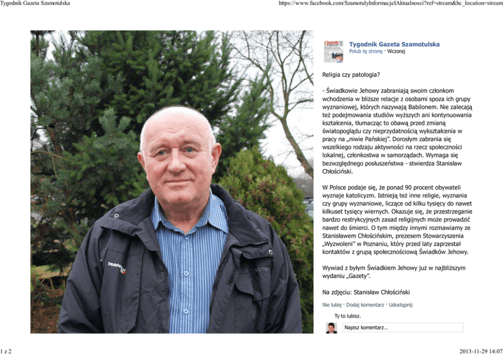 Tygodnik Gazeta Szamotulska https://www.facebook.com/SzamotulyInformacjeIAktualnosci?ref=stream&hc_location=stream Tygodnik Gazeta Szamotulska Polub tę stronę · Wczoraj Religia czy patologia? - Świadkowie Jehowy zabraniają swoim członkom wchodzenia w bliższe relacje z osobami spoza ich grupy wyznaniowej, których nazywają Babilonem. Nie zalecają też podejmowania studiów wyższych ani kontynuowania kształcenia, tłumacząc to obawą przed zmianą światopoglądu czy nieprzydatnością wykształcenia w pracy na „niwie Pańskiej”. Dorosłym zabrania się wszelkiego rodzaju aktywności na rzecz społeczności lokalnej, członkostwa w samorządach. Wymaga się bezwzględnego posłuszeństwa - stwierdza Stanisław Chłościński. W Polsce podaje się, że ponad 90 procent obywateli wyznaje katolicyzm. Istnieją też inne religie, wyznania czy grupy wyznaniowe, liczące od kilku tysięcy do nawet kilkuset tysięcy wiernych. Okazuje się, że przestrzeganie bardzo restrykcyjnych zasad religijnych może prowadzić nawet do śmierci. O tym między innymi rozmawiamy ze Stanisławem Chłościńskim, prezesem Stowarzyszenia „Wyzwoleni” w Poznaniu, który przed laty zaprzestał kontaktów z grupą społecznościową Świadków Jehowy. Wywiad z byłym Świadkiem Jehowy już w najbliższym wydaniu „Gazety”. Na zdjęciu: Stanisław Chłościński Nie lubię · Dodaj komentarz · Udostępnij Ty to lubisz. Napisz komentarz… 1z2 2013-11-29 14:07 Tygodnik Gazeta Szamotulska https://www.facebook.com/SzamotulyInformacjeIAktualnosci?ref=stream&hc_location=stream Jacek Zahorski się wszelkiego rodzaju aktywności na rzecz społeczności lokalnej, członkostwa w samorządach. Wymaga się bezwzględnego posłuszeństwa - stwierdza Stanisław Chłościński. W Polsce podaje się, że ponad 90 procent obywateli wyznaje katolicyzm. Istnieją też inne religie, wyznania czy grupy wyznaniowe, liczące od kilku tysięcy do nawet kilkuset tysięcy wiernych. Okazuje się, że przestrzeganie bardzo restrykcyjnych zasad religijnych może prowadzić nawet do śmierci. O tym między innymi rozmawiamy ze Stanisławem Chłościńskim, prezesem Stowarzyszenia „Wyzwoleni” w Poznaniu, który przed laty zaprzestał kontaktów z grupą społecznościową Świadków Jehowy. Wywiad z byłym Świadkiem Jehowy już w najbliższym wydaniu „Gazety”. Szukaj znajomych Strona główna użytkownika Powiat Szamotulski. 27 listopada Kochani, nie udało się ostatnio - pokonały nas Gliwice. Ale może tym razem się uda i RMF FM przez cały dzień będzie nadawać Fakty z Szamotuł? Głosujemy do jutra, do godziny 12:00! :) Najnowsze 2013 Fakty z Twojego Miasta. Zdecyduj, dokąd pojedziemy! www.rmf24.pl Biecz, Chocianów, Dębica, Iława, Szamotuły, a może Wejherowo? W którejś z tych miejscowości na pewno Lubię to! · Dodaj komentarz · Udostępnij 5 4 osoby lubią to. Na zdjęciu: Stanisław Chłościński Tygodnik Gazeta Szamotulska 25 listopada Lekturę najnowszego numeru macie już za sobą? 2z2 2013-11-29 14:07