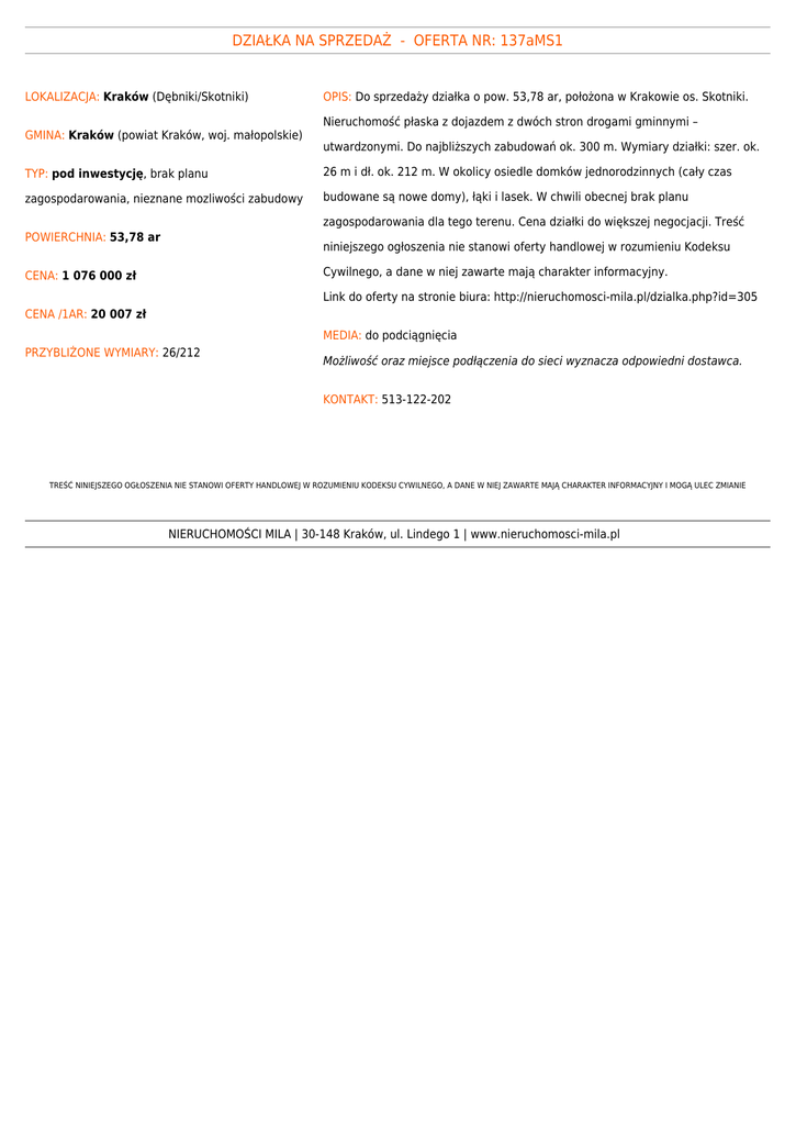 DZIAŁKA NA SPRZEDAŻ - OFERTA NR: 137aMS1 LOKALIZACJA: Kraków (Dębniki/Skotniki) GMINA: Kraków (powiat Kraków, woj. małopolskie) OPIS: Do sprzedaży działka o pow. 53,78 ar, położona w Krakowie os. Skotniki. Nieruchomość płaska z dojazdem z dwóch stron drogami gminnymi – utwardzonymi. Do najbliższych zabudowań ok. 300 m. Wymiary działki: szer. ok. TYP: pod inwestycję, brak planu 26 m i dł. ok. 212 m. W okolicy osiedle domków jednorodzinnych (cały czas zagospodarowania, nieznane mozliwości zabudowy budowane są nowe domy), łąki i lasek. W chwili obecnej brak planu zagospodarowania dla tego terenu. Cena działki do większej negocjacji. Treść POWIERCHNIA: 53,78 ar niniejszego ogłoszenia nie stanowi oferty handlowej w rozumieniu Kodeksu Cywilnego, a dane w niej zawarte mają charakter informacyjny. CENA: 1 076 000 zł Link do oferty na stronie biura: http://nieruchomosci-mila.pl/dzialka.php?id=305 CENA /1AR: 20 007 zł MEDIA: do podciągnięcia PRZYBLIŻONE WYMIARY: 26/212 Możliwość oraz miejsce podłączenia do sieci wyznacza odpowiedni dostawca. KONTAKT: 513-122-202 TREŚĆ NINIEJSZEGO OGŁOSZENIA NIE STANOWI OFERTY HANDLOWEJ W ROZUMIENIU KODEKSU CYWILNEGO, A DANE W NIEJ ZAWARTE MAJĄ CHARAKTER INFORMACYJNY I MOGĄ ULEC ZMIANIE NIERUCHOMOŚCI MILA | 30-148 Kraków, ul. Lindego 1 | www.nieruchomosci-mila.pl