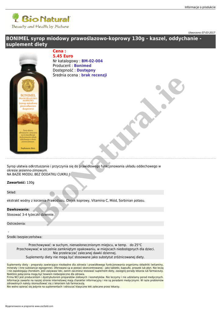 Informacje o produkcie Utworzono 07-03-2017 BONIMEL syrop miodowy prawoślazowo-koprowy 130g - kaszel, oddychanie suplement diety Cena : 5.45 Euro N at ur al .ie Nr katalogowy : BM-02-004 Producent : Bonimed Dostępność : Dostępny Średnia ocena : brak recenzji Syrop ułatwia odkrztuszanie i przyczynia się do prawidłowego funkcjonowania układu oddechowego w okresie jesienno-zimowym. NA BAZIE MIODU, BEZ DODATKU CUKRU ! Skład: io Zawartość: 130g ekstrakt wodny z korzenia Prawoślazu, Olejek koprowy, Vitamina C, Miód, Sorbinian potasu. B Dawkowanie: Stosować 3-4 łyżeczki dziennie. Ostrzeżenia: Środki bezpieczeństwa: Przechowywać: w suchym, nienasłonecznionym miejscu, w temp. do 25°C Przechowywać w szczelnie zamkniętym opakowaniu, w miejscach niedostępnych dla dzieci. Nie przekraczać zalecanej dawki dziennej. Suplementy diety nie mogą być stosowane jako substytut zróżnicowanej diety. Suplementy diety - preparaty zawierające niezbędne dla zdrowia i prawidłowego funkcjonowania organizmu składniki (witaminy, minerały i inne substancje egzogenne). Oferowane są w postaci skoncentrowanej - jako tabletki, kapsułki, proszek lub płyn. Nie leczą i nie zapobiegają chorobom. Jeśli zażywasz leki, zanim zaczniesz stosować suplement diety, zasięgnij porady lekarza lub farmaceuty. Niektóre połączenia mogą być bowiem niebezpieczne dla zdrowia. Firma NCI jest producentem i dystrybutorem preparatów ziołowych i kosmetyków. Nie leczymy i nie udzielamy porad medycznych. Informacje zawarte na naszej stronie internetowej mają charakter informacyjny i nie są poradami medycznymi. W razie problemów zdrowotnych należy skonsultować się z lekarzem lub farmaceutą. Nie wolno opierać się jedynie na suplementach i odrzucać klasyczne leki zalecane przez lekarzy. Wygenerowano w programie www.oscGold.com B io N at ur al .ie Pochodzenie: Polska Najlepsze przed: 31/07/2015