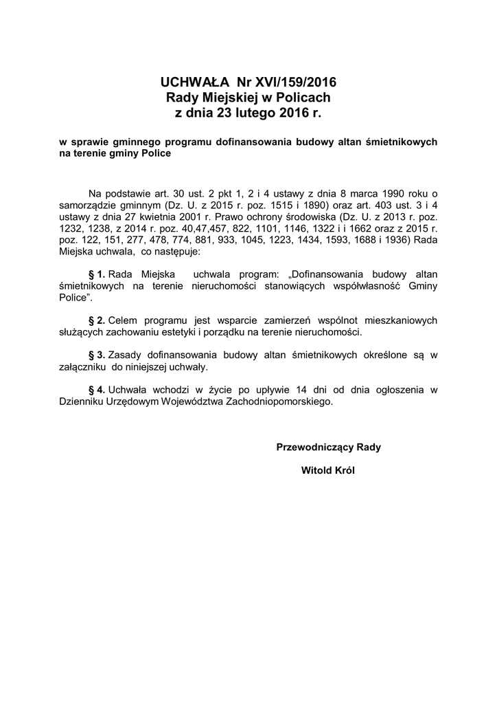 UCHWAŁA Nr XVI/159/2016 Rady Miejskiej w Policach z dnia 23 lutego 2016 r. w sprawie gminnego programu dofinansowania budowy altan śmietnikowych na terenie gminy Police Na podstawie art. 30 ust. 2 pkt 1, 2 i 4 ustawy z dnia 8 marca 1990 roku o samorządzie gminnym (Dz. U. z 2015 r. poz. 1515 i 1890) oraz art. 403 ust. 3 i 4 ustawy z dnia 27 kwietnia 2001 r. Prawo ochrony środowiska (Dz. U. z 2013 r. poz. 1232, 1238, z 2014 r. poz. 40,47,457, 822, 1101, 1146, 1322 i i 1662 oraz z 2015 r. poz. 122, 151, 277, 478, 774, 881, 933, 1045, 1223, 1434, 1593, 1688 i 1936) Rada Miejska uchwala, co następuje: § 1. Rada Miejska uchwala program: „Dofinansowania budowy altan śmietnikowych na terenie nieruchomości stanowiących współwłasność Gminy Police”. § 2. Celem programu jest wsparcie zamierzeń wspólnot mieszkaniowych służących zachowaniu estetyki i porządku na terenie nieruchomości. § 3. Zasady dofinansowania budowy altan śmietnikowych określone są w załączniku do niniejszej uchwały. § 4. Uchwała wchodzi w życie po upływie 14 dni od dnia ogłoszenia w Dzienniku Urzędowym Województwa Zachodniopomorskiego. Przewodniczący Rady Witold Król Uzasadnienie Projekt uchwały przedstawia Radzie Miejskiej w Policach Burmistrz Polic. Umieszczenie pojemników na odpady w zabezpieczonych pomieszczeniach (altanach) poprawi estetykę miejsc do ich składowania. Być może, że ograniczy to również tzw. „podrzucanie śmieci” z innych terenów. Załącznik do uchwały Nr XVI/159/2016 Rady Miejskiej w Policach z dnia 23.02.2016 r. PROGRAM BUDOWY ALTAN ŚMIETNIKOWYCH 1. Wysokość dofinansowania programu wynosi 80% zestawienia kosztów przedsięwzięcia dotyczącego budowy a w szczególności: kosztów przygotowania dokumentacji technicznej, wykonania robót budowlanych. Dofinansowanie odbywać się będzie w ramach środków przewidzianych w budżecie na dany rok. 2. Warunkiem uzyskania przez wspólnotę mieszkaniową dofinansowania jest: a) podjęcie przez wspólnotę mieszkaniową uchwały o budowie altany śmietnikowej, b) wyasygnowanie przez współwłaścicieli budynków 20% kosztów planowanego przedsięwzięcia, c) złożenie do Burmistrza Polic przez zarząd wspólnoty wniosku do realizacji w danym roku budżetowym, d) zakwalifikowanie złożonego wniosku do realizacji w danym roku budżetowym. 3. Zasady przekazywania środków niezbędnych do finansowania zamierzenia oraz tryb wyboru wykonawcy robót zostaną określone w umowie zawartej pomiędzy wspólnotą mieszkaniową a Gminą Police. W zakresie nieuregulowanym umową zastosowanie mają odpowiednie przepisy ustawy o finansach publicznych.