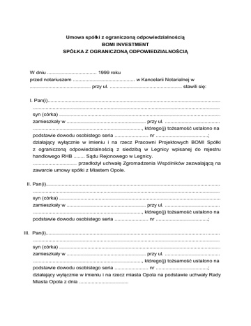 Umowa spółki z ograniczoną odpowiedzialnością BOMI INVESTMENT SPÓŁKA Z OGRANICZONĄ ODPOWIEDZIALNOŚCIĄ W dniu ................................... 1999 roku przed notariuszem ............................................ w Kancelarii Notarialnej w ........................................... przy ul. ................................................... stawili się: I. Pan(i).......................................................................................................................... .................................................................................................................................... syn (córka) .................................................................................................................. zamieszkały w ........................................................ przy ul. ....................................... ............................................................................., którego(j) tożsamość ustalono na podstawie dowodu osobistego seria ........................ nr .....................................; działający wyłącznie w imieniu i na rzecz Pracowni Projektowych BOMI Spółki z ograniczoną odpowiedzialnością z siedzibą w Legnicy wpisanej do rejestru handlowego RHB ........ Sądu Rejonowego w Legnicy. ............................... przedłożył uchwałę Zgromadzenia Wspólników zezwalającą na zawarcie umowy spółki z Miastem Opole. II. Pan(i)........................................................................................................................... .................................................................................................................................... syn (córka) .................................................................................................................. zamieszkały w ........................................................ przy ul. ....................................... ............................................................................., którego(j) tożsamość ustalono na podstawie dowodu osobistego seria ........................ nr .....................................; III. Pan(i)........................................................................................................................... .................................................................................................................................... syn (córka) .................................................................................................................. zamieszkały w ........................................................ przy ul. ....................................... ............................................................................., którego(j) tożsamość ustalono na podstawie dowodu osobistego seria ........................ nr .....................................; działający wyłącznie w imieniu i na rzecz miasta Opola na podstawie uchwały Rady Miasta Opola z dnia ................................... I. Postanowienia ogólne §1 Stawający, zwani dalej Wspólnikami, oświadczają, że w celu prowadzenia działalności gospodarczej zawiązują spółkę z ograniczoną odpowiedzialnością zwaną dalej „Spółką”. §2 Firma Spółki brzmi: „BOMI Investment Spółka z ograniczoną odpowiedzialnością”. Spółka może używać skróconej nazwy BOMI Investment Sp. z o.o. §3 1. Siedzibą Spółki jest miasto Opole. 2. Spółka działa na terytorium Rzeczypospolitej Polskiej oraz poza jej granicami. 3. Spółka może tworzyć filie, oddziały i przedstawicielstwa w kraju i za granicą, jak również prowadzić zakłady produkcyjne, handlowe i usługowe, a także uczestniczyć w innych spółkach w kraju i za granicą. §4 Czas trwania Spółki jest nieograniczony. II. Przedmiot przedsiębiorstwa Spółki §5 Przedmiotem przedsiębiorstwa Spółki jest: 1) prowadzenie inwestycji i nadzór budowlany (D. 101), 2) prace budowlane (D.096), 3) prowadzenie parkingów strzeżonych (D.053), 4) zarządzanie nieruchomościami (D.028), 5) wynajem sprzętu budowlanego i burzącego wraz z obsługą operatorską (45.50), 6) zagospodarowanie i sprzedaż nieruchomości (70.71), 7) kupno i sprzedaż nieruchomości dzierżawionych lub stanowiących własność osobistą (70.12), 8) wynajem nieruchomości własnych lub dzierżawionych (70.20), 9) działalność agencji obsługi nieruchomości (70.31), 2 10) zarządzanie nieruchomościami na zasadzie bezpośredniej płatności lub kontraktu (70.32), 11) wykonanie urbanistycznego planowania budowlanego łącznie ze sprawowaniem nadzoru inwestorskiego (74.20), 12) prowadzenie prac badawczo-rozwojowych w zakresie architektury, urbanistyki oraz budownictwa (73.10). III. Kapitał zakładowy Spółki §6 1. Kapitał zakładowy Spółki wynosi 5.000 zł (słownie: pięć tysięcy złotych) i dzieli się na 100 równych i niepodzielnych udziałów po 50 zł (słownie: sto złotych) każdy. 2. Każdy Wspólnik może mieć więcej niż jeden udział. 3. Wspólnicy obejmują udziały i pokrywają je gotówką w następujący sposób: 1) Pracownie Projektowe BOMI Sp. z o.o. – 51 udziałów o wartości 50 zł każdy, to jest udziały o łącznej wartości 2550 złotych, 2) miasto Opole 49 udziałów o wartości 50 zł każdy, to jest udziały o łącznej wartości 2450 złotych. 4. Wspólnik miasto Opole zobowiązuje się nadto do wniesienia w formie wkładu niepieniężnego prawa wieczystego użytkowania nieruchomości nie zabudowanej położonej w Opolu przy ul. Żwirki i Wigury ......., o powierzchni ........ metrów kwadratowych, dla której Sąd Rejonowy w Opolu posiada urządzoną księgę wieczystą kw numer ............. oraz dokumentacji technicznej obiektu „Parking wielopoziomowy z usługami i zbiornikiem retencyjnym”. 5. Wspólnik Pracownie Projektowe BOMI Sp. z o.o. proporcjonalnie do wniesionych udziałów zobowiązuje się do podwyższe