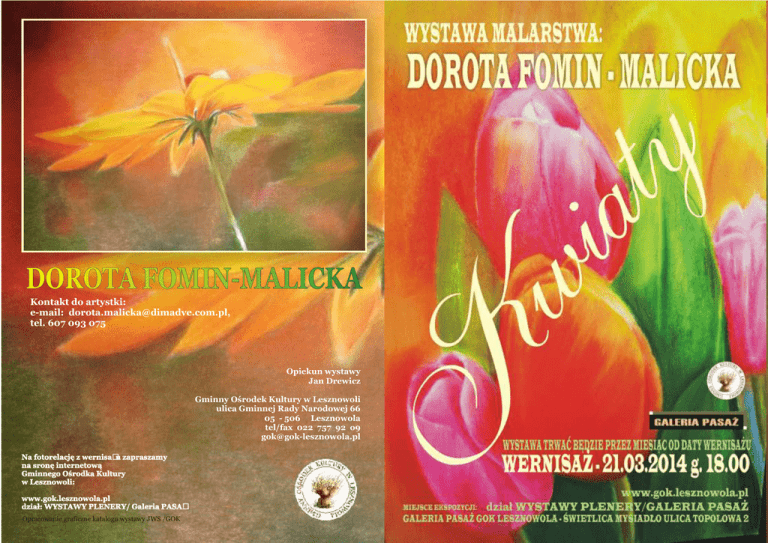 DOROTA FOMIN-MALICKA Kontakt do artystki: e-mail: [email protected], tel. 607 093 075 Opiekun wystawy Jan Drewicz Gminny Ośrodek Kultury w Lesznowoli ulica Gminnej Rady Narodowej 66 05 - 506 Lesznowola tel/fax 022 757 92 o9 [email protected] Na fotorelację z wernisażu zapraszamy na sronę internetową Gminnego Ośrodka Kultury w Lesznowoli: www.gok.lesznowola.pl dział: WYSTAWY PLENERY/ Galeria PASAŻ Opracowanie graficzne katalogu wystawy JWS /GOK DOROTA FOMIN-MALICKA Przez szereg lat Dyrektor Artystyczny w Agencjach Reklamowych. Artystka Grafik. Absolwentka Warszawskiej Akademii Sztuk Piźknych. Projektant, kostiumograf, kierownik artystyczny w Fabryce Jedwabiu Milanówek. Artystka porzuciła sztukę użytkową dla malarstwa. Teraz jej ulubionym tematem s¹ kwiaty. Dlaczego kwiaty? Bo nic tak nie poprawia samopoczucia, jak piźkne kwiaty. Symbolizuj¹ równieæ dobry nastrój, radoúę, wdziźcznoúę, mi³oúę i piźkno otaczaj¹cego úwiata Uczestniczyła w wystawach zbiorowych w kraju i zagranicą. wystawa malarstwa KWIATY