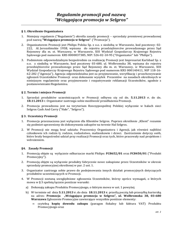 Załącznik nr 1 do regulaminu promocji „Wciągająca promocja w Selgros”