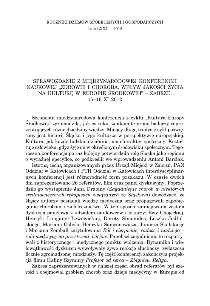 ROCZNIKI DZIEJÓW SPOŁECZNYCH I GOSPODARCZYCH Tom LXXII – 2012 SPRAWOZDANIE Z MIĘDZYNARODOWEJ KONFERENCJI NAUKOWEJ „ZDROWIE I CHOROBA. WPŁYW JAKOŚCI ŻYCIA NA KULTURĘ W EUROPIE ŚRODKOWEJ” – ZABRZE, 15–16 XI 2012 Szesnasta międzynarodowa konferencja z cyklu „Kultura Europy Środkowej” zgromadziła, jak co roku, znakomite grono badaczy reprezentujących różne dziedziny wiedzy. Mający długą tradycję cykl poświęcony jest historii Śląska i jego kulturze w perspektywie europejskiej. Kultura, jak każde ludzkie działanie, ma charakter społeczny. Kształtuje człowieka, gdyż żyje on w określonym środowisku społecznym. Tegoroczna konferencja po raz kolejny potwierdziła rolę Śląska jako regionu o wyraźnej specyfice, co podkreślił we wprowadzeniu Antoni Barciak. Istotną cechą organizowanych przez Urząd Miejski w Zabrzu, PAN Oddział w Katowicach i PTH Oddział w Katowicach interdyscyplinarnych konferencji jest różnorodność form przekazu. W czasie dwóch dni zaprezentowano 26 referatów, film oraz panel dyskusyjny. Poprzedziło go wystąpienie Jana Drabiny (Zagadnienie chorób w niektórych średniowiecznych rękopisach związanych ze Śląskiem) dowodzące, że śląscy autorzy posiadali wiedzę medyczną oraz propagowali zapobieganie chorobom i ziołolecznictwo. W ten sposób zainicjowana została dyskusja panelowa z udziałem naukowców i lekarzy: Ewy Chojeckiej, Henryki Langauer-Lewowickiej, Doroty Simonides, Leszka Jodlińskiego, Mariana Oslislo, Henryka Samsonowicza, Janusza Skalskiego i Mariana Zembali zatytułowana Ból i cierpienie, radość i nadzieja – rola medycyny na przestrzeni dziejów. Paneliści zagadnienie to rozpatrywali z historycznego i medycznego punktu widzenia. Dynamika i wielowątkowość dyskursu wywoływały żywe reakcje słuchaczy, zwłaszcza licznie zgromadzonej młodzieży. Tę część konferencji zakończyła projekcja filmu Haliny Szymury Profesor od serca – Zbigniew Religa. Zakres zaprezentowanych w dalszej części obrad referatów był szeroki i obejmował problem chorób oraz dzieje medycyny w Europie od 308 Sprawozdanie średniowiecza do XXI w. Zostały one podzielone na dwie grupy tematyczne. Pierwsza, Postrzeganie chorób na przestrzeni wieków, zawierała wystąpienia dotyczące chorób i zabiegów medycznych. Marek Cetwiński (Komes Wojsław i inni: rany choroby lekarze w polskich kronikach średniowiecznych) omówił pomyślnie przeprowadzoną trepanację czaszki, która w czasach średniowiecza nie była zabiegiem wyjątkowym. Choroby piętnastowiecznych książąt i władców Polski i Litwy przedstawiła Ruta Čapaitė (Choroby w listach Witolda i jego korespondentów), a Marie Bláhová (Kronikářské zprávy o nemocech panovniků ve středovéku) zaprezentowała informacje o dolegliwościach czeskich władców średniowiecznych. Nie tylko choroby elit były przedmiotem rozważań. Agata Bryłka („W Koziorożcu, krew puszczać źle, purgacia brać”, czyli rzecz o zabiegach medycznych, które należy czynić. Obraz profilaktyki zdrowotnej w świetle śląskich wydawnictw kalendarzowych do połowy XVIII wieku) przedstawiła wydawnictwa kalendarzowe jako środki przekazu wiedzy medycznej. Waldemar Kowalski i Olga Domińska (Pińczów w latach pomorów: 1650–1655, 1695–1715) poddali analizie wzrost liczby zgonów w czasach zarazy, zagadnienie epidemii jako wydarzenia przekraczającego granice państw ukazał zaś Martin Faber (Indie – Rosja – Polska – Prusy. Epidemia cholery z 1831/1832 jako wydarzenie międzynarodowe). Druga grupa tematyczna, Dzieje medycyny i zapobieganie chorobom, skupiała referaty dotyczące historii medycyny. Beata Wojciechowska (Poród i troska o małe dziecko w Europie średniowiecznej) przedstawiła rady anonimowych autorów dotyczące porodu i opieki nad dzieckiem, a Jolanta M. Marszalska (Troska o zdrowie w świetle zachowanych zespołów starych druków medycznych, wybranych księgozbiorów zakonnych w Polsce) omówiła wskazania lekarskie zawarte w szesnasto- i siedemnastowiecznych księgach. Na potrzebę intensyfikacji badań nad dziejami medycyny średniowiecznej i wczesnonowożytnej na Śląsku wskazał Wojciech Iwańczak (Medycyna średniowieczna na Śląsku w obrazie powojennej historiografii). Troska o siebie przyjaciół, Macieja Kazimierza Sarbiewskiego i Stanisława Łubieńskiego, stała się przedmiotem rozważań ks. Waldemara Graczyka (Zdrowie i choroba w korespondencji XVII-wiecznych uczonych: jezuity Macieja Kazimierza Sarbiewskiego i biskupa Stanisława Łubieńskiego), a duchowy wymiar niesienia pomocy cierpiącym w kontekście posługi duchownych ukazał ks. Kazimierz Dola (Pomoc duchowa niesiona chorym przez Kościół katolicki). W kilku wystąpieniach poruszony został temat służby zdrowia. Dokonania czeskich lekarzy w XIX i XX w. omówił Ivan Hlaváček (Čeští Sprawozdanie 309 lékaři a jejich nelékařské horizonty v 19. a 20. století). Tomasz Kałuski (Formy zinstytucjonalizowanej opieki nad chorymi w okresie wczesnonowożytnym. Szpitale na północnym Śląsku do XIX w.) zarysował sposób funkcjonowania szpitali w okresie wczesnonowożytnym, a ich uwarunkowania prawne w XIX w. przedstawił Piotr Franaszek (Publiczna ochrona zdrowia w Galicji w dobie autonomii). Bożena Płonka-Syroka (Kultura uzdrowiskowa w Polsce w latach 1918–2012. Społeczno-kulturowe uwarunkowania zmiany jej modelu) scharakteryzowała modele opieki uzdrowiskowej, a roli przekazu kartograficznego w propagowaniu lecznictwa uzdrowiskowego poświęcony był referat Bogusława Czechowicza (Dawna kartografia w służbie medycyny na obszarze Korony Królestwa Czech, ze szczególnym uwzględnieniem Śląska). Stefan Ciara (Lwowskie korzenie Śląskiej Akademii Lekarskiej) ukazał rolę medycyny lwowskiej w tworzeniu śląskiej kadry naukowej, a odkrycia i metody badań Marii Skłodowskiej-Curie zaprezentował Rajmund Michalski (Maria Skłodowska-Curie – zna