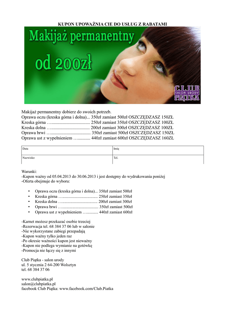KUPON UPOWAŻNIA CIE DO USŁUG Z RABATAMI Makijaż permanentny dobierz do swoich potrzeb. Oprawa oczu (kreska górna i dolna)... 350zł zamiast 500zł OSZCZĘDZASZ 150ZŁ Kreska górna ….................................. 250zł zamiast 350zł OSZCZĘDZASZ 100ZŁ Kreska dolna ….................................. 200zł zamiast 300zł OSZCZĘDZASZ 100ZŁ Oprawa brwi …................................... 350zł zamiast 500zł OSZCZĘDZASZ 150ZŁ Oprawa ust z wypełnieniem …........... 440zł zamiast 600zł OSZCZĘDZASZ 160ZŁ Data Imię Nazwisko Tel. Warunki: -Kupon ważny od 05.04.2013 do 30.06.2013 i jest dostępny do wydrukowania poniżej -Oferta obejmuje do wyboru: • • • • • Oprawa oczu (kreska górna i dolna)... 350zł zamiast 500zł Kreska górna ….................................. 250zł zamiast 350zł Kreska dolna ….................................. 200zł zamiast 300zł Oprawa brwi …................................... 350zł zamiast 500zł Oprawa ust z wypełnieniem …........... 440zł zamiast 600zł -Karnet możesz przekazać osobie trzeciej -Rezerwacja tel. 68 384 37 06 lub w salonie -Nie wykorzystane zabiegi przepadają -Kupon ważny tylko jeden raz -Po okresie ważności kupon jest nieważny -Kupon nie podlega wymianie na gotówkę -Promocja nie łączy się z innymi Club Piątka - salon urody ul. 5 stycznia 2 64-200 Wolsztyn tel. 68 384 37 06 www.clubpiatka.pl [email protected] facebook Club Piątka: www.facebook.com/Club.Piatka