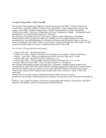 Grzegorz Winogradski – Prezes Zarządu Pan Grzegorz Winogradski jest Doktorem Nauk Ekonomicznych od 2006 r. Ukończył Państwowy Uniwersytet w Doniecku (ZSRR), Wydział Fizyki, Specjalność: fizyka rentgenowska i fizyka ciała stałego, „Mini MBA” Studium MenadŜerskie w Polsko-Amerykańskim Centrum Zarządzania (Uniwersytet Łódzki / University of Maryland-USA) oraz Podyplomowe Studia – „Europejskie Studia MenadŜerskie” na Akademii Ekonomicznej w Krakowie. Pan Grzegorz Winogradski ukończył liczne kursy z zakresu analizy finansowej, controlingu i budŜetowania kosztów, postępowań sądowych i podatkowych oraz odpowiedzialności karnej przedsiębiorstw, kurs dla kandydatów na członków rad nadzorczych dla Skarbu Państwa oraz kurs z zakresu zarządzania przez jakość TQM i system jakości wg norm ISO 9000 oraz wiele innych. W 2002 otrzymał certyfikat audytora systemu zarządzania jakością ISO 9001:2000. Pan Grzegorz Winogradski pracował kolejno: - w latach 1975-1977 – Wykładowca fizyki, - w latach 1977-1980 - Ekspert w Państwowym Przedsiębiorstwie Badań i Ochrony Środowiska, - w latach – 1980-1989 - Właściciel zakładu przetwórstwa tworzyw sztucznych w Łodzi, - w latach 1989-1990 – Dyrektor Naczelny Ceramet Sp. z o.o., - w latach 1989-2000 – Prezes Zarządu, Dyrektor Naczelny Proimpex Sp. z o.o. w Łodzi, - od maja 2000 do kwietnia 2008 – Prezes Zarządu Unimil S.A. w Krakowie. Pan Grzegorz Winogradski posiada doświadczenie w pełnieniu w spółkach funkcji nadzorczych i zarządczych. W latach 2005-2007 pełnił funkcję Przewodniczącego Rady Nadzorczej Condomi Health International GmbH, Kolonia (Niemcy) oraz w latach 2006-2007 funkcję Przewodniczącego Rady Nadzorczej Condomi Erfurt Produktionsgesellschaft mbH, Erfurt (Niemcy), a takŜe w roku 2005 sprawował funkcję Prezesa Zarządu Condomi Health International GmbH, Kolonia (Niemcy). Dodatkowo Pan Grzegorz Winogradski sprawuje funkcję Wiceprezydenta Izby Przemysłowo-Handlowej w Krakowie oraz członka Prezydium i Przewodniczącego podkomisji Polityki Gospodarczej w PK BIAC (Business and Industry Advisory Commitee) przy OECD (ParyŜ).