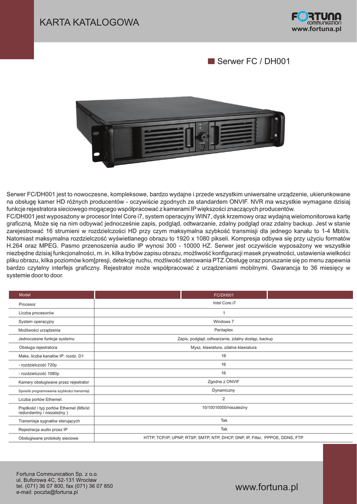 KARTA KATALOGOWA www.fortuna.pl Serwer FC / DH001 Serwer FC/DH001 jest to nowoczesne, kompleksowe, bardzo wydajne i przede wszystkim uniwersalne urządzenie, ukierunkowane na obsługę kamer HD różnych producentów - oczywiście zgodnych ze standardem ONVIF. NVR ma wszystkie wymagane dzisiaj funkcje rejestratora sieciowego mogącego współpracować z kamerami IP większości znaczących producentów. FC/DH001 jest wyposażony w procesor Intel Core i7, system operacyjny WIN7, dysk krzemowy oraz wydajną wielomonitorowa kartę graficzną. Może się na nim odbywać jednocześnie zapis, podgląd, odtwarzanie, zdalny podgląd oraz zdalny backup. Jest w stanie zarejestrować 16 strumieni w rozdzielczości HD przy czym maksymalna szybkość transmisji dla jednego kanału to 1-4 Mbit/s. Natomiast maksymalna rozdzielczość wyświetlanego obrazu to 1920 x 1080 pikseli. Kompresja odbywa się przy użyciu formatów H.264 oraz MPEG. Pasmo przenoszenia audio IP wynosi 300 - 10000 HZ. Serwer jest oczywiście wyposażony we wszystkie niezbędne dzisiaj funkcjonalności, m. in. kilka trybów zapisu obrazu, możliwość konfiguracji masek prywatności, ustawienia wielkości pliku obrazu, kilka poziomów kom[presji, detekcję ruchu, możliwość sterowania PTZ.Obsługę oraz poruszanie się po menu zapewnia bardzo czytelny interfejs graficzny. Rejestrator może współpracować z urządzeniami mobilnymi. Gwarancja to 36 miesięcy w systemie door to door. Model FC/DH001 Procesor Intel Core i7 Liczba procesorów 1 System operacyjny Windows 7 Możliwości urządzenia Pentaplex Jednoczesne funkcje systemu Obsługa rejestratora Zapis, podgląd, odtwarzanie, zdalny dostęp, backup Mysz, klawiatura, zdalna klawiatura Maks. liczba kanałów IP: rozdz. D1 16 - rozdzielczość 720p 16 - rozdzielczość 1080p 16 Kamery obsługiwane przez rejestrator Zgodne z ONVIF Sposób programowania szybkości transmisji Dynamiczny Liczba portów Ethernet Prędkość i typ portów Ethernet (Mbi/st redundantny / niezależny ) 2 10/10010000/niezależny Transmisja sygnałów sterujących Tak Rejestracja audio przez IP Tak Obsługiwane protokoły sieciowe HTTP, TCP/IP, UPNP, RTSP, SMTP, NTP, DHCP, DNP, IP, Filter, PPPOE, DDNS, FTP www.fortuna.pl www.fortuna.pl Serwer FC / DH001 Wyjścia wideo (liczba) Maks. rozdzielczość wyświetlanego obrazu Sposób kompresji obrazu Rozdzielczość rejestrowanego obrazu wideo Maks. rozdz. rejestrowanego obrazu (Mp) Tryby zapisu obrazu Maski prywatności (liczba dla każdej kamery) Wielkość pliku obrazu Liczba poziomów kompresji HDMI, Mini DisplayPort (2), DVI 1920 x 1080 H.264, MPEG 1080p, 720p, D1 2 Ręczny, ciągły, harmonogram, ruch 10 Konfigurowana 6 Detekcja ruchu Tak Liczba pól detekcji ruchu 196 Liczba poziomów czułości 8 Strona www Tak Sterowanie PTZ Tak Sieciowanie urządzęń po ethernecie Tak Program zdalnego klienta Tak Maks. liczba jednocześnie połączonych zdalnych klientów 10 Integracja z centralnym systemem zarządzającym CCTV Tak Dyski wbudowane, w tym wymienne liczba/maks. pojemność (TB) Wbudowany napęd do archiwizacji Archiwizacja na zewnętrznych nośnikach: Do 8 x 3 TB CD-R/RW/+/-/DVD+/ESATA, USB, NAS DVD/CD-ROM Tak Compact flash Tak Inne Maks pojemność zewn. nośnika (GB) Eksport do standardowych formatów Zdalne powiadamianie o zdarzeniach i alarmach Dysk systemowy SSD 128 GB 32 (USB), 1000 (eSATA) AVI, JPEG Okno z komunikatem, e-mail, dźwiękowe, e-mapy Wejścia alarmowe 4 Wyjścia przekaźnikowe 2 Zabezpieczenie nagranego materiału Tak Sposób aktualizacji oprogramowania Port USB www.fortuna.pl