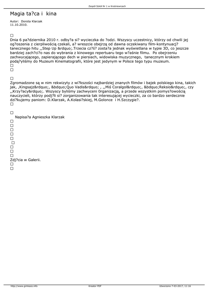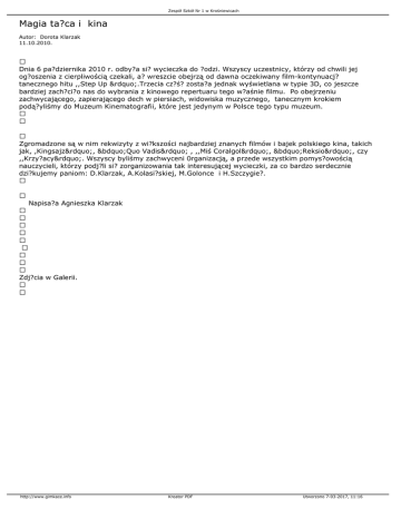 Zespół Szkół Nr 1 w Krośniewicach Magia ta?ca i kina Autor: Dorota Klarzak 11.10.2010. Dnia 6 pa?dziernika 2010 r. odby?a si? wycieczka do ?odzi. Wszyscy uczestnicy, którzy od chwili jej og?oszenia z cierpliwością czekali, a? wreszcie obejrzą od dawna oczekiwany film-kontynuacj? tanecznego hitu ,,Step Up ”.Trzecia cz?ś? zosta?a jednak wyświetlana w typie 3D, co jeszcze bardziej zach?ci?o nas do wybrania z kinowego repertuaru tego w?aśnie filmu. Po obejrzeniu zachwycającego, zapierającego dech w piersiach, widowiska muzycznego, tanecznym krokiem podą?yliśmy do Muzeum Kinematografii, które jest jedynym w Polsce tego typu muzeum. Zgromadzone są w nim rekwizyty z wi?kszości najbardziej znanych filmów i bajek polskiego kina, takich jak, ,Kingsajz”, „Quo Vadis” , ,,Miś Coralgol”, „Reksio”, czy ,,Krzy?acy”. Wszyscy byliśmy zachwyceni 0rganizacją, a przede wszystkim pomys?owością nauczycieli, którzy podj?li si? zorganizowania tak interesującej wycieczki, za co bardzo serdecznie dzi?kujemy paniom: D.Klarzak, A.Kolasi?skiej, M.Golonce i H.Szczygie?. Napisa?a Agnieszka Klarzak Zdj?cia w Galerii. http://www.gimkace.info Kreator PDF Utworzono 7-03-2017, 11:16