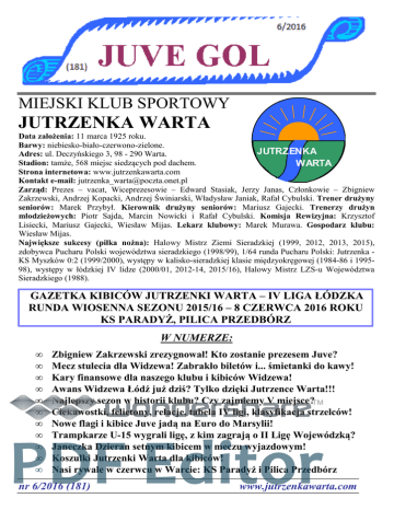 MIEJSKI KLUB SPORTOWY JUTRZENKA WARTA Data założenia: 11 marca 1925 roku. Barwy: niebiesko-biało-czerwono-zielone. JUTRZENKA Adres: ul. Deczyńskiego 3, 98 - 290 Warta. Stadion: tamże, 568 miejsc siedzących pod dachem. WARTA Strona internetowa: www.jutrzenkawarta.com Kontakt e-mail: [email protected] Zarząd: Prezes – vacat, Wiceprezesowie – Edward Stasiak, Jerzy Janas, Członkowie – Zbigniew Zakrzewski, Andrzej Kopacki, Andrzej Świniarski, Władysław Janiak, Rafał Cybulski. Trener drużyny seniorów: Marek Przybył. Kierownik drużyny seniorów: Mariusz Gajecki. Trenerzy drużyn młodzieżowych: Piotr Sajda, Marcin Nowicki i Rafał Cybulski. Komisja Rewizyjna: Krzysztof Lisiecki, Mariusz Gajecki, Wiesław Mijas. Lekarz klubowy: Marek Murawa. Gospodarz klubu: Wiesław Mijas. Największe sukcesy (piłka nożna): Halowy Mistrz Ziemi Sieradzkiej (1999, 2012, 2013, 2015), zdobywca Pucharu Polski województwa sieradzkiego (1998/99), 1/64 runda Pucharu Polski: Jutrzenka KS Myszków 0:2 (1999/2000), występy w kalisko-sieradzkiej klasie międzyokręgowej (1984-86 i 199598), występy w łódzkiej IV lidze (2000/01, 2012-14, 2015/16), Halowy Mistrz LZS-u Województwa Sieradzkiego (1988). GAZETKA KIBICÓW JUTRZENKI WARTA – IV LIGA ŁÓDZKA RUNDA WIOSENNA SEZONU 2015/16 – 8 CZERWCA 2016 ROKU KS PARADYŻ, PILICA PRZEDBÓRZ W NUMERZE: • • • • • • • • • • • Zbigniew Zakrzewski zrezygnował! Kto zostanie prezesem Juve? Mecz stulecia dla Widzewa! Zabrakło biletów i... śmietanki do kawy! Kary finansowe dla naszego klubu i kibiców Widzewa! Awans Widzewa Łódź już dziś? Tylko dzięki Jutrzence Warta!!! Najlepszy sezon w historii klubu? Czy zajmiemy V miejsce?TM Ciekawostki, felietony, relacje, tabela IV ligi, klasyfikacja strzelców! Nowe flagi i kibice Juve jadą na Euro do Marsylii! Trampkarze U-15 wygrali ligę, z kim zagrają o II Ligę Wojewódzką? Janeczka Dzieran setnym kibicem w meczu wyjazdowym! Koszulki Jutrzenki Warta dla kibiców! Nasi rywale w czerwcu w Warcie: KS Paradyż i Pilica Przedbórz PDF Editor nr 6/2016 (181) www.jutrzenkawarta.com Wywiad z reprezentantem Polski na Euro 2016 - Mariuszem Stępińskim „Na Euro liczy się każdy kolejny mecz” 10 czerwca we Francji rozpoczną się Mistrzostwa się bardziej skupił niż na celach długofalowych. Bo Europy w piłce nożnej. Dwa dni później swój jeżeli się nie skupiasz na tym przez co musisz pierwszy mecz rozegra Polska, a być może szansę przejść w tej dłuższej perspektywie, to gdzieś ci występu otrzyma „nasz człowiek”, czyli Mariusz mogą te marzenia uciekać. Dlatego rozsądniejszym Stępiński. Zawodnik, który piłkarskiego abecadła rozwiązaniem jest właśnie ta metoda patrzenia na uczył się w nieodległej od Warty - Kamiennej i w każdy kolejny mecz. Piaście Błaszki, a i występował w Widzewie Łódź, Czujesz się już pełnoprawnym reprezentantem? znalazł się bowiem w 23-osobowej kadrze Jesteś prawie najmłodszy, dają Ci to odczuć? reprezentacji Polski. Nam opowiada o swoich - W moim „przedziale wiekowym” są jeszcze Karol Linetty, Bartosz Kapustka i każdy z nas może czuć odczuciach przed tym turniejem. Długi: Przeczytałaś, usłyszałeś swoje nazwisko się swobodnie w zespole i myślę, że to jest fajne, bo to gdzieś tam pozwala skupić się tylko na na liście i co sobie pomyślałeś? Mariusz Stępiński: Pracowałem na to cały sezon, treningach i pokazać pełnie swoich możliwości. Na choć na jego starcie nawet o tym nie marzyłem, że pewno mogę potwierdzić, że jest super atmosfera. znajdę się w tej ostatecznej kadrze. W połowie O miejsce w składzie rywalizujesz z takimi zmagań jednak zaczęły pojawiać się takie myśli, napastnikami jak Robert Lewandowski i dostrzegłem, że jest na to szansa. W końcu się Arkadiusz Milik. Lekko nie ma... udało i radość był ogromna. Staram się jednak - Na pewno nie jest łatwo, ale też cały czas podchodzić do tego najspokojniej jak się da, choć podkreślam, że ja podążam małymi kroczkami, ale też apetyt rośnie w miarę jedzenia. Bo wiem, że jest do przodu. Na ten moment ważne jest, że znalazłem kolejna praca do wykonania i przede mną kolejne się w tej kadrze i po kolei wykonuję swoją pracę. cele na których trzeba się skupić. Spokojnie i cierpliwie do tego podchodzę i skupiam się na swoich celach. Kiedy tak naprawdę uwierzyłeś, że jedziesz? - Tak naprawdę to przez długi okres czułem, że to A jak przyjmują Cię rywale do składu? Wielkie jest do osiągnięcia. Cały czas wierzyłem w to i gwiazdy czy normalni ludzie? starałem się podtrzymywać dobrą dyspozycję. Nie - Z Arkiem Milikiem graliśmy w kadrach zwątpiłem w to ani przez chwilę. Wiara cały czas młodzieżowych, znamy się też bardzo dobrze była, bo być musi. prywatnie i nie przesadzałbym z tymi „gwiazdami”. Jak myślisz co zadecydowało, że jedziesz właśnie Nie ma takiej osoby, która by się tak zachowywała. Wszyscy są normalni i funkcjonujemy jako jeden ty? - Ciężko powiedzieć, ale przede wszystkim team, jak koledzy. Mogę to porównać do Jutrzenki względy czysto sportowe. To jednak trener podjął Warta czy Piasta Błaszki. Bo tak samo jak w tych taką decyzję, a ja się o niej dowiedziałem. zespołach wszystko funkcjonuje tak samo w Co mówił Adam Nawałka o twojej roli w reprezentacji, rozmawiamy ze sobą normalnie, itp. drużynie? To z kim się najlepiej dogadujesz? - Wiadomo, że głównym kandydatem do gry w - Jakoś specjalnych podziałów nie ma. Wszyscy są ataku jest Robert Lewandowski. Ja muszę walczyć bardzo przyjaźni. Nie chce tutaj wymienić, każdy o to, żeby wchodzić z ławki na boisko, a potem zasługuje na dobrą opinię, przyjacielskiej osoby. Na pomagać chłopakom i będę robił wszystko, żeby tak przykład Thiago Cionek jest bardzo pozytywną właśnie się działo. Na pewno chciałbym wystąpić postacią. na tym turnieju. Pokaza