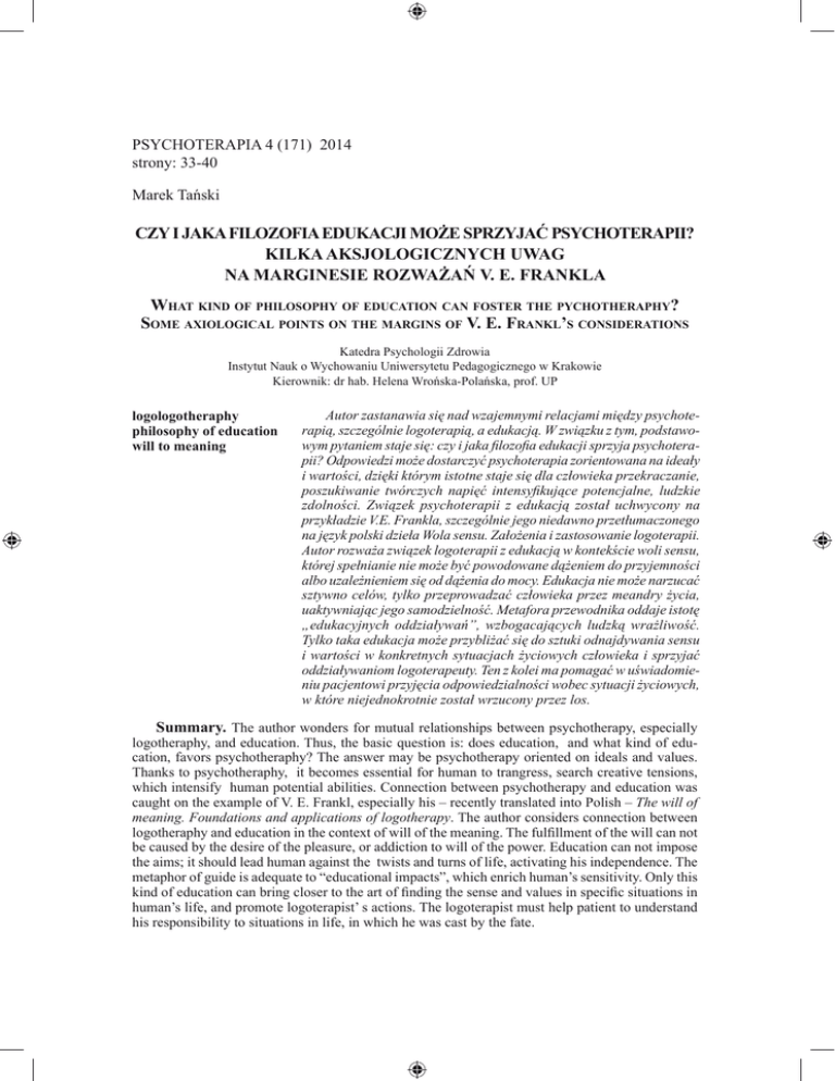 Psychoterapia 4 (171) 2014 strony: 33-40 Marek Tański Czy i jaka filozofia edukacji może sprzyjać psychoterapii? Kilka aksjologicznych uwag na marginesie rozważań V. E. Frankla What kind of philosophy of education can foster the pychotheraphy? Some axiological points on the margins of V. E. Frankl’s considerations Katedra Psychologii Zdrowia Instytut Nauk o Wychowaniu Uniwersytetu Pedagogicznego w Krakowie Kierownik: dr hab. Helena Wrońska-Polańska, prof. UP logologotheraphy philosophy of education will to meaning Autor zastanawia się nad wzajemnymi relacjami między psychoterapią, szczególnie logoterapią, a edukacją. W związku z tym, podstawowym pytaniem staje się: czy i jaka filozofia edukacji sprzyja psychoterapii? Odpowiedzi może dostarczyć psychoterapia zorientowana na ideały i wartości, dzięki którym istotne staje się dla człowieka przekraczanie, poszukiwanie twórczych napięć intensyfikujące potencjalne, ludzkie zdolności. Związek psychoterapii z edukacją został uchwycony na przykładzie V.E. Frankla, szczególnie jego niedawno przetłumaczonego na język polski dzieła Wola sensu. Założenia i zastosowanie logoterapii. Autor rozważa związek logoterapii z edukacją w kontekście woli sensu, której spełnianie nie może być powodowane dążeniem do przyjemności albo uzależnieniem się od dążenia do mocy. Edukacja nie może narzucać sztywno celów, tylko przeprowadzać człowieka przez meandry życia, uaktywniając jego samodzielność. Metafora przewodnika oddaje istotę „edukacyjnych oddziaływań”, wzbogacających ludzką wrażliwość. Tylko taka edukacja może przybliżać się do sztuki odnajdywania sensu i wartości w konkretnych sytuacjach życiowych człowieka i sprzyjać oddziaływaniom logoterapeuty. Ten z kolei ma pomagać w uświadomieniu pacjentowi przyjęcia odpowiedzialności wobec sytuacji życiowych, w które niejednokrotnie został wrzucony przez los. Summary. The author wonders for mutual relationships between psychotherapy, especially logotheraphy, and education. Thus, the basic question is: does education, and what kind of education, favors psychotheraphy? The answer may be psychotherapy oriented on ideals and values. Thanks to psychotheraphy, it becomes essential for human to trangress, search creative tensions, which intensify human potential abilities. Connection between psychotherapy and education was caught on the example of V. E. Frankl, especially his – recently translated into Polish – The will of meaning. Foundations and applications of logotherapy. The author considers connection between logotheraphy and education in the context of will of the meaning. The fulfillment of the will can not be caused by the desire of the pleasure, or addiction to will of the power. Education can not impose the aims; it should lead human against the twists and turns of life, activating his independence. The metaphor of guide is adequate to “educational impacts”, which enrich human’s sensitivity. Only this kind of education can bring closer to the art of finding the sense and values in specific situations in human’s life, and promote logoterapist’ s actions. The logoterapist must help patient to understand his responsibility to situations in life, in which he was cast by the fate. 34 Marek Tański Pytania wstępne Viktor Emil Frankl, twórca trzeciej szkoły psychoterapii (logoterapii), w przetłumaczonym na język polski dziele The will to meaning. Foundation and applications of logotherapy [Wola sensu. Założenia i zastosowanie logoterapii] [1] zmierza do odpowiedzi m.in. na pytanie: czy i jaka edukacja sprzyja psychoterapii? Pragnie uchwycić, a jednocześnie pokazać zależności między edukacją, która nie tylko funkcjonalnie, ale także źródłowo łączy się z aksjologią, a psychoterapią. Te relacje są istotne z badawczego punktu widzenia. Metoda fenomenologiczna, jaką posłużył się Frankl w tym dziele, wskazuje w języku naukowym, w jaki sposób zwykły człowiek z ulicy doświadcza sensów i wartości. Edukacja powinna uwzględniać prawdziwą naturę ludzkiego bytu przedstawiając ją na tle całości, w kontekście zbiorowości tworzącej kulturę. Redukowanie natury człowieka do poziomu niższego (biologicznego, psychologicznego, pedagogicznego czy socjologicznego) powoduje niedostrzeżenie sensu konkretnego bytu, a także prowadzi do relatywizmu względem wartości. Stąd też mogą rodzić się pytania: „Jak radzić sobie z takim stanem rzeczy? Czy w obliczu redukcjonizmu możliwe jest ocalenie człowieczeństwa ludzkiej istoty? Czy w ostatecznym rozrachunku możliwe jest zachowanie jedności człowieka w obliczu pluralizmu nauk, gdy ów pluralizm stanowi żyzną glebę, na której wyrasta i kwitnie redukcjonizm?” [1, s. 35]. Nie dając sobie przyzwolenia na przyjęcie postawy nihilistycznej, oznaczającej relatywizm aksjologiczny w edukacji, w nauce, oraz dostrzegając problematykę sensu jako podstawową w ludzkim doświadczeniu, Frankl jest przekonany, iż może się wyłonić alternatywna perspektywa dla nauk o człowieku z jej paideią rozumianą jako idea człowieczeństwa, uwzględniającą nieco wyższy wymiar niż biologiczny, psychologiczny czy socjologiczny (chodzi o wymiar duchowy niezależny od uwarunkowań psychofizycznych), postulując przy tym porządek wartości trwałych, absolutnych. Z paideią koincyduje kalokagatia, oznaczająca ogólny ideał edukacji zogniskowany wokół trzech wartości: prawdy, dobra i piękna. Ten ideał edukacji oparty na kanonie greckim nie został podważony czy naruszony nawet pogłębioną krytyką podstaw aksjologii praktykowanej, która to krytyka rozkwitła w rozmaitych zresztą i niezależnych od siebie nurtach XIX- i XX-wiecznych refleksji o człowieku. Wystarczy tu chociażby wskazać na nietzscheanizm, marksizm, socjaldarwinizm, utylitaryzm czy freudyzm, o których wspomina Frankl. Przewartościowując wszystkie wartości myślici