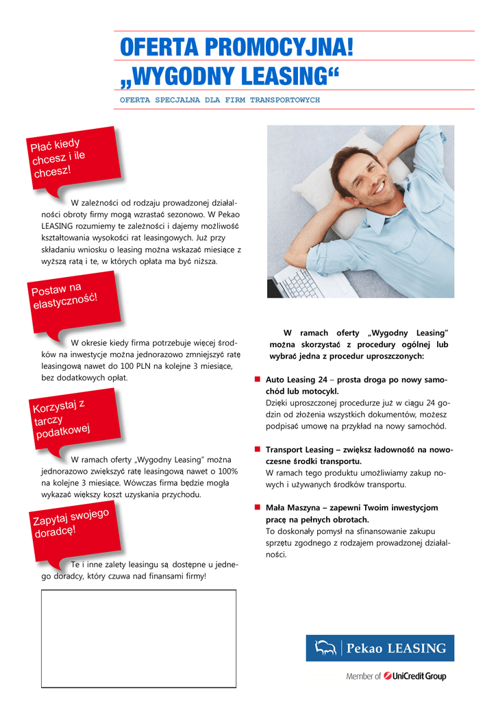 OFERTA PROMOCYJNA! „WYGODNY LEASING“ OFERTA SPECJALNA DLA FIRM TRANSPORTOWYCH y Pła. ć kied ile chcesz i chcesz! W zależności od rodzaju prowadzonej działalności obroty firmy mogą wzrastać sezonowo. W Pekao LEASING rozumiemy te zależności i dajemy możliwość kształtowania wysokości rat leasingowych. Już przy składaniu wniosku o leasing można wskazać miesiące z wyższą ratą i te, w których opłata ma być niższa. a Postaw n ć! noś elastycz W okresie kiedy firma potrzebuje więcej środków na inwestycje można jednorazowo zmniejszyć ratę leasingową nawet do 100 PLN na kolejne 3 miesiące, bez dodatkowych opłat. jz Korzysta tarczy ej podatkow W ramach oferty „Wygodny Leasing” można skorzystać z procedury ogólnej lub wybrać jedna z procedur uproszczonych: Auto Leasing 24 – prosta droga po nowy samochód lub motocykl. Dzięki uproszczonej procedurze już w ciągu 24 godzin od złożenia wszystkich dokumentów, możesz podpisać umowę na przykład na nowy samochód. Transport Leasing – zwiększ ładowność na nowoW ramach oferty „Wygodny Leasing” można jednorazowo zwiększyć ratę leasingową nawet o 100% na kolejne 3 miesiące. Wówczas firma będzie mogła wykazać większy koszt uzyskania przychodu. wojego Zapytaj s doradcę! Te i inne zalety leasingu są dostępne u jednego doradcy, który czuwa nad finansami firmy! czesne środki transportu. W ramach tego produktu umożliwiamy zakup nowych i używanych środków transportu. Mała Maszyna – zapewni Twoim inwestycjom pracę na pełnych obrotach. To doskonały pomysł na sfinansowanie zakupu sprzętu zgodnego z rodzajem prowadzonej działalności.