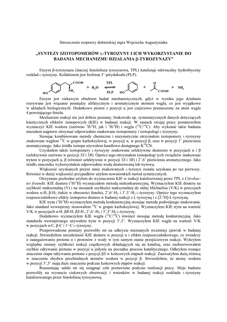 Streszczenie rozprawy doktorskiej mgra Wojciecha Augustyniaka „SYNTEZY IZOTOPOMERÓW L-TYROZYNY I ICH WYKORZYSTANIE DO BADANIA MECHANIZMU DZIAŁANIA β-TYROZYNAZY” Enzym β-tyrozynaza (inaczej fenololiaza tyrozynowa, TPL) katalizuje odwracalny hydrolityczny rozkład L-tyrozyny. Kofaktorem jest fosforan 5’-pirydoksalu (PLP). TPL CO OH HO NH2 + H2O PLP + HO O COOH + NH3 Enzym jest ciekawym obiektem badań mechanistycznych, gdyż w wyniku jego działania rozrywane jest wiązanie pomiędzy alifatycznym i aromatycznym atomem węgla, co jest wyjątkowe w układach biologicznych. Dodatkowo proton z pozycji α jest częściowo przenoszony na atom węgla 4 powstającego fenolu. Mechanizm reakcji nie jest dobrze poznany, brakowało np. systematycznych danych dotyczących kinetycznych efektów izotopowych (KIE) w badanej reakcji. W ramach swojej pracy postanowiłem wyznaczyć KIE wodoru (zarówno 1H/2H, jak i 1H/3H) i węgla (12C/14C). Aby wykonać takie badania musiałem najpierw otrzymać odpowiednio znakowane izotopomery i izotopologi L-tyrozyny. Stosując kombinowane metody chemiczne i enzymatyczne otrzymałem izotopomery L-tyrozyny znakowane węglem 14C w grupie karboksylowej, w pozycji α, w pozycji β, oraz w pozycji 1’ pierścienia aromatycznego. Jako źródła izotopu używałem handlowo dostępnego K14CN. Uzyskałem także izotopomery L-tyrozyny znakowane selektywnie deuterem w pozycjach α i β (selektywnie zarówno w pozycji 3S i 3R). Oprócz tego otrzymałem izotopologi tych związków znakowane trytem w pozycjach α, β (również selektywnie w pozycji 3S i 3R) i 2’,6’ pierścienia aromatycznego. Jako źródło znacznika wykorzystałem odpowiednio wodę deuterowaną lub trytową. Większość uzyskanych przeze mnie znakowanych L-tyrozyn została uzyskana po raz pierwszy. Również w dużej większości przypadków użyłem nowatorskich metod syntetycznych. Otrzymane pochodne użyłem do wyznaczenia KIE w reakcji katalizowanej przez TPL z Citrobacter freundii. KIE deuteru (1H/2H) wyznaczałem metodą niekonkurencyjną. Wyznaczyłem KIE deuteru na szybkość maksymalną (V) i na stosunek szybkości maksymalnej do stałej Michaelisa (V/K) w pozycjach wodoru α-H, β-H2 (także w obecności fenolu), 2’,6’-H2 i 3’,5’-H2 L-tyrozyny. Oprócz tego wyznaczyłem rozpuszczalnikowe efekty izotopowe deuteru w badanej reakcji z L-tyrozyną i z [2-2H]-L-tyrozyną. KIE trytu (1H/3H) wyznaczyłem metodą konkurencyjną stosując metodę podwójnego znakowania. Jako standard wewnętrzny stosowałem 14C w grupie karboksylowej. Wyznaczyłem KIE trytu na wartość V/K w pozycjach α-H, βR-H, βS-H , 2’,6’-H2 i 3’,5’-H2 L-tyrozyny. Dodatkowo wyznaczyłem KIE węgla (12C/14C) również stosując metodę konkurencyjną. Jako standardu wewnętrznego używałem trytu w pozycji 3’,5’. Wyznaczyłem KIE węgla na wartość V/K w pozycjach α-C, β-C i 1’-C L-tyrozyny. Przeprowadzone pomiary pozwoliły mi na odkrycie nieznanych wcześniej zjawisk w badanej reakcji. Stwierdziłem niezależność KIE deuteru w pozycji α i efektu rozpuszczalnikowego, co świadczy o zaangażowaniu protonu α i protonów z wody w tym samym stanie przejściowym reakcji. Wykryłem względne zmiany szybkości reakcji cząstkowych składających się na katalizę, oraz zaobserwowałem szybkie odrywanie protonu w pozycji α jedynie na początku procesu katalitycznego. Odkryłem rosnące znaczenie etapu odrywania protonu z pozycji βS w końcowych etapach reakcji. Zauważyłem dużą różnicę w znaczeniu obydwu prochiralnych atomów wodoru w pozycji β. Stwierdziłem, że atomy wodoru w pozycji 3’,5’ mają duże znaczenie podczas końcowych etapów reakcji. Reasumując udało mi się osiągnąć cele postawione podczas realizacji pracy. Moje badania pozwoliły na wysnucie ciekawych obserwacji i wniosków w badanej reakcji rozkładu L-tyrozyny katalizowanego przez fenololiazę tyrozynową.