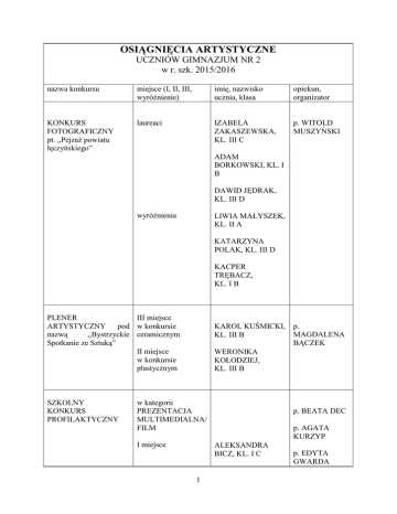 OSIĄGNIĘCIA ARTYSTYCZNE UCZNIÓW GIMNAZJUM NR 2 w r. szk. 2015/2016 nazwa konkursu miejsce (I, II, III, wyróżnienie) imię, nazwisko ucznia, klasa opiekun, organizator KONKURS FOTOGRAFICZNY pt. „Pejzaż powiatu łęczyńskiego” laureaci IZABELA ZAKASZEWSKA, KL. III C p. WITOLD MUSZYŃSKI ADAM BORKOWSKI, KL. I B DAWID JĘDRAK, KL. III D wyróżnienia LIWIA MAŁYSZEK, KL. II A KATARZYNA POLAK, KL. III D KACPER TRĘBACZ, KL. I B PLENER III miejsce ARTYSTYCZNY pod w konkursie nazwą ,,Bystrzyckie ceramicznym Spotkanie ze Sztuką” II miejsce w konkursie plastycznym SZKOLNY KONKURS PROFILAKTYCZNY KAROL KUŚMICKI, KL. III B p. MAGDALENA BĄCZEK WERONIKA KOŁODZIEJ, KL. III B w kategorii PREZENTACJA MULTIMEDIALNA/ FILM I miejsce p. BEATA DEC p. AGATA KURZYP ALEKSANDRA BICZ, KL. I C 1 p. EDYTA GWARDA AGATA GAJOWIAK, KL. I C MARTA WINIARSKA, KL. I C II miejsce NIKOLA WOŹNIAK, KL. I C III miejsce JULIA DRABIK, KL. II A WERONIKA STADNIK, KL. IIC w kategorii PLAKAT KLAUDIA KUDŁA, KL. II D I miejsce KLAUDIA SIKORA, KL. III A II miejsce ALEKSANDRA BICZ, KL. I C NATALIA MITRUS, KL. I C ANITA WOJCIECHOWSKA, KL. I C III miejsce AGATA GAJOWIAK, KL. I C KONKURS PREZENTACJI I miejsce MULTIMEDIALNYCH „Portret VIP-a z krajów niemieckojęzycznych” KLAUDIA SIKORA, KL. III A ANITA WOJCIECHOWSKA, 2 p. AGATA KURZYP KL. I C II miejsce JAKUB KIEPURA, KL. II A KRYSTIAN ZAKRZEWSKI, KL. II A III miejsce MATEUSZ WRZYSZCZ, KL. III C KONKURS MULTIMEDIALNY I miejsce w ramach obchodów Międzynarodowego Dnia Języka Ojczystego Kategoria: prezentacja multimedialna, film II miejsce NATALIA MITRUS, KL. I C Opiekunowie KLUBU YOLO: ALEKSANDRA WOŁOS, KL. I C p. BEATA DEC KAROL JAKUBCZYK, KL. II C ALEKSANDRA STĘPIEŃ, KL. I A WERONIKA DUKLEWSKA, KL. IIA KORNELIA ROPIAK, KL. IIA III miejsce NIKOLA WOŹNIAK, KL. I C WIKTORIA MAŁYSKA, KL. I C NATALIA USTRZYCKA, KL. I C 3 p. MONIKA OLSZEWSKA p. EDYTA GWARDA WERONIKA BAKUN, KL. II A EMILIA DRABIK, KL. II A JULIA DRABIK, KL. II A LIWIA MAŁYSZEK, KL. II A WERONIKA STADNIK, KL. II C KONKURS GEOGRAFICZNY „Planeta Ziemia-model przestrzenny” w ramach obchodów Międzynarodowego Dnia Ziemi I miejsce JAKUB STANKIEWICZ, KL. II A II miejsce ALEKSANDRA STĘPIEŃ, KL. I A JAKUB KIEPURA, KL. II A III miejsce KRYSTIAN ZAKRZEWSKI, KL. II A wyróżnienia ADAM PRZYSTUPA, KL. II B WOJCIECH BUDZYŁA, KL. III A WIKTORIA MAŁYSKA, KL. I C JULIA DĄBROWSKA, 4 p. ALICJA JARSZAK KL. I A NATALIA USTRZYCKA, KL. I C MARTYNA KORECKA, KL. III B WIKTORIA IKWANTY, KL. III B IZABELA KULIŃSKA, KL. III D KONKURS pt. „Książka artystyczna” ZUZANNA MALINOWSKA i WIKTORIA SZMERŁO – książka pt. „Lustro” I miejsce II miejsce MATEUSZ BOROWIEC i KAMIL KARAŚ książka pt. „Książka poszukiwanych” III miejsce WERONIKA DUKLEWSKA i KORNELIA ROPIAK - książka pt. „Alicja w Krainie Czarów” wyróżnienia ALEKSANDRA FALKIEWICZ, DARIA KOTOWICZ i ALEKSANDRA SAGAN - książka pt. „Świat” WIKTORIA ŁADYCKA - książka pt. „Na Lipę” WIKTORIA ŚLIWA 5 p. KATARZYNA JAGIEŁŁO - książka pt. „W świecie motyli” 6