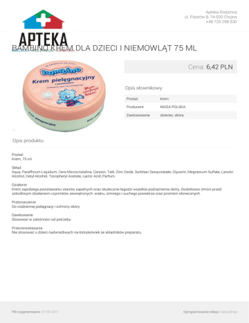 Apteka Rodzinna ul. Piastów 8, 74-500 Chojna +48 725 298 530 BAMBINO KREM DLA DZIECI I NIEMOWLĄT 75 ML Cena: 6,42 PLN Opis słownikowy Postać krem Producent NIVEA POLSKA Zastosowanie dziecko, skóra Opis produktu Postać Krem, 75 ml. Skład Aqua, Paraffinum Liquidum, Cera Microcristalina, Ceresin, Talk, Zinc Oxide, Sorbitan Sesquioleate, Glycerin, Megnesium Sulfate, Lanolin Alcohol, Cetyl Alcohol, Tocopheryl Acetate, Lactic Acid, Parfum. Działanie Krem zapobiega powstawaniu stanów zapalnych oraz skutecznie łagodzi wszelkie podrażnienia skóry. Dodatkowo chroni przed szkodliwym działaniem czynników zewnętrznych: wiatru, zimnego i suchego powietrza oraz promieni słonecznych. Przeznaczenie Do codziennej pielęgnacji i ochrony skóry. Dawkowanie Stosować w zależności od potrzeby. Przeciwwskazania Nie stosować u dzieci nadwrażliwych na którykolwiek ze składników preparatu. Plik wygenerowano: 07-03-2017 Powered by TCPDF (www.tcpdf.org) Oprogramowanie sklepu: AptusShop