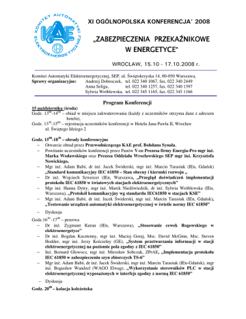 XI OGÓLNOPOLSKA KONFERENCJA’ 2008 „ZABEZPIECZENIA PRZEKAŹNIKOWE W ENERGETYCE” WROCŁAW, 15.10 - 17.10.2008 r. Komitet Automatyki Elektroenergetycznej, SEP, ul. Świętokrzyska 14, 00-050 Warszawa, Sprawy organizacyjne: Andrzej Dobroczek, tel. 022 340 1067, fax. 022 340 2449 Anna Seliga, tel. 022 340 1257, fax. 022 340 1397 Sylwia Wróblewska, tel. 022 345 1165, fax. 022 345 1166 Program Konferencji 15 października (środa) Godz. 1300-1400 – obiad w miejscu zakwaterowania (każdy z uczestników otrzyma dane z adresem hotelu), Godz. 1330-1500 – rejestracja uczestników konferencji w Hotelu Jana Pawła II, Wrocław ul. Świętego Idziego 2 Godz. 1500-1830 – obrady konferencyjne − Otwarcie obrad przez Przewodniczącego KAE prof. Bohdana Synala, − Powitanie uczestników konferencji przez Panów V-ce Prezesa firmy Energia-Pro mgr inż. Marka Wodawskiego oraz Prezesa Oddziału Wrocławskiego SEP mgr inż. Krzysztofa Nowickiego, − Mgr inż. Adam Babś, dr inż. Jacek Świderski, mgr inż. Marcin Tarasiuk (IEn, Gdańsk) „Standard komunikacyjny IEC 61850 – Stan obecny i kierunki rozwoju „ − Dr inż. Wojciech Szweicer (IEn, Warszawa, „Przegląd doświadczeń implementacji protokołu IEC 61850 w światowych stacjach elektroenergetycznych” − Mgr inż. Hanna Dytry, mgr inż. Marek Niedźwiedzik, dr inż. Sylwia Wróblewska (IEn, Warszawa), „Protokół komunikacyjny wg standardu IEC61850 w stacjach KSE” − Mgr inż. Adam Babś, dr inż. Jacek Świderski, mgr inż. Marcin Tarasiuk (IEn, Gdańsk), „Testowanie urządzeń automatyki elektroenergetycznej w świetle normy IEC 61850” − Dyskusja Godz.1630 -1700 – przerwa − Dr inż. Zygmunt Kuran (IEn, Warszawa), „Stosowanie cewek Rogowskiego w elektroenergetyce” − Dr inż. Bogdan Kasztenny, mgr inż. Maciej Goraj, Msc. David McGinn, Msc. Steven Hodder, mgr inż. Jerzy Kościelny (GE), „System przetwarzania informacji w stacji elektroenergetycznej na poziomie pola zgodny z IEC 61850” − Inż. Bernard Głowocz, mgr inż. Mirosław Sobczak, ZPrAE, „Implementacja protokołu IEC 61850 w zabezpieczeniu szyn zbiorczych TS-6” − Mgr inż. Adam Babś, dr inż. Jacek Świderski, mgr inż. Marcin Tarasiuk (IEn-Gdańsk), mgr inż. Bogusław Wandzel (WAGO Elwag), „Wykorzystanie sterowników PLC w stacji elektroenergetycznej wyposażonych w interfejs zgodny z normą IEC 61850” − Dyskusja Godz. 2000 – kolacja koleżeńska 16 października (czwartek) Godz. 800-845 – śniadanie Wyjazd do Świebodzic – autokary będą czekały na uczestników pod hotelem Transport do Świebodzic w trzech grupach po około 50 osób: Godz. 800 – odjazd pierwszego autokaru do Świebodzic Godz. 830. – odjazd drugiego autokaru do Świebodzic Godz. 900 – odjazd trzeciego autokaru do Świebodzic Zwiedzanie fabryki w Świebodzicach w trzech grupach: Godz. 930 – 1015 – zwiedzanie fabryki AREVA w Świebodzicach – grupa I Godz. 1000 – 1045 – zwiedzanie fabryki AREVA w Świebodzicach – grupa II Godz. 1030 – 1115 – zwiedzanie fabryki AREVA w Świebodzicach – grupa III Odjazd autokarem do Zamku Książ w trzech grupach: Godz. 1020 – odjazd I grupy do Zamku Książ Godz. 1050 – odjazd II grupy do Zamku Książ Godz. 1120 – odjazd III grupy do Zamku Książ Zwiedzanie zamku w grupach trasą „Śladami Hitlera”: Godz. 1030 – 1200 – zwiedzanie Zamku I grupa Godz. 1100– 1230 – zwiedzanie Zamku II grupa Godz. 1130 – 1300 – zwiedzanie Zamku III grupa Godz. 1330 – 1445 – obiad na sali balowej Zamku Godz. 1500 – 1830 – obrady konferencyjne − Powitanie gości przez Dyrektora firmy AREVA Pana mgr inż. Sławomira Wiśniewskiego − Mgr inż. Krzysztof Kulski (AREVA – Świebodzice), „Standard komunikacyjny IEC61850” − Mgr inż. Bogusław Wilczyński (AREVA – Świebodzice), „Niekonwencjonalne przekładniki pomiarowe (NCIT) w zabezpieczeniach AREVA serii MICOM P40” − Dr hab. inż. Jan Iżykowski, Prof. dr hab. inż. Eugeniusz Rosołowski, Mgr inż. Marcin Bożek, (Politechnika Wrocławska, Instytut Energoelektryki), „Lokalizacja zwarć i zabezpieczenie odległościowe przy stosowaniu kompletnych pomiarów z jednego końca linii dwutorowej” − Mgr inż. Andrzej Fulczyk, (Energoprojekt – Katowice), „Zabezpieczenia elektroenergetyczne bloku o mocy 460 MW w El. Łagisza” Godz. 1630 – 1700 - przerwa − Mgr inż. Zdzisław Kołodziejczyk, (ITR, Warszawa), „Zdalna kontrola cyfrowych zabezpieczeń elektroenergetycznych w trakcie eksploatacji” − Mgr inż. Maciej Sałasiński, mgr inż. Jarosław Mielczarek (BPiU PRO-MAC), „Automatyczne systemy nadzoru izolacji sposobem na zwiększanie niezawodności i bezpieczeństwa” − Mgr inż. Jacek Floryn, Mgr inż. Zdzisław Koszkul (Energia-Pro), „Przyłączenie rozproszonych źródeł wytwórczych do sieci dystrybucyjne WN i SN w aspekcie wymagań stawianych elektroenergetycznej automatyce zabezpieczeniowej" Godz. 1900 – kolacja w postaci bufetu szwedzkiego w sali balowej Zamku Książ Godz. 20 - 2100 – powrót autokarem do Wrocławia 17 października (piątek) Godz. 800-845 – śniadanie Godz. 900-1000 – obrady konferencyjne − Podsumowanie seminarium, Zamknięcie obrad przez Przewodniczącego KAE prof. Bohdana Synala Godz. 1015 – 1300 – zwiedzanie centrum Wrocławia i Panoramy Racławickiej, Godz. 1330 – obiad.