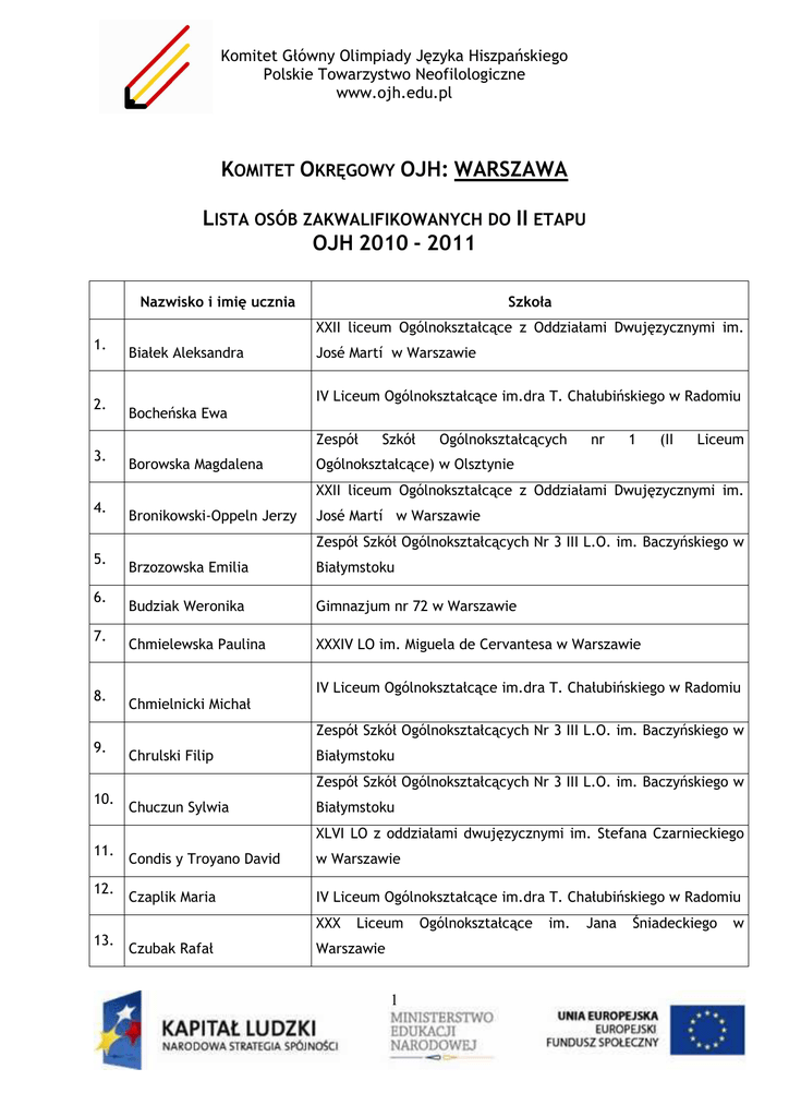 Lista uczestników zakwalifikowanych do II Etapu OJH