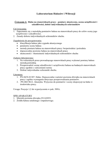 Laboratorium Hałasów i Wibracji Ćwiczenie 2: Hałas na stanowiskach pracy - pomiary akustyczne, ocena uciążliwości i szkodliwości, dobór indywidualnych ochronników Cel ćwiczenia: 1. Zapoznanie się z metodyką pomiarów hałasu na stanowiskach pracy do celów oceny jego uciążliwości i szkodliwości. 2. Zasady doboru indywidualnych ochronników słuchu. Zagadnienia do przygotowania: klasyfikacja hałasu jako sygnału akustycznego parametry oceny hałasu metody pomiaru hałasu na stanowiskach pracy: bezpośrednia i pośrednia dopuszczalne poziomy hałasu na stanowiskach pracy skuteczność i tłumienność indywidualnych ochronników słuchu Zadania laboratoryjne: 1. Na wskazanych przez prowadzącego stanowiskach pracy wykonać pomiary hałasu metodą pośrednią 2. Przeprowadzić ocenę szkodliwości i uciążliwości hałasu na badanych stanowiskach pracy zgodnie z zaleceniami normy 3. Dobrać indywidualne ochronniki słuchu. Literatura: 1. PN-84/N-01307. Hałas. Dopuszczalne wartości poziomu dźwięku na stanowiskach pracy i ogólne wymagania dotyczące przeprowadzania pomiarów. 2. PN-ISO 9612. Akustyka. Wytyczne do pomiarów i oceny ekspozycji na hałas w środowisku pracy. Uwaga: Pozycje 1,2 do wypożyczenia w pok. 509A. SPIS APARATURY 1. Miernik poziomu dźwięku SVAN955. 2. Źródła hałasu ustalonego i impulsowego.