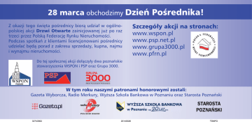 28 marca obchodzimy Dzień Pośrednika! Z okazji tego święta pośrednicy biorą udział w ogólnopolskiej akcji Drzwi Otwarte zainicjowanej już po raz trzeci przez Polską Federację Rynku Nieruchomości. Podczas spotkań z klientami licencjonowani pośrednicy udzielać będą porad z zakresu sprzedaży, kupna, najmu i wynajmu nieruchomości. Szczegóły akcji na stronach: www.wspon.pl www.psp.net.pl www.grupa3000.pl www.pfrn.pl Do tej społecznej akcji dołączyły dwa poznańskie stowarzyszenia WSPON i PSP oraz Grupa 3000. W tym roku naszymi patronami honorowymi zostali: Gazeta Wyborcza, Radio Merkury, Wyższa Szkoła Bankowa w Poznaniu oraz Starosta Poznański STAROSTA POZNAŃSKI 32743562 20140326 TDNPO