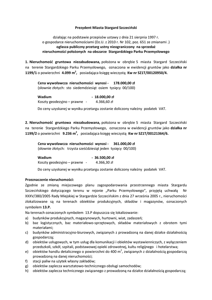 Prezydent Miasta Stargard Szczeciński działając na podstawie przepisów ustawy z dnia 21 sierpnia 1997 r. o gospodarce nieruchomościami (Dz.U. z 2010 r. Nr 102, poz. 651 ze zmianami .) ogłasza publiczny przetarg ustny nieograniczony na sprzedaż nieruchomości położonych na obszarze Stargardzkiego Parku Przemysłowego 1. Nieruchomość gruntowa niezabudowana, położona w obrębie 5 miasta Stargard Szczeciński na terenie Stargardzkiego Parku Przemysłowego, oznaczona w ewidencji gruntów jako działka nr 1199/1 o powierzchni 4.099 m2, posiadająca księgę wieczystą Kw nr SZ1T/00120950/4. Cena wywoławcza nieruchomości wynosi - 178.000,00 zł (słownie złotych: sto siedemdziesiąt osiem tysięcy 00/100) Wadium Koszty geodezyjno – prawne - - 18.000,00 zł 4.366,60 zł Do ceny uzyskanej w wyniku przetargu zostanie doliczony należny podatek VAT. 2. Nieruchomość gruntowa niezabudowana, położona w obrębie 5 miasta Stargard Szczeciński na terenie Stargardzkiego Parku Przemysłowego, oznaczona w ewidencji gruntów jako działka nr 1199/2 o powierzchni 9.236 m2, posiadająca księgę wieczystą Kw nr SZ1T/00121364/6. Cena wywoławcza nieruchomości wynosi - 361.000,00 zł (słownie złotych: trzysta sześćdziesiąt jeden tysięcy 00/100) Wadium Koszty geodezyjno – prawne - - 36.500,00 zł 4.366,30 zł Do ceny uzyskanej w wyniku przetargu zostanie doliczony należny podatek VAT. Przeznaczenie nieruchomości: Zgodnie ze zmianą miejscowego planu zagospodarowania przestrzennego miasta Stargardu Szczecińskiego dotyczącego terenu w rejonie „Parku Przemysłowego”, przyjętą uchwałą Nr XXXV/380/2005 Rady Miejskiej w Stargardzie Szczecińskim z dnia 27 września 2005 r., nieruchomości zlokalizowane są na terenach obiektów produkcyjnych, składów i magazynów, oznaczonych symbolem 13.P. Na terenach oznaczonych symbolem 13.P dopuszcza się lokalizowanie: a) budynków produkcyjnych, magazynowych, hurtowni, wiat, zadaszeń; b) baz logistycznych, baz materiałowo-sprzętowych, składów materiałowych z obrotem tymi materiałami; c) budynków administracyjno-biurowych, związanych z prowadzoną na danej działce działalnością gospodarczą; d) obiektów usługowych, w tym usług dla komunikacji i obiektów wystawienniczych, z wyłączeniem przedszkoli, szkół, szpitali, podstawowej opieki zdrowotnej, kultu religijnego i hotelarstwa; e) obiektów handlu detalicznego o powierzchni do 400 m2, związanych z działalnością gospodarczą prowadzoną na danej nieruchomości; f) stacji paliw na użytek własny zakładów; g) obiektów zaplecza warsztatowo-technicznego obsługi samochodów; h) obiektów zaplecza technicznego związanego z prowadzoną na działce działalnością gospodarczą; i) zespołów garaży, w tym dla samochodów ciężarowych oraz parkingów dla samochodów osobowych i ciężarowych dla własnych potrzeb; j) urządzeń i sieci infrastruktury technicznej niezbędnych dla funkcjonowania tych budynków i obiektów. Dopuszcza się lokalizowanie reklam, masztów z flagami i pylonów oraz wydzielanie w obiektach związanych z prowadzoną działalnością do dwóch mieszkań służbowych. Zakazuje się lokalizowania: a) przedsięwzięć powodujących przekroczenie standardów jakości środowiska poza granicami terenu, do którego inwestor ma tytuł prawny; b) przedsięwzięć szczególnie uciążliwych dla środowiska, wymagających obligatoryjnie sporządzenia raportu o oddziaływaniu na środowisko; c) budynków mieszkalnych. Zakazuje się przeznaczania na cele zabudowy powierzchni większej niż 80 % powierzchni działki budowlanej oraz sytuowania budynków wyższych niż 18 m. Nakazuje się przeznaczenie na cele powierzchni terenu biologicznie czynnej nie mniej niż 20 % powierzchni działki budowlanej oraz sytuowanie budynków z uwzględnieniem: ustalonych linii zabudowy usytuowanych w odległości 8 m od linii rozgraniczających ulic. Dojazd do nieruchomości z ulicy Przemysłowej – lokalnej o symbolu 65 KDL poprzez projektowaną drogę gminną dojazdową o symbolu 72.KDD lub z ulicy Stralsundskiej – drogi gminnej, dojazdowej o symbolu 69.KDD poprzez projektowaną drogę gminną dojazdową o symbolu 72.KDD. Do czasu zagospodarowania pasa drogowego 72.KDD Inwestor we własnym zakresie i na własny koszt wykona dojazd do nieruchomości w uzgodnieniu z Wydziałem Inżynierii i Ochrony Środowiska Urzędu Miejskiego. Część działki 1199/2 zlokalizowana w strefie ograniczonej ochrony archeologicznej „W.III” stanowisko 106. Nieruchomości położone są na terenie, w rejonie którego zlokalizowane są sieci: wodociągowa, kanalizacyjna, elektryczna, gazowa. Projektowane sieci zgodnie z ww. planem zagospodarowania przestrzennego winny przebiegać w pasach drogowych 72.KDD i 73.KDD. Zasilenie inwestycji w energię elektryczną odbywać się będzie na koszt Inwestora, po spełnieniu wymogów określonych w warunkach przyłączenia przez gestora sieci tj. ENEA Operator Sp. z o.o. Podłączenie inwestycji do miejskiej sieci wodociągowej i kanalizacji sanitarnej odbywać się będzie na koszt własny Inwestora, po uzgodnieniu i uzyskaniu warunków technicznych w Zakładzie Wodociągów i Kanalizacji w Stargardzie Szczecińskim. Na przedmiotowym terenie brak jest kanalizacji deszczowej. Z uwagi na brak badań geologicznych w zakresie wód gruntowych oraz pochłaniania przez teren wód opadowych Inwestor zobowiązany będzie, we własnym zakresie i na własny koszt opracować i wykonać stosowne rozwiązania projektowo – wykonawcze w zakresie odprowadzania tych wód, bez negatywnego wpływu na nieruchomości sąsiednie, z zachowaniem postanowień prawa wodnego. Przyłączenie planowanych na nieruchomościach obiektów do gazociągu średniego ciśnienia dn 125 PE ułożonego w ul. Przemysłowej, wiąże się z koniecznością rozbudowy sieci gazowej średniego ciśnienia. Podłączenie do sieci odbywać się będzie na koszt własny Inwestora, po speł