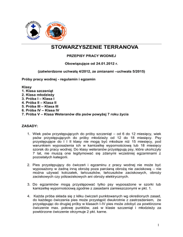 STOWARZYSZENIE TERRANOVA PRZEPISY PRACY WODNEJ Obowiązujące od 24.01.2012 r. (zatwierdzone uchwałą 4/2012, ze zmianami –uchwała 5/2015) Próby pracy wodnej - regulamin i egzamin Klasy 1. Klasa szczeniąt 2. Klasa młodzieży 3. Próba I – Klasa I 4. Próba II – Klasa II 5. Próba III – Klasa III 6. Próba IV – Klasa IV 7. Próba V – Klasa Weteranów dla psów powyżej 7 roku życia ZASADY: 1. Wiek psów przystępujących do próby szczeniąt – od 6 do 12 miesięcy, wiek psów przystępujących do próby młodzieży od 12 do 18 miesięcy. Psy przystępujące do I I II klasy nie mogą być młodsze niż 15 miesięcy, pod warunkiem wyposażenia ich w kamizelkę wypornościową lub 18 miesięcy szorek do pracy wodnej. Do klasy weteranów przystępują psy, które ukończyły 7 lat, nie muszą one legitymować się zdanymi wcześniej egzaminami z pozostałych kategorii. 2. Pies przystępujący do ćwiczeń i egzaminu z pracy wodnej nie może być wyposażony w żadną inną obrożę poza parcianą obrożą nie zaciskową – nie można używać kolczatek, łańcuszków, łańcuszków zaciskowych, obroży zaciskowych czy półzaciskowych ani obroży elektrycznych. 3. Do egzaminów mogą przystępować tylko psy wyposażone w szorki lub kamizelkę wypornościową zgodnie z zasadami zamieszczonymi w pkt. 1. 4. Każda próba składa się z kilku ćwiczeń punktowanych wg określonych zasad, do każdego ćwiczenia pies może przystąpić dwukrotnie z zastrzeżeniem, że przystępując do drugiej próby w klasach I-IV pies może zdobyć za powtórzone ćwiczenie max. połowę punktów, zaś w klasie szczeniąt i młodzieży za powtórzone ćwiczenie otrzymuje 2 pkt. karne. 1 5. Aby zdać egzamin kończący próbę należy uzyskać min. 65 punktów na 100 możliwych. 6. Pomyślne zdanie egzaminu kończącego jedną próbę jest warunkiem przystąpienia do kolejnej próby, z wyjątkiem prób klasy szczeniąt, młodzieży i weteranów, gdzie kryterium limitującym przystąpienie do tych klas jest osiągnięty wiek. Do klasy IV mogą przystąpić również psy które mają udokumentowane zaliczenie najwyższego stopnia klasyfikacji pracy wodnej w kraju innym niż Polska w klasie championów lub odpowiednio najwyższym stopniem z zakresu pracy wodnej i ukończyły 24 miesiąc . 7. Przed przystąpieniem do egzaminu przewodnik jest zobowiązany przekazać organizatorom książeczkę pracy psa. W przypadku jeśli takiej nie posiada, zobowiązany jest wykupić ją na miejscu. 8. Wyniki (również dyskwalifikacja) zostają odnotowane w książeczce psa i podpisane przez osobę do tego uprawnioną. 9. Przed przystąpieniem do egzaminu właściciel psa ma obowiązek dostarczyć świadectwo zdrowia psa oraz potwierdzenie zawarcia ubezpieczenia OC lub zobowiązanie, iż ponosi pełną odpowiedzialność również materialną za szkody wyrządzone przez swojego psa. 10. W terminie określonym przez organizatorów przewodnik psa zobowiązany jest do pisemnego zgłoszenia przystąpienia psa do certyfikacji oraz wniesienia opłaty egzaminacyjnej bez względu czy pies stawi się na certyfikacji czy nie. 11. Wniesienie opłaty egzaminacyjnej zniżkowej jest możliwe tylko dla członka Stowarzyszenia Terranova który opłacił składki członkowskie na bieżąco tj. przynajmniej do miesiąca włącznie w którym odbywa się certyfikacja. 12. Sędzia ma prawo dokonać zmian warunków podczas egzaminu w zależności od sytuacji; dotyczą one wszystkich psów przystępujących do danej klasy i obowiązują tylko podczas tego egzaminu. 13. Niedozwolone są wszelkie odwołania od decyzji sędziego. 14. Przed przystąpieniem do ćwiczeń z zakresu posłuszeństwa przewodnik zgłasza sędziemu, przy której nodze prowadzony będzie pies. Nie wolno zmieniać strony w trakcie trwania egzaminu. Za „pozycję zasadniczą” uważa się przewodnika z psem siedzącym przy jego prawej lub lewej nodze w zależności od strony, po której pracuje pies i która zostanie zgłoszona sędziemu. 15. Niedozwolone jest zmienianie przewodników podczas trwania egzaminu. Jedynie ten sam przewodnik może prowadzić psa podczas wszystkich ćwiczeń danej klasy, nie musi być nim właściciel psa, osoba ta musi być zgłoszona sekretarzowi przed przystąpieniem do certyfikacji. Użyte terminy: 2 DYSTANS – sumaryczna odległość jaką pies musi pokonać podczas danego ćwiczenia PRZEWODNIK – osoba prowadząca psa, która wydaje mu komendy, może lecz nie musi być nim właściciel POMOCNIK, POZORANT – osoba współpracująca w prawidłowym wykonaniu ćwiczenia, posiadająca określoną w przepisach rolę W każdym ćwiczeniu z użyciem łodzi łódź zawsze prowadzona jest przez sternika . UWAGA! W ćwiczeniach w których pies płynie równolegle obok przewodnika nie dopuszczalne jest aby człowiek był przez psa wyprzedzany, aby pies na niego napływał, lub odpływał na boki dalej niż na odległość 1 m. a przewodnik łapał za uprząż psa. Za powyższe uchybienia sędzia nalicza punkty karne. Dopuszczalne jest opływanie przewodnika przez psa podczas wspólnego pływania. Dozwolone jest opływanie przewodnika przez psa. Klasa szczeniąt (6-12 msc): Ćwiczenia składowe (max. ilość punktów do zdobycia) 1. 2. 3. 4. 5. Marsz przy nodze przewodnika na smyczy 15 pkt. Siadanie na rozkaz opiekuna 15 pkt. Warowanie na rozkaz opiekuna 15 pkt. Aportowanie przedmiotu z wody 25 pkt. Płynięcie do przewodnika w wodzie, odebranie aportu, powrót razem 30 pkt. Razem 100 pkt. Ćwiczenie 1. Przewodnik z psem zajmują pozycję zasadniczą w wyznaczonym miejscu. Na znak sędziego ruszają. Pies trzymany na luźnej smyczy powinien iść przy nodze przewodnika. Dystans 30 m, dwa zwroty pod kątem prostym. Dozwolone jest zachęcanie psa głosem do podążania za przewodnikiem. Niedozwolone jest podawanie psu pokarmu. 3 Ćwiczenie 2. Przewodnik zajmuje pozycję przed stojącym psem. Trzyma smycz w dłoni. Podaje psu komendę do siad