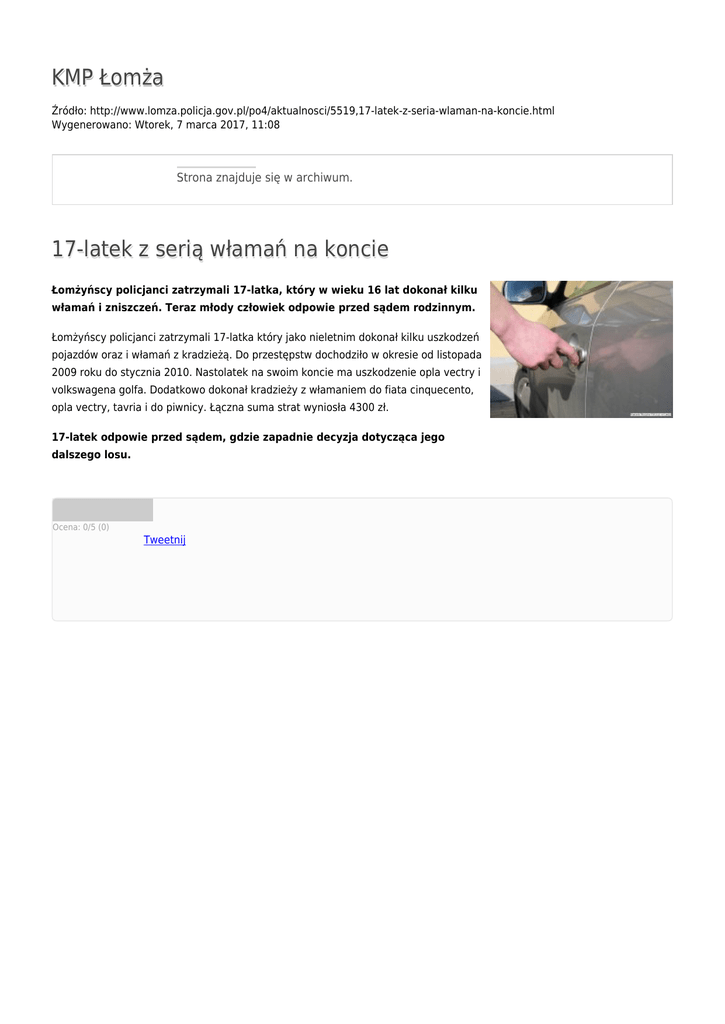 KMP Łomża Źródło: http://www.lomza.policja.gov.pl/po4/aktualnosci/5519,17-latek-z-seria-wlaman-na-koncie.html Wygenerowano: Wtorek, 7 marca 2017, 11:08 Strona znajduje się w archiwum. 17-latek z serią włamań na koncie Łomżyńscy policjanci zatrzymali 17-latka, który w wieku 16 lat dokonał kilku włamań i zniszczeń. Teraz młody człowiek odpowie przed sądem rodzinnym. Łomżyńscy policjanci zatrzymali 17-latka który jako nieletnim dokonał kilku uszkodzeń pojazdów oraz i włamań z kradzieżą. Do przestępstw dochodziło w okresie od listopada 2009 roku do stycznia 2010. Nastolatek na swoim koncie ma uszkodzenie opla vectry i volkswagena golfa. Dodatkowo dokonał kradzieży z włamaniem do fiata cinquecento, opla vectry, tavria i do piwnicy. Łączna suma strat wyniosła 4300 zł. 17-latek odpowie przed sądem, gdzie zapadnie decyzja dotycząca jego dalszego losu. Ocena: 0/5 (0) Tweetnij