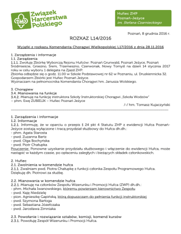 Hufiec ZHP Poznań-Jeżyce im. Stefana Czarnieckiego Poznań, 8 grudnia 2016 r. ROZKAZ L14/2016 Wyjątki z rozkazu Komendanta Chorągwi Wielkopolskiej L17/2016 z dnia 28.11.2016 1. Zarządzenia i informacje 1.1. Zarządzenia 1.1.1. Zwołuję Zbiórkę Wyborczą Rejonu Hufców: Poznań Grunwald, Poznań Jeżyce, Poznań Śródmieście, Gniezno, Śrem, Trzemeszno, Czerwonak, Nowy Tomyśl na dzień 14 stycznia 2017 roku w celu wyboru 1 delegata na Zjazd ZHP. Zbiórka odbędzie się o godz. 11.00 w Szkole Podstawowej nr 62 w Poznaniu, ul. Druskiennicka 32. Gospodarzem Zbiórki jest Hufiec Poznań Jeżyce. Wyznaczam na pełnomocnika Komendanta Chorągwi hm. Janusza Wolskiego. 3. Chorągiew 3.4. Mianowania na funkcje 3.4.2. Mianuję na funkcję instruktora Szkoły Instruktorskiej Chorągwi „Szkoła Wodzów” – phm. Ewę ZUBIELIK – Hufiec Poznań Jeżyce /-/ hm. Tomasz Kujaczyński __________________________________________________________________________________ 1. Zarządzenia i informacje 1.2. Informacje 1.2.1. Informuję, że w oparciu o przepis § 24 pkt 4 Statutu ZHP z ewidencji Hufca PoznańJeżyce zostają wyłączone i tracą przydział służbowy do Hufca dh.dh.: - phm. Agata Starosta - pwd. Zuzanna Bartz - pwd. Olga Bochyńska - pwd. Piotr Chałupka Pouczenie: Ponowne uzyskanie przydziału służbowego i włączenie do ewidencji Hufca, może nastąpić w każdym czasie, po opłaceniu zaległych i bieżących składek członkowskich. 2. Hufiec 2.1. Zwolnienia w komendzie hufca 2.1.1. Zwalniam pwd. Piotra Chałupkę z funkcji członka Zespołu Programowego Hufca. Dziękuję dh. Piotrowi za służbę. 2.2. Mianowania w komendzie hufca 2.2.1. Mianuję na członków Zespołu Wizerunku i Promocji Hufca (ZWP) dh.dh.: - phm. Michała Iwanowskiego, któremu powierzam kierownictwo Zespołu - pwd. Kaję Niedzielę - pion. Agnieszkę Gapińską, którą dopuszczam do pełnienia funkcji instruktorskiej - pwd. Szymona Barłoga - pwd. Sebastiana Józefczaka - pwd. Jarosława Zimniaka 2.3. Powołanie i rozwiązanie sztabów, komisji, komend kursów 2.3.1. Powołuję Zespół Wizerunku i Promocji Hufca. 7. Mianowania instruktorów 7.2 Otwarcie próby na stopień przewodniczki/przewodnika 7.2.1. Na wniosek Komisji Stopni Instruktorskich Hufca z dn. 8 grudnia 2016 r. otwieram próbę na stopień przewodniczki/przewodnika: – dh. Jarosławowi Genderze – opiekun hm. Krzysztof Stankowski – dh. Krystynie Krobskiej – opiekun hm. Krzysztof Stankowski – dh. Weronice Dahlke – opiekun phm. Sandra Seifert 7.4. Otwarcie próby na stopień podharcmistrzyni/podharcmistrza 7.4.1. Na wniosek Komisji Stopni Instruktorskich Hufca z dn. 8 grudnia 2016 r. otwieram próbę na stopień podharcmistrzyni: – pwd. Ewelinie Dzięgielewskiej – opiekun phm. Jan Pawłowski 13. Inne 13.1. W związku ze zwołaną przez Komendanta Chorągwi Wielkopolskiej Zbiórką Wyborcza podaję do wiadomości wykaz osób posiadających czynne prawo wyborcze: Lp. Stopień Nazwisko i Imię Funkcja Instruktorska 1 pwd. Andrzejewska Magdalena Drużynowa 23 JGZ "Pogodynki" 2 pwd. Aniołek Dawid Członek Referatu NS (KCh) 3 hm. Banaszak Roman Komendant Szczepu „Bordowa Brać” Drużynowy 43 PDH "Honker" 4 pwd. Barłóg Szymon Członek Zespołu Wizerunku i Promocji 5 pwd. Bąkowska Weronika Drużynowa 22 JGZ "Wesołe Włóczykije" 6 pwd. Bielewicz Jakub 7 pwd. Bielicka Antonina 8 pwd. Boratyńska Martyna Drużynowa 57 JGZ "Poszukiwacze Przygód" 9 phm. Chlebowski Zenon Członek Komisji Historycznej 10 pwd. Czajewicz Julia Drużynowa 22PDH "Lupus" 11 pwd. Duszyńska Agata Drużynowa 231 PDHS "Nestor" 12 pwd. Dzięgielewska Ewelina Członek Komisji Rewizyjnej Drużynowy 57 PDH "Feniks" Członkini Zespołu Kadry Kształcącej Drużynowa 51 PDHek "Falco" Członkini Komisji Rewizyjnej Drużynowa 232 PDH "Zawrat" Drużynowa 31 JGZ "Bordowe Wilczęta" Drużynowa 24 JGZ „Bordowe Kamyki” w Baranowie 13 Fornalczyk Alicja 14 Gapińska Agnieszka Członkini Zespołu Wizerunku i Promocji 15 phm. Gapiński Grzegorz Członek Zespołu Programowego 16 hm. Gonia-Kołodziejczak Joanna Szefowa Zespołu Kadry Kształcącej 17 phm. Iwanowski Michał Szef Zespołu Wizerunku i Promocji 18 pwd. Jaszczak Mirosława Członkini Zespołu Kadry Kształcącej Drużynowa 89 JGZ "Wesołe Krasnale" 19 pwd. Jaszczak Sławomir Drużynowy 233 PDH "Contrast" 20 pwd. Józefczak Sebastian Członek Zespołu Wizerunku i Promocji Drużynowy 60 PDH "Ło-sie" Kałużny Eugeniusz Członek Komisji Historycznej 21 2 22 phm. Kaźmierczak Sandra Członkini Zespołu Programowego 23 phm. Kettner Aleksandra Członkini Zespołu Programowego 24 hm. Kosicka Mirosława Zastępca Komendanta Hufca - Skarbniczka Hufca 25 phm. Kurzymski Rafał Członek Komisji Rewizyjnej Członek Zespołu Kadry Kształcącej Drużynowy 88 PDHS „Dragon” 26 pwd. Liberacka Marta Drużynowa 71 JGZ "Bractwo Zielonej Przygody" 27 hm. Lindecki Lech Komendant Hufca Lindecki Maciej Drużynowy 517 PDHy "Hermes" 28 29 pwd. Miętkowski Dawid Członek Zespołu Kwatermistrzowskiego 30 phm. Musiał Anna Członkini Zespołu Kadry Kształcącej 31 pwd. Niedziela Kaja Członkini Zespołu Wizerunku i Promocji 32 pwd. Nowotna Joanna Drużynowa 58 JGZ "Leśni Zwiadowcy" 33 hm. Olejniczak Bogusław Komendant Kręgu Seniorów Harcerskich „Szóstacy” 34 pwd. Olszewska Marta Drużynowa 501 PDHek "Aranea" 35 hm. Owczarzak Beata Przewodnicząca Komisji Stopni Instruktorskich 36 pwd. Paulewicz Natalia Szefowa Zespołu Programowego 37 phm. Pawłowski Jan Przewodniczący Komisji Rewizyjnej Członek Zespołu Kadry Kształcącej 38 Pietrzak Barbara Drużynowa 62 JGZ "Leśna Brać" 39 Ruda Katarzyna Drużynowa 58 PDH w Suchym Lesie 40 hm. Siwiński Maciej Drużynowy PWDH "Gloria Mare" w Kiekrzu 41 hm. Smól - Bór Halina Komendantka I Harcerskiego Kręgu Seniorów 42 phm. Sołtowska Marlena Komendantka Kręgu Instruktorów i Starszyzny 43 hm. Sroka Aleksander 44 hm. Stankowski Krzysztof Zastępca Komendanta Hufca ds. Organizac