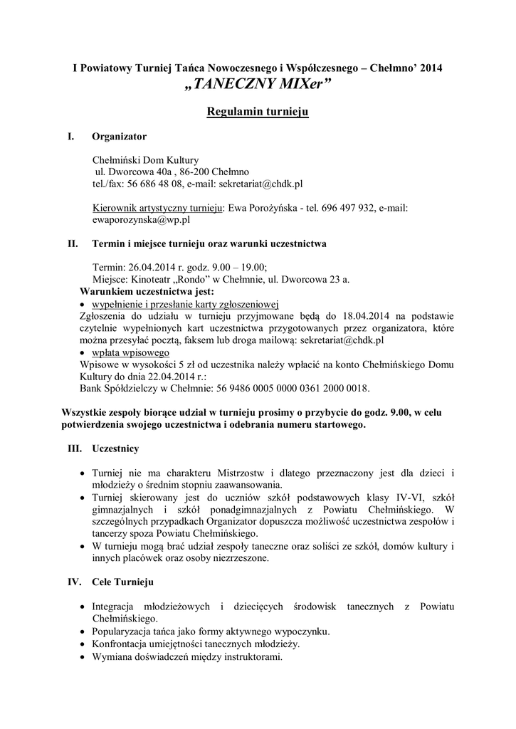 I Powiatowy Turniej Tańca Nowoczesnego i Współczesnego – Chełmno’ 2014 „TANECZNY MIXer” Regulamin turnieju I. Organizator Chełmiński Dom Kultury ul. Dworcowa 40a , 86-200 Chełmno tel./fax: 56 686 48 08, e-mail: [email protected] Kierownik artystyczny turnieju: Ewa Porożyńska - tel. 696 497 932, e-mail: [email protected] II. Termin i miejsce turnieju oraz warunki uczestnictwa Termin: 26.04.2014 r. godz. 9.00 – 19.00; Miejsce: Kinoteatr „Rondo” w Chełmnie, ul. Dworcowa 23 a. Warunkiem uczestnictwa jest: wypełnienie i przesłanie karty zgłoszeniowej Zgłoszenia do udziału w turnieju przyjmowane będą do 18.04.2014 na podstawie czytelnie wypełnionych kart uczestnictwa przygotowanych przez organizatora, które można przesyłać pocztą, faksem lub droga mailową: [email protected] wpłata wpisowego Wpisowe w wysokości 5 zł od uczestnika należy wpłacić na konto Chełmińskiego Domu Kultury do dnia 22.04.2014 r.: Bank Spółdzielczy w Chełmnie: 56 9486 0005 0000 0361 2000 0018. Wszystkie zespoły biorące udział w turnieju prosimy o przybycie do godz. 9.00, w celu potwierdzenia swojego uczestnictwa i odebrania numeru startowego. III. Uczestnicy Turniej nie ma charakteru Mistrzostw i dlatego przeznaczony jest dla dzieci i młodzieży o średnim stopniu zaawansowania. Turniej skierowany jest do uczniów szkół podstawowych klasy IV-VI, szkół gimnazjalnych i szkół ponadgimnazjalnych z Powiatu Chełmińskiego. W szczególnych przypadkach Organizator dopuszcza możliwość uczestnictwa zespołów i tancerzy spoza Powiatu Chełmińskiego. W turnieju mogą brać udział zespoły taneczne oraz soliści ze szkół, domów kultury i innych placówek oraz osoby niezrzeszone. IV. Cele Turnieju Integracja młodzieżowych i dziecięcych środowisk Chełmińskiego. Popularyzacja tańca jako formy aktywnego wypoczynku. Konfrontacja umiejętności tanecznych młodzieży. Wymiana doświadczeń między instruktorami. tanecznych z Powiatu V. Kategorie wiekowe I kategoria - poniżej 12 lat II kategoria - 13-15 lat III kategoria - powyżej 16 lat W przypadku małej liczby formacji startujących w turnieju, organizator zastrzega sobie prawo do połączenia kategorii wiekowych. Czas prezentacji Soliści: 1 min Duety: 1-1,5 min Mini formacje (3-5 osób): 1,5-2,5 min Formacje taneczne (powyżej 5 osób): 1,5-3,5 min VI. Kryteria ocen opracowanie choreograficzne; interpretacja i dobór środków wyrazu artystycznego; technika wykonawcza; ogólny wyraz artystyczny; dobór odpowiedniego podkładu muzycznego. VII. Zasady sędziowania Komisja sędziowska składać się będzie z trzech sędziów oceniających. Sędziów powołuje Organizator. Przydział miejsc nagradzanych zostanie ustalony na podstawie łącznej punktacji w danej kategorii. VIII. Warunki prezentacji O zakwalifikowaniu do odpowiedniej kategorii wiekowej decyduje wiek najstarszego członka zespołu (w duetach wiek starszego partnera). Wykonawcy mogą zaprezentować maksymalnie jeden taniec w jednej kategorii. Tancerze mogą wykonywać: break dance, hip-hop/new style, funky, jazz, taniec współczesny, taniec nowoczesny, balet, dancehall, locking, popping, wacking, electric boogie, house, krumping lub kompilację kilku. Wykonawcy są zobowiązani dostarczyć podkład muzyczny na CD lub USB wraz z dokładnym opisem (nazwa zespołu i numer utworu). IX. Przepisy ogólne 1. Uczestnicy pokrywają koszty przejazdu i ubezpieczenia od następstw nieszczęśliwych wypadków. 2. Niepełnoletniemu uczestnikowi musi towarzyszyć opiekun (rodzic lub upoważniona przezniego osoba). 3. Sprawy nieujęte w regulaminie rozstrzyga organizator. 4. Za rzeczy pozostawione w szatni i miejscach ogólnie dostępnych organizatorzy nie odpowiadają 5. Dane osobowe umieszczane na kartach zgłoszeniowych zgodnie z ustawą o ochroniedanych osobowych będą wykorzystane jedynie do celów konkursu i nie będą udostępnianeosobom trzecim. 6. Osoba odpowiedzialna za przygotowanie i koordynację turnieju: Ewa Porożyńska. 7. Organizator zastrzega sobie prawo do zmian w regulaminie Warsztaty hip-hop „TANECZNY MIXer” W dniu 25.04.2014 r. w godz. 16.00 – 19.00 w Chełmińskim Domu Kultury, dla osób chętnych, w szczególności dla uczestników Powiatowego Turnieju Tańca Nowoczesnego, odbędą się warsztaty taneczne z hip-hopu. Wysokość opłaty za warsztaty – 10 zł od osoby należy wpłacić na konto Chełmińskiego Domu Kultury do dnia 22.04.2014 r.: Bank Spółdzielczy w Chełmnie: 56 9486 0005 0000 0361 2000 0018.