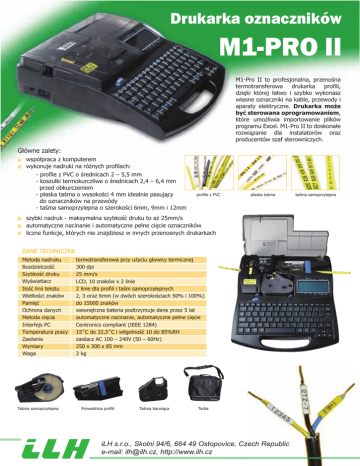 Drukarka oznaczników M1-PRO II M1-Pro II to profesjonalna, przenośna termotransferowa drukarka profili, dzięki której łatwo i szybko wykonasz własne oznaczniki na kable, przewody i aparaty elektryczne. Drukarka może być sterowana oprogramowaniem, które umożliwia importowanie plików programu Excel. M1-Pro II to doskonałe rozwiązanie dla instalatorów oraz producentów szaf sterowniczych. Główne zalety: współpraca z komputerem wykonuje nadruki na różnych profilach: - profile z PVC o średnicach 2 – 5,5 mm - koszulki termokurczliwe o średnicach 2,4 – 6,4 mm przed obkurczeniem - płaska taśma o wysokości 4 mm idealnie pasujący do oznaczników na przewódy - taśma samoprzylepna o szerokości 6mm, 9mm i 12mm profile z PVC płaska taśma szybki nadruk - maksymalna szybkość druku to aż 25mm/s automatyczne nacinanie i automatyczne pełne cięcie oznaczników liczne funkcje, których nie znajdziesz w innych przenosnych drukarkach DANE TECHNICZNE Metoda nadruku Rozdzielczość Szybkość druku Wyświetlacz Ilość linii tekstu Wielkości znaków Pamięć Ochrona danych Metoda cięcia Interfejs PC Temperatura pracy Zasilanie Wymiary Waga Taśma samoprzylepna termotransferowa przy użyciu głowicy termicznej 300 dpi 25 mm/s LCD, 10 znaków x 2 linie 2 linie dla profili i taśm samoprzylepnych 2, 3 oraz 6mm (w dwóch szerokościach 50% i 100%) do 15000 znaków wewnętrzna bateria podtrzymuje dane przez 5 lat automatyczne nacinanie, automatyczne pełne cięcie Centronics compliant (IEEE 1284) 15˚C do 32,5˚C i wilgotność 10 do 85%RH zasilacz AC 100 – 240V (50 – 60Hz) 250 x 300 x 85 mm 2 kg Prowadnica profili Taśma barwiąca Torba iLH s.r.o., Skolni 94/6, 664 49 Ostopovice, Czech Republic e-mail: [email protected], http://www.ilh.cz taśma samoprzylepna
