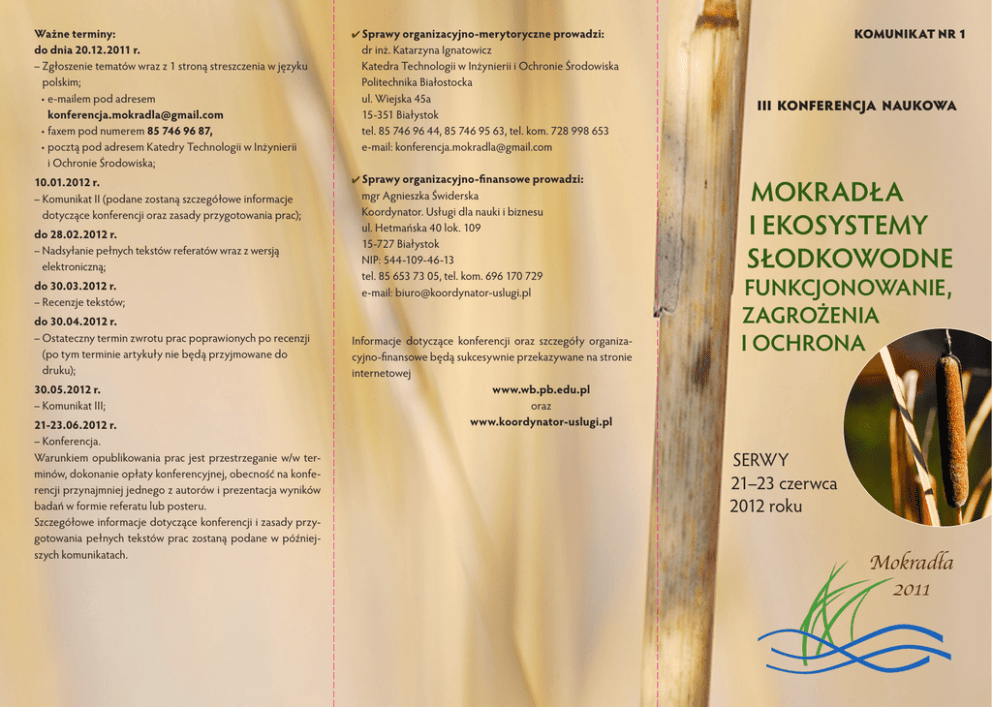 Ważne terminy: do dnia 20.12.2011 r. – Zgłoszenie tematów wraz z 1 stroną streszczenia w języku polskim; • e-mailem pod adresem [email protected] • faxem pod numerem 85 746 96 87, • pocztą pod adresem Katedry Technologii w Inżynierii i Ochronie Środowiska; Sprawy organizacyjno-merytoryczne prowadzi: dr inż. Katarzyna Ignatowicz Katedra Technologii w Inżynierii i Ochronie Środowiska Politechnika Białostocka ul. Wiejska 45a 15-351 Białystok tel. 85 746 96 44, 85 746 95 63, tel. kom. 728 998 653 e-mail: [email protected] 10.01.2012 r. – Komunikat II (podane zostaną szczegółowe informacje dotyczące konferencji oraz zasady przygotowania prac); Sprawy organizacyjno-finansowe prowadzi: mgr Agnieszka Świderska Koordynator. Usługi dla nauki i biznesu ul. Hetmańska 40 lok. 109 15-727 Białystok NIP: 544-109-46-13 tel. 85 653 73 05, tel. kom. 696 170 729 e-mail: [email protected] do 28.02.2012 r. – Nadsyłanie pełnych tekstów referatów wraz z wersją elektroniczną; do 30.03.2012 r. – Recenzje tekstów; do 30.04.2012 r. – Ostateczny termin zwrotu prac poprawionych po recenzji (po tym terminie artykuły nie będą przyjmowane do druku); 30.05.2012 r. – Komunikat III; 21-23.06.2012 r. – Konferencja. Warunkiem opublikowania prac jest przestrzeganie w/w terminów, dokonanie opłaty konferencyjnej, obecność na konferencji przynajmniej jednego z autorów i prezentacja wyników badań w formie referatu lub posteru. Szczegółowe informacje dotyczące konferencji i zasady przygotowania pełnych tekstów prac zostaną podane w późniejszych komunikatach. Informacje dotyczące konferencji oraz szczegóły organizacyjno-finansowe będą sukcesywnie przekazywane na stronie internetowej www.wb.pb.edu.pl oraz www.koordynator-uslugi.pl Komunikat nr 1 III Konferencja Naukowa Mokradła i Ekosystemy Słodkowodne FUNKCJONOWANIE, ZAGROŻENIA I OCHRONA SERWY 21–23 czerwca 2012 roku Mokradła 2011 POLITECHNIKA BIAŁOSTOCKA WYDZIAŁ BUDOWNICTWA I INŻYNIERII ŚRODOWISKA UNIWERSYTET W BIAŁYMSTOKU INSTYTUT BIOLOGII Koordynator. Usługi dla nauki i biznesu Polskie Towarzystwo Inżynierii Ekologicznej Podlaski Oddział Polskie Towarzystwo Hydrobiologiczne Polskie Towarzystwo Gleboznawcze Polskie Zrzeszenie Inżynierów i Techników Sanitarnych Podlaski Oddział Przewodniczący Komitetu Naukowego prof. dr hab. inż. Józefa Wiater – przewodnicząca prof. dr hab. Andrzej Górniak – vice przewodniczący Komitet Organizacyjny dr inż. Katarzyna Ignatowicz – przewodnicząca dr inż. Iwona Skoczko mgr inż. Maciej Karpowicz mgr inż. Małgorzata Krasowska mgr inż. Joanna Struk-Sokołowska inż. Marcin Demiańczuk Helena Samsonowicz mgr inż. Elżbieta Żebranowicz dr inż. Joanna Godlewska – Koordynator mgr Agnieszka Świderska – Koordynator Celem konferencji jest ocena aktualnego stanu mokradeł i ekosystemów słodkowodnych, porównanie metod badawczych stosowanych w tej ocenie, a także prezentacja rezultatów badań, wdrożeń oraz wymiana doświadczeń dotyczących zaawansowanych technologii stosowanych w celu ochrony ekosystemów wodnych. Termin i miejsce konferencji Konferencja odbędzie się w dniach 21–23 czerwca 2012 roku w Centrum Wypoczynkowo-Rekreacyjnym PROSERWY. Ośrodek znajduje się w miejscowości Serwy koło Augustowa w Puszczy Augustowskiej nad jeziorem Serwy, w strefie Kanału Augustowskiego. (www.albatroshotel.pl) Głównymi zagadnieniami naukowymi konferencji będą: bszarowe i punktowe źródła zanieczyszczeń wód O i mokradeł. etody oceny stanu mokradeł i ekosystemów słodkoM wodnych w świetle dyrektywy wodnej. Bioindykacja i monitoring. Użytkowanie a degradacja mokradeł. P rzemiany struktury troficznej mokradeł i ekosystemów słodkowodnych pod wpływem antropopresji. Problemy renaturyzacyjne ekosystemów słodkowodnych. Koszty uczestnictwa: Rodzaj kosztu Cena Udział w konferencji (2 noclegi w pokoju 2-osobowym, pełne wyżywienie, imprezy towarzyszące, druk prac, transfery) 1.600 zł (w tym 23% VAT) Dopłata za dodatkowe strony pracy 50 zł/str. (w tym 23% VAT) Wystąpienie promocyjne firm 500 zł + 23% VAT Stoisko reklamowe ustalenia indywidualne: 1.000–5.000 + 23% VAT Ogłoszenie reklamowe 500 zł + 23% VAT Ekonomiczno-prawne podstawy ochrony wód i mokradeł. aawansowane technologie stosowane w celu ochrony Z ekosystemów wodnych. Ś rodowiskowe i ekonomiczne aspekty melioracji mokradeł. Formy uczestnictwa i prezentacji prac: referaty w sesjach plenarnych i problemowych do 20 min. postery 70 x 100 cm w ystąpienia promocyjne firm, ekspozycja stoisk firmowych, reklamy firm. Publikacje Warunkiem kwalifikacji uczestników jest złożenie jednostronicowego streszczenia. Organizatorzy przewidują druk pełnych tekstów prac w recenzowanym czasopiśmie „Inżynieria Ekologiczna” (10 stron – 6 punktów) oraz w tematycznych monografiach anglojęzycznych (12 stron – 7 punktów). Wpłaty za udział w konferencji do 15 marca 2012 r. Mokradła 2011