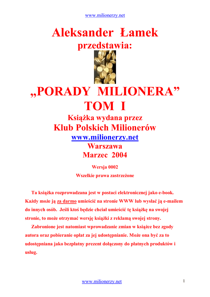 www.milionerzy.net Aleksander Łamek przedstawia: „PORADY MILIONERA” TOM I Książka wydana przez Klub Polskich Milionerów www.milionerzy.net Warszawa Marzec 2004 Wersja 0002 Wszelkie prawa zastrzeżone Ta książka rozprowadzana jest w postaci elektronicznej jako e-book. Każdy może ją za darmo umieścić na stronie WWW lub wysłać ją e-mailem do innych osób. Jeśli ktoś będzie chciał umieścić tę książkę na swojej stronie, to może otrzymać wersję książki z reklamą swojej strony. Zabronione jest natomiast wprowadzanie zmian w książce bez zgody autora oraz pobieranie opłat za jej udostępnianie. Może ona być za to udostępniana jako bezpłatny prezent dołączony do płatnych produktów i usług. www.milionerzy.net 1 www.milionerzy.net Spis treści Wstęp Strony Partnerskie Porady Milionera #1. Jak dając 10 procent na cele społeczne zarobić 1000 i więcej procent #2. Afirmacje #3. Ile warte są książki o bogactwie? #4. Pomysły, które udoskonalą Twój biznes #5. Złota drabina dawania #6. Przygotowania do tworzenia nowych pomysłów #7. Dlaczego nie jesteś bogaty? #8. Zasada 80/20 (zasada Pareta) #9. Siła podświadomości #10. Cztery drogi do bogactwa #11. Techniki wymyślania nowych pomysłów #12. 8 sposobów by stać się bogatym #13. Opowieść o orle #14. Książka "Myśl i bogać się" #15. Czy Zostaniesz Milionerem? #16. Bogaty ojciec, biedny ojciec #17. Wprowadzanie pomysłów w życie #18. Bogactwo a religia #19. Multi Lever Marketing #20. Szesc Najwazniejszych Rzeczy #21. Pomoc w realizacji pomysłów #22. Czy robisz to co lubisz? #23. Inkubator pomysłów #24. Wyobraź Sobie Własny Sukces #25. 8 mitów o tworzeniu bogactwa #26. Album milionera #27. Pieniądze dla podświadomości #28. Musisz mieć system #29. Książki o bogactwie cd #30. Kluby Ludzi Sukcesu #31. Jak skutecznie działać w Internecie Inne książki autora Ciekawe linki Umieść tę książkę na swojej stronie WWW O Klubie Polskich Milionerów i o Autorze Stopka redakcyjna www.milionerzy.net 3 4 9 9 14 17 19 21 23 30 35 38 43 46 53 56 59 60 73 74 80 81 84 88 89 90 91 93 96 97 98 100 102 105 109 111 112 114 117 2 www.milionerzy.net Wstęp Nazywam się Aleksander Łamek i jestem autorem tej książki. Prezentuje ona 31 porad pochodzących z wydawanego przeze mnie bezpłatnego biuletynu pt. Porady Milionera. Każdego dnia roboczego – od poniedziałku do piątku – każdy internauta, który zaprenumeruje za darmo ten biuletyn, otrzymuje na swoją skrzynkę pocztową jedną taką poradę. Biuletyn można zaprenumerować na stronie www.milionerzy.net. Można na niej też znaleźć archiwum wszystkich dotychczasowych porad. W momencie gdy będziesz czytać te słowa, na pewno będzie na tej stronie dostępnych wiele nowych porad. Tak więc zajrzyj na nią koniecznie! Prezentowane w tej książce porady pokazują, w jaki sposób dochodzić do finansowej niezależności i bogactwa. Przedstawiają one różne sposoby i możliwości. Sam ocenisz, które z nich mogą przydać się Tobie. Główne przesłanie płynące z tych porada jest takie, że każdy człowiek, tak jak nauczył się chodzić, czytać, mówić; może się również nauczyć dobrze zarabiać. Jednym taka nauka będzie szła szybciej, innym wolniej, ale każdy, kto włoży w to odpowiednio dużo wysiłku, pasji i czasu, wcześniej czy później osiągnie sukces. Oprócz porad, w tej książce znajdziesz jeszcze kilka innych ciekawych materiałów. W rozdziale Strony Partnerskie znajdziesz informacje o stronach WWW, które przyczyniły się do tego, że możesz teraz czytać tę książkę. Znajdziesz tutaj również informacje o innych moich książkach, linki do ciekawych stron, zasady publikacji tej książki na innych stronach WWW oraz informacje o prowadzonym przeze mnie Klubie Polskich Milionerów. Pozdrawiam i życzę owocnej lektury. Aleksander Łamek www.milionerzy.net 3 www.milionerzy.net Strony Partnerskie 1. Złote Myśli - najlepsze bezpłatne i płatne e-książki www.zlotemysli.pl/ksiegarnia.php Internetowa księgarnia z najlepszymi polskimi e-książkami zarówno płatnymi jak i bezpłatnymi. www.milionerzy.net 4 www.milionerzy.net 2. Bezpłatny miesięcznik MARKETING BIZNESOWY www.marketing.biz.pl Miesięcznik stworzony przez Aleksandra Łamka – autora tej książki. Pismo stawia sobie za cel przekazywanie praktycznych koncepcji na tematy takie jak marketing, sprzedaż i promocja. Ukazuje się 10 każdego miesiąca. www.milionerzy.net 5 www.milionerzy.net 3. Klub Polskich Milionerów www.milionerzy.net Oficjalna strona Klubu Polskich Milionerów. Na stronie można uzyskać informacje o klubie, zapisać się do niego, zaprenumerować bezpłatne porady milionera oraz można znaleźć książki o bogactwie. www.milionerzy.net 6 www.milionerzy.net 4. Klub Ludzi Sukcesu im. Małego Tadzia w Warszawie www.kls.republika.pl Oficjalna strona klubu, którego celem jest rozwijanie wśród jego członków umiejętności, które pomogą im osiągać w życiu sukcesy. Obecnym prezydentem klubu jest Aleksander Łamek – autor tej książki. www.milionerzy.net 7 www.milionerzy.net 5. Radość życia i terapia śmiechem www.smiech.org Kolejny serwis autorstwa Aleksandra Łamka. Prezentuje on materiały na temat tego, jak bardziej cieszyć się życiem i jak być szczęśliwym. Zawiera dział na temat terapii śmiechem (w której Olek jest ekspertem) oraz 100 najlepszych, bo specjalnie wyselekcjonowanych, zabawnych obrazków z całego świata. www.milionerzy.net 8 www.milionerzy.net Porady milionera #1. Jak dając 10 procent na cele społeczne zarobić 1000 i więcej procent Aleksander Łamek Być może słyszałeś już nieraz o koncepcji, aby 10 procent swoich dochodów dawać na cele charytatywne. Większość ludzi tego nie robi z różnych powodów. Tymczasem jak pokazują doświadczenia wielu bogatych ludzi oraz moje własne, oddawanie dziesięciny na społeczne cele jest świetną inwestycją. Oto co na t