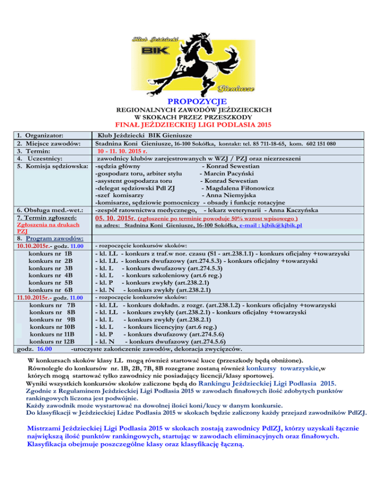 PROPOZYCJE REGIONALNYCH ZAWODÓW JEŹDZIECKICH W SKOKACH PRZEZ PRZESZKODY FINAŁ JEŹDZIECKIEJ LIGI PODLASIA 2015 1. 2. 3. 4. 5. Organizator: Miejsce zawodów: Termin: Uczestnicy: Komisja sędziowska: 6. Obsługa med.-wet.: 7. Termin zgłoszeń: Zgłoszenia na drukach PZJ Klub Jeździecki BIK Gieniusze Stadnina Koni Gieniusze, 16-100 Sokółka, kontakt: tel. 85 711-18-65, kom. 602 151 080 10 - 11. 10. 2015 r. zawodnicy klubów zarejestrowanych w WZJ / PZJ oraz niezrzeszeni -sędzia główny - Konrad Sewestian -gospodarz toru, arbiter stylu - Marcin Pacyński -asystent gospodarza toru - Konrad Sewestian -delegat sędziowski Pdl ZJ - Magdalena Fiłonowicz -szef komisarzy - Anna Niemyjska -komisarze, sędziowie pomocniczy - obsady i funkcje rotacyjne -zespół ratownictwa medycznego, - lekarz weterynarii - Anna Kaczyńska 05. 10. 2015r. (zgłoszenie po terminie powoduje 50% wzrost wpisowego ) na adres: Stadnina Koni Gieniusze, 16-100 Sokółka, e-mail : [email protected] 8. Program zawodów: - rozpoczęcie konkursów skoków: 10.10.2015r.- godz. 11.00 konkurs nr 1B - kl. LL - konkurs z traf.w nor. czasu (S1 - art.238.1.1) - konkurs oficjalny +towarzyski konkurs nr 2B - kl. LL - konkurs dwufazowy (art.274.5.3) - konkurs oficjalny +towarzyski konkurs nr 3B - kl. L - konkurs dwufazowy (art.274.5.3) konkurs nr 4B - kl. L - konkurs szkoleniowy (art.6 reg.) konkurs nr 5B - kl. P - konkurs zwykły (art.238.2.1) konkurs nr 6B - kl. N - konkurs zwykły (art.238.2.1) - rozpoczęcie konkursów skoków: 11.10.2015r.- godz. 11.00 konkurs nr 7B - kl. LL - konkurs dokładn. z rozgr. (art.238.1.2) - konkurs oficjalny +towarzyski konkurs nr 8B - kl. LL - konkurs zwykły (art.238.2.1) - konkurs oficjalny +towarzyski konkurs nr 9B - kl. L - konkurs zwykły (art.238.2.1) konkurs nr 10B - kl. L - konkurs licencyjny (art.6 reg.) konkurs nr 11B - kl. P - konkurs dwufazowy (art.274.5.6) konkurs nr 12B - kl. N - konkurs dwufazowy (art.274.5.6) godz. 16.00 -uroczyste zakończenie zawodów, dekoracja zwycięzców. W konkursach skoków klasy LL mogą równieŜ startować kuce (przeszkody będą obniŜone). Równolegle do konkursów nr. 1B, 2B, 7B, 8B rozegrane zostaną równieŜ konkursy towarzyskie,w których mogą startować tylko zawodnicy nie posiadający licencji/klasy sportowej. Wyniki wszystkich konkursów skoków zaliczone będą do Rankingu Jeździeckiej Ligi Podlasia 2015. Zgodnie z Regulaminem Jeździeckiej Ligi Podlasia 2015 w zawodach finałowych ilość zdobytych punktów rankingowych liczona jest podwójnie. KaŜdy zawodnik moŜe wystartować na dowolnej ilości koni/kucy w danym konkursie. Do klasyfikacji w Jeździeckiej Lidze Podlasia 2015 w skokach będzie zaliczony kaŜdy przejazd zawodników PdlZJ. Mistrzami Jeździeckiej Ligi Podlasia 2015 w skokach zostają zawodnicy PdlZJ, którzy uzyskali łącznie największą ilość punktów rankingowych, startując w zawodach eliminacyjnych oraz finałowych. Klasyfikacja obejmuje poszczególne klasy oraz klasyfikację łączną. PATRONAT ZAWODÓW - WOJEWÓDZKI ZWIĄZEK HODOWCÓW KONI 9. Nagrody : puchary i nagrody zwycięzcom konkursów, medale, flot’s, upominki. Nagrody pienięŜne zwycięzcom Ligi 2015 w skokach (klasyfikacja łączna): I miejsce – 400zł II miejsce – 300zł III miejsce – 200zł Zwycięzcy rankingu Ligi 2015 w poszczególnych klasach otrzymają nagrody rzeczowe. - parkur - podłoŜe piaszczyste (70x70), RozpręŜalnia - podłoŜe trawiaste Parkur wyposaŜony w kłódki atestowane. 10. Plac konkursowy 11. Sprawy organizacyjne: wysokość wpisowego - 50 zł od konia za kaŜdy dzień zawodów opłata za boks ze słomą i sianem - 80 zł za całe zawody (40 zł/dzień) wysokość startowego: 15 zł za kaŜdy przejazd niezaleŜnie od klasy konkursu ( startowe w całości przeznaczone na nagrody ) Opłaty naleŜy uiszczać bezpośrednio po przybyciu na zawody Zgłoszenie na zawody jest równoznaczne z przyjęciem obowiązku wniesienia w/w opłat. Z obowiązku tego zwalnia tylko waŜna przyczyna losowa uniemoŜliwiająca przybycie na zawody zgłoszonych koni i zawodników. Wszelkie zmiany w zgłoszeniach po wyznaczonym terminie powodujące konieczność poprawek na listach startowych mogą być dokonane po uzgodnieniu z organizatorem oraz sędzią głównym zawodów i wniesieniu dodatkowej opłaty w wysokości 20 zł za kaŜdą zmianę. 12. Dokumenty, sprawy róŜne: - Zawodników i konie obowiązuje dokumentacja wg regulaminów i przepisów PZJ. W przypadku braku dokumentów zawodnika lub konia para nie będzie dopuszczona do startu w zawodach. - Wymagane są aktualne dokumenty identyfikacyjne oraz waŜne szczepienia przeciw grypie koni. Konie nie posiadające waŜnych szczepień nie zostaną wpuszczone na teren zawodów. - Organizator nie ponosi odpowiedzialności za kradzieŜe, wypadki i inne szkody mogące powstać w czasie trwania zawodów oraz transportu przed i po zawodach. - Zawody odbywają się zgodnie z przepisami i regulaminami PZJ oraz regulaminem Jeździeckiej Ligi Podlasia 2015. - Zawodnicy startujący w konkursach towarzyskich (1B, 2B, 7B, 8B) muszą posiadać aktualne badania lekarskie oraz ubezpieczenie NNW, a zawodnicy niepełnoletni – pisemną zgodę rodziców lub opiekunów prawnych na start w zawodach. Propozycje zgodne z kalendarzem imprez i zawodów Pdl ZJ. ZAPRASZAMY NA ZAWODY… ORGANIZATOR KLUB JEŹDZIECKI BIK GIENIUSZE Propozycje zatwierdzone przez