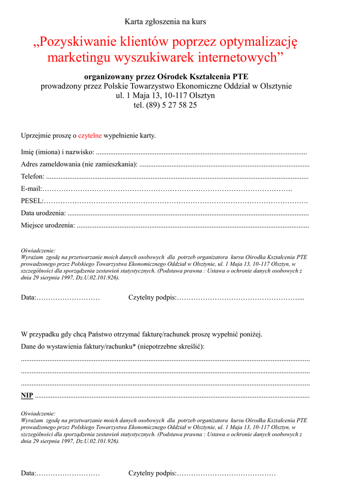 Karta zgłoszenia na kurs „Pozyskiwanie klientów poprzez optymalizację marketingu wyszukiwarek internetowych” organizowany przez Ośrodek Kształcenia PTE prowadzony przez Polskie Towarzystwo Ekonomiczne Oddział w Olsztynie ul. 1 Maja 13, 10-117 Olsztyn tel. (89) 5 27 58 25 Uprzejmie proszę o czytelne wypełnienie karty. Imię (imiona) i nazwisko: ....................................................................................................................... Adres zameldowania (nie zamieszkania): ................................................................................................ Telefon: .................................................................................................................................................... E-mail:……………………………………………………………………………………………. PESEL:…………………………………………………………………………………………………. Data urodzenia: ........................................................................................................................................ Miejsce urodzenia: ................................................................................................................................... Oświadczenie: Wyrażam zgodę na przetwarzanie moich danych osobowych dla potrzeb organizatora kursu Ośrodka Kształcenia PTE prowadzonego przez Polskiego Towarzystwa Ekonomicznego Oddział w Olsztynie, ul. 1 Maja 13, 10-117 Olsztyn, w szczególności dla sporządzenia zestawień statystycznych. (Podstawa prawna : Ustawa o ochronie danych osobowych z dnia 29 sierpnia 1997, Dz.U.02.101.926). Data:……………………… Czytelny podpis:…………………………………………….... W przypadku gdy chcą Państwo otrzymać fakturę/rachunek proszę wypełnić poniżej. Dane do wystawienia faktury/rachunku* (niepotrzebne skreślić): ................................................................................................................................................................... ................................................................................................................................................................... ................................................................................................................................................................... NIP ........................................................................................................................................................... Oświadczenie: Wyrażam zgodę na przetwarzanie moich danych osobowych dla potrzeb organizatora kursu Ośrodka Kształcenia PTE prowadzonego przez Polskiego Towarzystwa Ekonomicznego Oddział w Olsztynie, ul. 1 Maja 13, 10-117 Olsztyn, w szczególności dla sporządzenia zestawień statystycznych. (Podstawa prawna : Ustawa o ochronie danych osobowych z dnia 29 sierpnia 1997, Dz.U.02.101.926). Data:……………………… Czytelny podpis:……………………………………