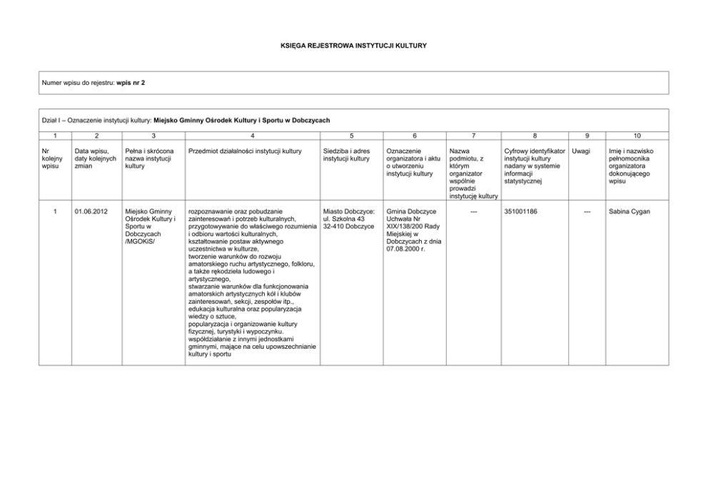 KSIĘGA REJESTROWA INSTYTUCJI KULTURY Numer wpisu do rejestru: wpis nr 2 Dział I – Oznaczenie instytucji kultury: Miejsko Gminny Ośrodek Kultury i Sportu w Dobczycach 1 Nr kolejny wpisu 1 2 3 4 5 Data wpisu, daty kolejnych zmian Pełna i skrócona nazwa instytucji kultury Przedmiot działalności instytucji kultury Siedziba i adres instytucji kultury 01.06.2012 Miejsko Gminny Ośrodek Kultury i Sportu w Dobczycach /MGOKiS/ Miasto Dobczyce: rozpoznawanie oraz pobudzanie ul. Szkolna 43 zainteresowań i potrzeb kulturalnych, przygotowywanie do właściwego rozumienia 32-410 Dobczyce i odbioru wartości kulturalnych, kształtowanie postaw aktywnego uczestnictwa w kulturze, tworzenie warunków do rozwoju amatorskiego ruchu artystycznego, folkloru, a także rękodzieła ludowego i artystycznego, stwarzanie warunków dla funkcjonowania amatorskich artystycznych kół i klubów zainteresowań, sekcji, zespołów itp., edukacja kulturalna oraz popularyzacja wiedzy o sztuce, popularyzacja i organizowanie kultury fizycznej, turystyki i wypoczynku. współdziałanie z innymi jednostkami gminnymi, mające na celu upowszechnianie kultury i sportu 6 7 8 Oznaczenie organizatora i aktu o utworzeniu instytucji kultury Nazwa podmiotu, z którym organizator wspólnie prowadzi instytucję kultury Cyfrowy identyfikator instytucji kultury nadany w systemie informacji statystycznej Gmina Dobczyce Uchwała Nr XIX/138/200 Rady Miejskiej w Dobczycach z dnia 07.08.2000 r. --- 351001186 9 Uwagi --- 10 Imię i nazwisko pełnomocnika organizatora dokonującego wpisu Sabina Cygan Dział II – Organizacja instytucji kultury: Miejsko Gminny Ośrodek Kultury i Sportu w Dobczycach 1 Nr kolejny wpisu 1 2 3 4 5 Data wpisu, daty kolejnych zmian Informacja o złożeniu do rejestru statutu Imię i nazwisko dyrektora instytucji kultury i jego zastępców lub oznaczenie osoby fizycznej lub prawnej, której powierzono zarządzanie instytucja kultury Imię i nazwisko pełnomocników instytucji kultury uprawnionych do dokonywania czynności prawnych w imieniu instytucji oraz zakres ich upoważnień 01.06.2012 Zmiany w statucie MGOKiS wprowadziła Uchwała Nr XIII/100/11 Rady Miejskiej w Dobczycach z dnia 14 września 2011 r. Andrzej Topa --- 6 Nazwa oraz siedziba wyodrębnionych jednostek organizacyjnych instytucji kultury i ich cyfrowe identyfikatory nadane w systemie informacji statystycznej --- 7 Uwagi 8 Imię i nazwisko pełnomocnika organizatora dokonującego wpisu --- Sabina Cygan Dział III – Mienie instytucji kultury: Miejsko Gminny Ośrodek Kultury i Sportu w Dobczycach 1 Nr kolejny wpisu 1 2 3 4 Data wpisu, daty kolejnych zmian Informacja o złożeniu do rejestru rocznego sprawozdania finansowego Informacja o obciążeniu środków trwałych instytucji kultury ograniczonymi prawami rzeczowymi 01.06.2012 Bilans za rok 2013 złożono 29.03.2013 r. --- 5 Uwagi 6 Imię i nazwisko pełnomocnika organizatora dokonującego wpisu ---- Sabina Cygan Dział IV – Połączenie, podział i likwidacja instytucji 1 Nr kolejny wpisu 2 3 Data wpisu, daty kolejnych zmian Informacja o połączeniu, podziale lub likwidacji instytucji kultury 4 Imię i nazwisko likwidatora 5 Uwagi 6 Imię i nazwisko pełnomocnika organizatora dokonującego wpisu