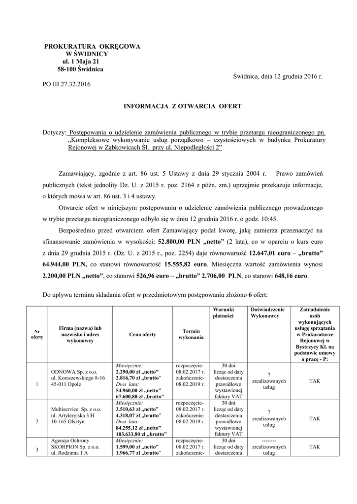 PROKURATURA OKRĘGOWA W ŚWIDNICY ul. 1 Maja 21 58-100 Świdnica Świdnica, dnia 12 grudnia 2016 r. PO III 27.32.2016 INFORMACJA Z OTWARCIA OFERT Dotyczy: Postępowania o udzielenie zamówienia publicznego w trybie przetargu nieograniczonego pn. „Kompleksowe wykonywanie usług porządkowo – czystościowych w budynku Prokuratury Rejonowej w Ząbkowicach Śl. przy ul. Niepodległości 2” Zamawiający, zgodnie z art. 86 ust. 5 Ustawy z dnia 29 stycznia 2004 r. – Prawo zamówień publicznych (tekst jednolity Dz. U. z 2015 r. poz. 2164 z późn. zm.) uprzejmie przekazuje informacje, o których mowa w art. 86 ust. 3 i 4 ustawy. Otwarcie ofert w niniejszym postępowaniu o udzielenie zamówienia publicznego prowadzonego w trybie przetargu nieograniczonego odbyło się w dniu 12 grudnia 2016 r. o godz. 10:45. Bezpośrednio przed otwarciem ofert Zamawiający podał kwotę, jaką zamierza przeznaczyć na sfinansowanie zamówienia w wysokości: 52.800,00 PLN „netto” (2 lata), co w oparciu o kurs euro z dnia 29 grudnia 2015 r. (Dz. U. z 2015 r., poz. 2254) daje równowartość 12.647,01 euro – „brutto” 64.944,00 PLN, co stanowi równowartość 15.555,82 euro. Miesięczna wartość zamówienia wynosi 2.200,00 PLN „netto”, co stanowi 526,96 euro – „brutto” 2.706,00 PLN, co stanowi 648,16 euro. Do upływu terminu składania ofert w przedmiotowym postępowaniu złożono 6 ofert: Warunki płatności Nr oferty Firma (nazwa) lub nazwisko i adres wykonawcy 1 ODNOWA Sp. z o.o. ul. Koraszewskiego 8-16 45-011 Opole 2 Multiservice Sp. z o.o. ul. Artyleryjska 3 H 10-165 Olsztyn 3 Agencja Ochrony SKORPION Sp. z o.o. ul. Rodzinna 1 A Cena oferty Miesięcznie: 2.290,00 zł „netto” 2.816,70 zł „brutto” Dwa lata: 54.960,00 zł „netto” 67.600,80 zł „brutto” Miesięcznie: 3.510,63 zł „netto” 4.318,07 zł „brutto” Dwa lata: 84.255,12 zł „netto” 103.633,80 zł „brutto” Miesięcznie: 1.599,00 zł „netto” 1.966,77 zł „brutto” Doświadczenie Wykonawcy Termin wykonania rozpoczęcie08.02.2017 r. zakończenie08.02.2019 r. rozpoczęcie08.02.2017 r. zakończenie08.02.2019 r. rozpoczęcie08.02.2017 r. zakończenie- 30 dni licząc od daty dostarczenia prawidłowo wystawionej faktury VAT 30 dni licząc od daty dostarczenia prawidłowo wystawionej faktury VAT 30 dni licząc od daty dostarczenia Zatrudnienie osób wykonujących usługę sprzątania w Prokuraturze Rejonowej w Bystrzycy Kł. na podstawie umowy o pracę - P: 7 zrealizowanych usług TAK 7 zrealizowanych usług TAK -------zrealizowanych usług TAK 57-300 Kłodzko 4 ROBOT 1 B. Orzechowska i Z. Gryglewicz Sp. Jawna ul. Pomorska 42 50-219 Wrocław 5 Przedsiębiorstwo Usługowe JAREXS Sp. z o.o. ul. Okólna 1 A 59-220 Legnica 6 P.H.U. KRE-KOM Usługi Komunalne Czesław Kreczmer ul. Świerkowa 15 58-160 Świebodzice Dwa lata: 38.376,00 zł „netto” 47.202,48 zł „brutto” Miesięcznie: 2.777,00 zł „netto” 3.415,71 zł „brutto” Dwa lata: 66.648,00 zł „netto” 81.977,04 zł „brutto” Miesięcznie: 2.696,75 zł „netto” 3.317,00 zł „brutto” Dwa lata: 64.722,00 zł „netto” 79.608,06 zł „brutto” Miesięcznie: 1.990,00 zł „netto” 2.447,70 zł „brutto” Dwa lata: 47.760,00 zł „netto” 58.744,80 zł „brutto” 08.02.2019 r. rozpoczęcie08.02.2017 r. zakończenie08.02.2019 r. . rozpoczęcie08.02.2017 r. zakończenie08.02.2019 r. rozpoczęcie08.02.2017 r. zakończenie08.02.2019 r. prawidłowo wystawionej faktury VAT 30 dni licząc od daty dostarczenia prawidłowo wystawionej faktury VAT 30 dni licząc od daty dostarczenia prawidłowo wystawionej faktury VAT 30 dni licząc od daty dostarczenia prawidłowo wystawionej faktury VAT 7 zrealizowanych usług TAK 8 zrealizowanych usług TAK 6 zrealizowanych usług TAK Prokurator Okręgowy w Świdnicy Wiesław Dworczak 2