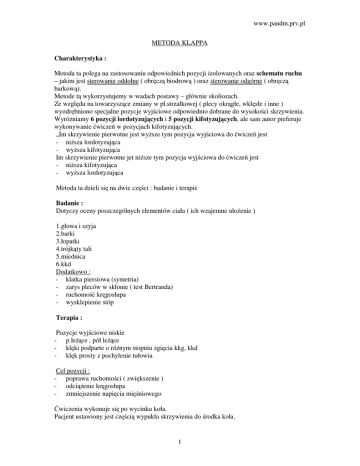 www.pandm.prv.pl METODA KLAPPA Charakterystyka : Metoda ta polega na zastosowaniu odpowiednich pozycji izolowanych oraz schematu ruchu – jakim jest sterowanie oddolne ( obręczą biodrową ) oraz sterowanie odgórne ( obręczą barkową). Metode tą wykorzystujemy w wadach postawy – głównie skoliozach. Ze względu na towarzyszące zmiany w pł.strzałkowej ( plecy okrągłe, wklęsłe i inne ) wyodrębniono specjalne pozycje wyjściowe odpowiednio dobrane do wysokości skrzywienia. Wyróżniamy 6 pozycji lordotyzujących i 5 pozycji kifotyzujących, ale sam autor preferuje wykonywanie ćwiczeń w pozycjach kifotyzujących. „Im skrzywienie pierwotne jest wyższe tym pozycja wyjściowa do ćwiczeń jest - niższa lordotyzująca - wyższa kifotyzująca Im skrzywienie pierwotne jet niższe tym pozycja wyjściowa do ćwiczeń jest - niższa kifotyzująca - wyższa lordotyzująca Metoda ta dzieli się na dwie części : badanie i terapie Badanie : Dotyczy oceny poszczególnych elementów ciała ( ich wzajemne ułożenie ) 1.głowa i szyja 2.barki 3.łopatki 4.trójkąty tali 5.miednica 6.kkd Dodatkowo : - klatka piersiowa (symetria) - zarys pleców w skłonie ( test Bertranda) - ruchomość kręgosłupa - wysklepienie stóp Terapia : Pozycje wyjściowe niskie - p.leżące , pół leżące - klęki podparte o różnym stopniu zgięcia kkg, kkd - klęk prosty z pochylenie tułowia Cel pozycji : - poprawa ruchomości ( zwiększenie ) - odciążenie kręgosłupa - zmniejszenie napięcia mięśniowego Ćwiczenia wykonuje się po wycinku koła. Pacjent ustawiony jest częścią wypukła skrzywienia do środka koła. 1 www.pandm.prv.pl Wyróżniamy następujące ćwiczenia : - czworakowanie głębokie czworakowanie wężowanie skoki zajęcze chód na kolanach ślizganie - wskazane wszystkie typy skoliozy - rozciągnięcie m.okołokręgosłupowych - wzmocnienie m.grzebitu,brzucha - plecy okrągłe (rozciągnięcie m.piersiowych) Inny podział to : 1) 2) 3) 4) Mobilizujące (czworakowanie,wężowanie) Wydłużające (ślizganie,skoki zajęcze) Korekcyjne (głębokie czworakowanie,chód na kolanach) Wzmacniające (skoki zajęcze, chód na kolanach) Ćwiczenia mobilizujące oraz wydłużające stosuje się na początku zajęć , natomiast korekcyjne i wzmacniające w części głównej W zależności od rodzaju skrzywienia ( jednołukowe, prawostronne etc) wyróżniamy odpowiedni schemat ruchu. Ruch kończyn odbywa się poprzez skośne ustawienie obręczy biodrowej, barkowej oraz na boczny przesunięciu obręczy jednej względem drugiej. Przy skoliozach wyższych ruch zapoczątkowuje obręcz barkowa po stronie wklęsłej Przy skoliozach niższych ruch zapoczątkowuje obręcz biodrowa po stronie wypukłej Cel ćwiczeń : - kształtowanie goresetu mięśniowego - poprawa ruchomości kręgosłupa i klatki piersiowej - zwiększenie pojemności życiowej płuc Przykłady schematów : 2 www.pandm.prv.pl I) II) III) IV) V) VI) Skrzywienie jednołukowe piersiowe lewostronne Skrzywienie jednołukowe piersiowe prawostronne Skrzywienie dwułukowe pierwotnie piersiowe prawostronne Skrzywienie dwułukowe pierwotnie piersiowe lewostronne Skrzywienie dwułukowe pierwotnie lędźwiowe lewostronne Skrzywienie pierwotnie dwułukowe piersiowo-lędźwiowe Bibliografia: Nowotny – „Podstawy fizjoterapii – wybrane metody fizjoterapii” Zembaty – „Kinezyterapia – tom II” Klappa METODA KLAPPA – została opracowana w 1906 roku dla korekcji bocznych skrzywień kręgosłupa (głównie leczenia skolioz idiopatycznych). Jej twórcą był Rudolf Klapp – profesor chirurgii Uniwersytetu w Berlinie. Kontynuatorem metody opracowanej przez R. Klappa był jego syn Bernard Klapp, którego praca pt. „Das Klappische Kriechverfahren” doczekała się kilku wydań (Klapp 1973). System ćwiczeń Klappa został oparty na obserwacjach chodu zwierząt czworonożnych (głównie u psów) oraz wynikach badań z zakresu anatomii porównawczej. Punktem wyjścia dla całości metody stało się kilka interesujących spostrzeżeń. Pierwsze z nich dotyczyło tego, że u zwierząt czworonożnych – z racji usytuowania kręgosłupa i wyłączenia działającego nań obciążenia osiowego – boczne skrzywienia kręgosłupa są rzadkością (w zasadzie nie występują), a dość czę-sto występują nie tylko u ludzi ale i u ptaków. Obserwacja ta stanowiła niejako uzasadnienie dla wprowadzenia tzw. niskich pozycji wyjściowych do stosowanych tu ćwiczeń (pozycja leżąca, klęki podparte o róż-nym stopniu ugięcia kończyn górnych i dolnych, a nawet klęk prosty z pochyleniem tułowia w przód). Dostrzeżoną znaczną ruchomość boczną kręgosłupa u czworonożnych oraz typ ruchów kręgosłupa, jakie zachodzą u psa w czasie chodzenia, nasunęły myśl opracowania ćwiczeń o podobnych założ-niach kinetycznych w celu leczenia bocznych skrzywień kręgosłupa u dzieci. Zaobserwowano, że ruchomość kręgosłupa zmienia się w zależności od przyjętej pozycji. Jest ona bowiem większa w odcinku znajdującym się wyżej, w stosunku do ustabilizowanego odcinka, znajdującego się w danej pozycji niżej. W celu zwiększenia możliwości korekcji, postanowiono dobierać odpowiednie pozycje wyjściowe w odniesieniu do lokalizacji skrzywienia pierwotnego (im wyżej zlokalizowane skrzywienie, tym niższa pozycja). Dodatkowo zauważono, że w zależności od przyjętej pozycji, zmieniają się też możliwości oddziaływania na krzywizny kręgosłupa w płaszczyźnie strzałkowej. Na bazie tego wyodrębniono 6 pozycji lordotyzujących poszczególne odcinki kręgosłupa i 5 kifotyzujących. Wszystko to ułatwia dobór najkorzystniejszej pozycji do ćwiczeń, aczkolwiek w każdym indywidualnym przypadku konieczne jest jeszcze sprawdzenie, czy jest to rzeczywiście pozycja najwłaściwsza dla uzyskania zamierzonej korekcji. Ostatnie wreszcie spostrzeżenie podstawowe dotyczyło tego, że zmiana ułożenia obręczy ramiennej b