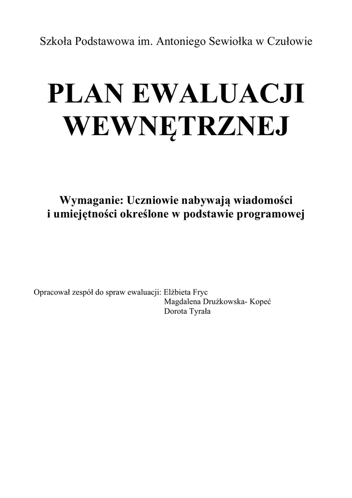 Szkoła Podstawowa im. Antoniego Sewiołka w Czułowie PLAN EWALUACJI WEWNĘTRZNEJ Wymaganie: Uczniowie nabywają wiadomości i umiejętności określone w podstawie programowej Opracował zespół do spraw ewaluacji: Elżbieta Fryc Magdalena Drużkowska- Kopeć Dorota Tyrała Wymaganie: Uczniowie nabywają wiadomości i umiejętności określone w podstawie programowej Cel: Sprawdzenie, w jakim stopniu uczniowie nabyli wiadomości i umiejętności określone w podstawie programowej i w związku z tym, jak sobie radzą na egzaminach zewnętrznych, i w konkursach oraz na następnym etapie kształcenia i na rynku pracy. Pytania kluczowe: 1. W jaki sposób odbywa się diagnozowanie osiągnięć uczniów? 2. Jak wykorzystywane są informacje płynące z analizy efektów kształcenia? 3. Czy uczniowie tej szkoły osiągają dobre wyniki dydaktyczne? (konkursy, egzaminy zewnętrzne) 4. Czy szkoła przygotowuje uczniów do dalszej edukacji i rynku pracy? 5. Czy wybrane programy nauczania uwzględniają wszystkie elementy podstawy programowej? 6. Czy liczba zrealizowanych godzin z poszczególnych przedmiotów jest wystarczająca do realizacji podstawy programowej? 7. Czy oferta zajęć pozalekcyjnych odpowiada potrzebom każdego ucznia i przyczynia się do jego rozwoju? Narzędzia: 1. Wywiad z dyrektorem; 2. Ankieta dla nauczycieli, rodziców i uczniów; 3. Wywiad z wychowawcami; 4. Analiza dokumentacji (wnioski o dopuszczenie programów wraz z opinią, arkusze monitorowania godzin, analiza wyników egzaminów zewnętrznych - test kl.VI, test Smacznego, Ogólnopolskie Badanie Umiejętności Trzecioklasistów, dokument o losach absolwentów, wyniki egzaminów gimnazjalnych naszych absolwentów). Wywiad z dyrektorem 1. W jaki sposób analizuje się osiągnięcia uczniów? Proszę opisać. …..................................................................................................................................... ......................................................................................................................................... ......................................................................................................................................... ......................................................................................................................................... ......................................................................................................................................... .... 2. Które wnioski z analizy osiągnięć uczniów zostały wykorzystane i w jaki sposób? …..................................................................................................................................... ......................................................................................................................................... ......................................................................................................................................... ......................................................................................................................................... ......................................................................................................................................... ......................................................................................................................................... ..... 3. Jak się kształtują wyniki egzaminów zewnętrznych w ciągu ostatnich 3 lat? …..................................................................................................................................... ......................................................................................................................................... ......................................................................................................................................... ......................................................................................................................................... ......................................................................................................................................... .... 4. W jakich konkursach pozaszkolnych uczniowie osiągnęli sukcesy w ciągu ostatnich 3lat? …..................................................................................................................................... ......................................................................................................................................... ......................................................................................................................................... ......................................................................................................................................... ......................................................................................................................................... ......................................................................................................................................... ......................................................................................................................................... ...... 5. W jaki sposób w szkole monitoruje się losy absolwentów? Czy Pani zdaniem absolwenci dobrze sobie radzą na dalszym etapie kształcenia i na rynku pracy? …..................................................................................................................................... ......................................................................................................................................... ......................................................................................................................................... ......................................................................................................................................... ... 6. Czy organizowan
