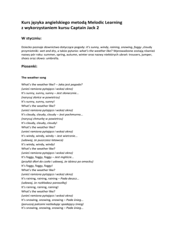 Kurs języka angielskiego metodą Melodic Learning z wykorzystaniem kursu Captain Jack 2 W styczniu: Dziecko poznaje słownictwo dotyczące pogody: it’s sunny, windy, raining, snowing, foggy ,cloudy przymiotniki: wet and dry, a także pytanie: what’s the weather like? Wprowadzone zostają również nazwy pór roku: summer, spring, autumn, winter oraz nazwy niektórych ubrań: trousers, jumper, shoes oraz słowo: umbrella. Piosenki: The weather song What’s the weather like? – Jaka jest pogoda? (unieś ramiona pytająco i wskaż okno) It’s sunny, sunny, sunny – Jest słonecznie... (narysuj słońce w powietrzu) It’s sunny, sunny, sunny! What’s the weather like? (unieś ramiona pytająco i wskaż okno) It’s cloudy, cloudy, cloudy – Jest pochmurno... (narysuj chmurkę w powietrzu) It’s cloudy, cloudy, cloudy! What’s the weather like? (unieś ramiona pytająco i wskaż okno) It’s windy, windy, windy – Jest wietrznie... (udawaj, że puszczasz latawca) It’s windy, windy, windy! What’s the weather like? (unieś ramiona pytająco i wskaż okno) It’s foggy, foggy, foggy – Jest mgliście... (przyłóż dłoń do czoła i udawaj, że idziesz po omacku) It’s foggy, foggy, foggy! What’s the weather like? (unieś ramiona pytająco i wskaż okno) It’s raining, raining, raining – Pada deszcz... (udawaj, że rozkładasz parasolkę) It’s raining, raining, raining! What’s the weather like? (unieś ramiona pytająco i wskaż okno) It’s snowing, snowing, snowing – Pada śnieg... (poruszaj palcami naśladując spadający śnieg) It’s snowing, snowing, snowing – Pada śnieg... The wet and dry song It’s raining, raining, raining – Pada deszcz... (udawaj, że rozkładasz parasolkę) It’s wet, wet, wet – Jest mokro... (udawaj, że strzepujesz z siebie wodę) My jumper and trousers are wet – Mój sweter i spodnie są mokre (wskaż swoje ubrania i otrzep się) And my shoes, too – I moje buty też (wskaż swoje buty) I’m sad. Boo hoo! – Jestem smutny (zrób smutną minę) It’s sunny, sunny, sunny – Jest słonecznie... (narysuj słońce w powietrzu) It’s dry, dry, dry – Jest sucho... (udawaj, że nosisz ręcznik na głowie) My jumper and trousers are dry – Mój sweter i spodnie są suche (wskaż swoje ubrania i uśmiechnij się) And my shoes, too – I moje buty też (wskaż swoje buty) I’m happy. Hurray! – Jestem wesoły! (zrób wesołą minę) Domowa zabawa z językiem angielskim Rodzic przygotowuje obrazki przedstawiające różne rodzaje pogody oraz pory roku. Następnie przykleja je w widocznych miejscach w jednym pokoju. Zadaniem dziecka jest słuchanie zdań: It’s raining. / It’s summer. / It’s winter. / It’s autumn. / It’s cloudy. / It’s sunny. / It’s snowing. / It’s spring i podbieganie po każdym z nich do odpowiedniego obrazka. Rodzic ponownie wykorzystuje przygotowane wcześniej obrazki. Wskazuje obrazki pór roku i podaje pasujące do nich pary zdań: It’s summer. It’s sunny. / It’s winter. It’s snowing. / It’s autumn. It’s cloudy. / It’s spring. It’s raining. Następnie pokazuje dziecku obrazki w innej kolejności i prosi, żeby samo je opisało. Rodzic daje maluchowi trochę czasu do zastanowienia, ale oczywiście może sam rozpoczynać kolejne zdania: It’s..., pomagając dziecku w tworzeniu wypowiedzi, jeśli ma ono z tym trudności.