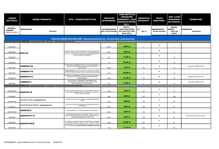 NUMER ARTYKUŁU MATERIAL NUMMER (Article number) NAZWA PRODUKTU OPIS / CHARAKTERYSTYKA BEZEICHNUNG WIELKOŚĆ OPAKOWANIA PACKUNGSGRößE (Size of the package) (Product) CENA NETTO ZA JEDNOSTKĘ JEDNOSTKA SPRZEDAŻY, LOCO SPRZEDAŻY MAGAZYN KUTNO 2013 NETTO PREIS EXW KUTNO 2013 (Net Price EXW Kutno 2013) JE 1 (per 1) GRUPA RABATOWA WARENGRUPPE (Group of goods) MAX. ILOŚĆ OPAKOWAŃ NA PALECIE ANZAHL GEB/PAL (Units per pallet) KOMENTARZ KOMMENTAR (Comment) USZCZELNIENIA BUDOWLANE / Bauwerksabdichtung / Construction waterproofing USZCZELNIENIA BITUMICZNE / Abdichtungsstoffe - Bitumen / Bituminous waterproofing 1000 l * 8,80 zł L 200 l * 9,70 zł L 202840002 28 l 11,05 zł L 202840001 14 l 16,10 zł L 202840005 202840006 205012002 205011001 2050345001 205033001 gotowa do użycia, bezrozpuszczalnikowa, nie zawierająca fenoli, chlorków, smoły elastyczna, bitumiczna powłoka uszczelniająco ochronna . Stosowana również jako grunt pod COMBIFLEX AB 2 oraz KSK ABDICHTUNGSBAHN ASOL-FE COMBIDIC-2K dwuskładnikowa, anionowa, bitumiczna masa uszczelniająca, do wykonywania bezszwowych izolacji przeciwwilgociowych i przeciwwodnych COMBIDIC-1K klej bitumiczny do płyt drenażowych i ochronnych, jak również gotowa do użycia elastyczna, bitumiczna powłoka uszczelniająca COMBIDIC-P2 COMBIDIC-L 30 kg 7,45 zł KG 28 l 10,05 zł L dwuskładnikowa, kationowa, bitumiczna masa uszczelniająca, do wykonywania bezszwowych izolacji przeciwwilgociowych i przeciwwodnych 25 kg 11,45 zł KG jednoskładnikowa, bitumiczno - kauczukowa masa uszczelniająca, do wykonywania bezszwowych izolacji przeciwwilgociowych i przeciwwodnych 28 l 17,50 zł L 25 kg 3,65 zł KG 6 kg 9,30 zł KG 25 kg 3,90 zł KG 25 kg * 5,05 zł KG 4 4 4 3 3 4 5 6 1 2 18 24 poprzednio COMBIFLEX AB 2 18 18 poprzednio COMBIFLEX C2/P 18 poprzednio COMBIFLEX DS. 18 USZCZELNIENIA MINERALNE / Abdichtungsstoffe - mineralisch / Mineral Waterprooofing materials 204248003OE sztywna, cienkowarstwowa zaprawa uszczelniająca, przeznaczona do izolacji przeciwwilgociowych i przeciwwodnych, odporna na wodę o ciśnieniu ujemnym AQUAFIN-1K 204248001 204280101OE 204278101 204220001OE 204212001 204280002 AQUAFIN-2K/M, (komponent A) komponent A (proszkowy) zaprawy uszczelniającej AQUAFIN 2K/M AQUAFIN-2K/M WEISS, (komponent A) komponent A (proszkowy) zaprawy uszczelniającej AQUAFIN 2K/M WEISS AQUAFIN-IC jednoskładnikowa, krystalizująca zaprawa uszczelniająca AQUAFIN-TC 07 dwuskładnikowa,zaprawa uszczelniająca, odporna na mróz, starzenie, działanie wód agresywnych oraz promieniowanie UV o podwyższonej odporności mechanicznej AQUAFIN-2K/M dwuskładnikowa, wysoce elastyczna (mostkująca rysy) zaprawa uszczelniająca, dyfuzyjna, odporna na mróz, starzenie, działanie wód agresywnych oraz promieniowanie UV, szczelność zbadana do 70 m słupa wody, przystosowana do aplikacji maszynowej 204281006 SCHOMBURG - cennik detaliczny 2013 (v 15.01.2013).xlsx 08.04.2013 25 kg 5,60 zł KG 30 kg * 8,45 zł KG 35 kg 10,00 zł KG 7 kg 17,15 zł KG 7 7 7 7 6 6 7 7 42 128 42 42 42 produkt niedystrybuowany w Polsce ! 21 21 80 NUMER ARTYKUŁU MATERIAL NUMMER (Article number) 204250003 NAZWA PRODUKTU OPIS / CHARAKTERYSTYKA BEZEICHNUNG (Product) dwuskładnikowa, elastyczna zaprawa uszczelniająca, dyfuzyjna, stosowana do ochrony betonu w zbiornikach na wodę pitną, szybach windowych, zbiorników wody użytkowej, zbiorników na ścieki i kanałów jak również zbiorników na gnojowicę AQUAFIN-2K 204250001 204263003 dwuskładnikowa, elastyczna zaprawa uszczelniająca, o dużej odporności na wody silnie agresywne dla betonu AQUAFIN-UM WIELKOŚĆ OPAKOWANIA CENA NETTO ZA JEDNOSTKĘ JEDNOSTKA SPRZEDAŻY, LOCO SPRZEDAŻY MAGAZYN KUTNO 2013 PACKUNGSGRößE (Size of the package) NETTO PREIS EXW KUTNO 2013 (Net Price EXW Kutno 2013) 33,33 kg 10,10 zł KG 8 kg 20,35 zł KG JE 1 (per 1) 33,33 kg * 10,85 zł KG AQUAFIN-2K/M WEISS dwuskładnikowa, wysoce elastyczna zaprawa uszczelniająca w kolorze starobiel, przeznaczona do barwienia przez wymieszanie ze specjalnym pigmentem barwiącym 35 kg * 13,00 zł KG AQUAFIN-DIC dwuskładnikowa izolacja mineralna, przeznaczona do izolowania podziemnch części budynków i budowli oraz do wykonywania izolacji poziomej pod przegrodami budowlanymi 30 kg * 15,60 zł KG AQUAFIN-1K-FLEX jednoskładnikowa, elastyczna zaprawa uszczelniająca dla klasy obciążenia wodą A i A0 20 kg * 15,65 zł KG 20 kg * 22,30 zł KG 20 kg * 23,15 zł KG 204208003 10 kg * 25,45 zł KG 204251006 8,33 kg 31,55 zł KG 4,17 kg 32,35 zł KG 204278001 204246110 204262003 205032001 204208001 204251007 AQUAFIN-LM 800 samosieciująca, reaktywna zaprawa uszczelniająca do stosowania w nietypowych warunkach jak np. niskie temp., duża wilgotność powietrza, klej do mocowania taśm uszczelniających serii ASO DICHTBAND, ASO DB, ASO JOINT AQUAFIN-RS 300 UNIFLEX-B komponent B (płynny) zaprawy uszczelniającej AQUAFIN 2K 204251001 2 kg * 204282003 204282001 UNIFLEX-M 200706003 PIGMENTPASTE MITTELGRAU (średnio-szary) 200702003 PIGMENTPASTE ROTBRAUN (rudy) 200703003 PIGMENTPASTE DUNKELGRAU (ciemno-szary) 200707003 PIGMENTPASTE WEIß (biały) SCHOMBURG - cennik detaliczny 2013 (v 15.01.2013).xlsx pigmenty do barwienia, białej zaprawy uszczelniającej AQUAFIN 2K/M WEISS 08.04.2013 KG 1000 kg * 29,85 zł KG 10 kg 33,15 zł KG 2 kg 55,30 zł KG 0,6 kg * 31,47 zł ST komponent B (płynny) zaprawy uszczelniającej AQUAFIN 2K/M 204281005 54,20 zł 0,6 kg * 34,28 zł ST 0,6 kg * 36,64 zł ST 0,6 kg * 40,90 zł ST GRUPA RABATOWA WARENGRUPPE (Group of goods) 6 6 6 7 5 4 5 5 5 5 5 5 5 5 5 4 4 4 4 MAX. ILOŚĆ OPAKOWAŃ NA PALECIE ANZAHL GEB/PAL (Units per pallet) KOMENTARZ KOMMENTAR (Comment) 21 80 produkt niedystrybuowany w Polsce ! 21 21 produkt niedystrybuowany w Polsce ! 21 42 produkt niedystrybuowany w Polsce ! 32 18 24 40 85 100 1 40 100 50 50 50 50 NUMER ARTYKUŁU MATERIAL NUMMER (Article number) 200711003 NAZWA PRODUKTU BEZEICHNUNG (Product) OPIS / CHARAKTERYSTYKA pigmenty do barw