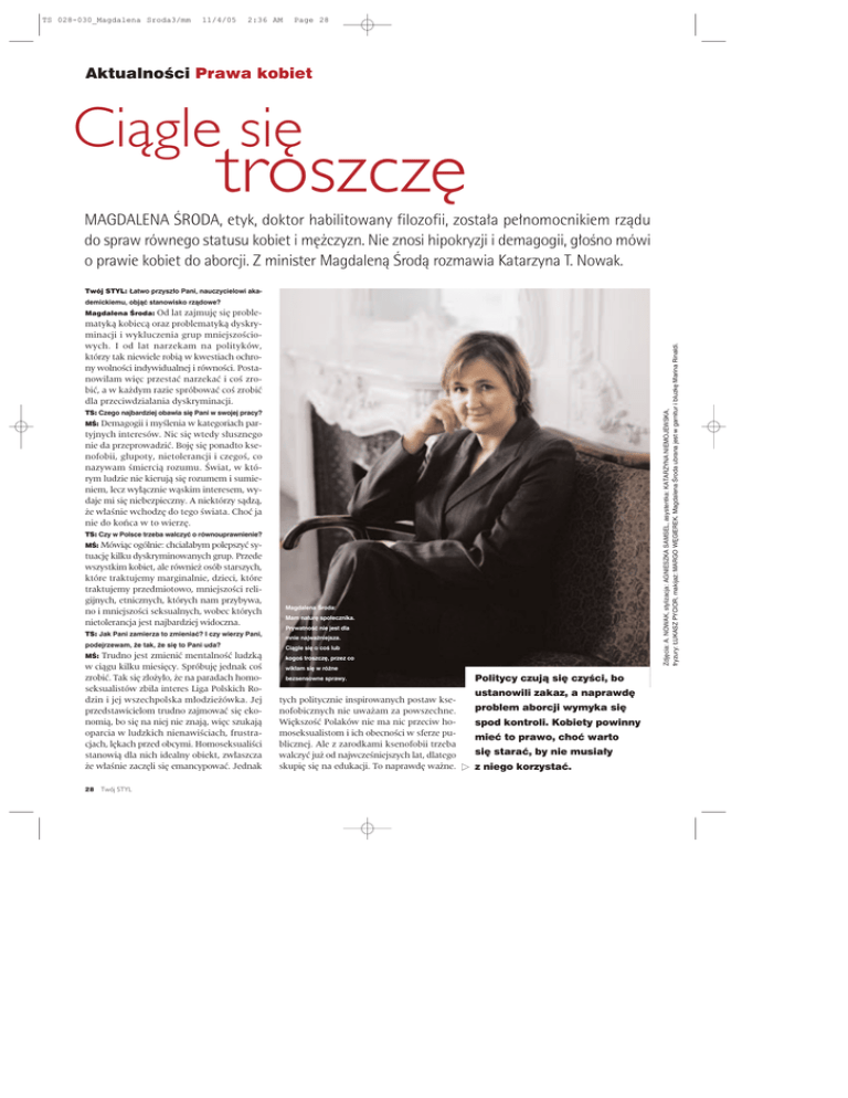 TS 028-030_Magdalena Sroda3/mm 11/4/05 2:36 AM Page 28 AktualnoÊci Prawa kobiet Ciàgle si´ troszcz´ MAGDALENA ÂRODA, etyk, doktor habilitowany filozofii, zosta∏a pe∏nomocnikiem rzàdu do spraw równego statusu kobiet i m´˝czyzn. Nie znosi hipokryzji i demagogii, g∏oÊno mówi o prawie kobiet do aborcji. Z minister Magdalenà Ârodà rozmawia Katarzyna T. Nowak. Twój STYL: ¸atwo przysz∏o Pani, nauczycielowi akademickiemu, objàç stanowisko rzàdowe? Zdj´cia: A. NOWAK, stylizacja: AGNIESZKA SAMSEL, asystentka: KATARZYNA NIEMOJEWSKA, fryzury: ¸UKASZ PYCIOR, makija˝: MARGO W¢GIEREK. Magdalena Âroda ubrana jest w garnitur i bluzk´ Marina Rinaldi. Magdalena Âroda: Od lat zajmuj´ si´ problematykà kobiecà oraz problematykà dyskryminacji i wykluczenia grup mniejszoÊciowych. I od lat narzekam na polityków, którzy tak niewiele robià w kwestiach ochrony wolnoÊci indywidualnej i równoÊci. Postanowi∏am wi´c przestaç narzekaç i coÊ zrobiç, a w ka˝dym razie spróbowaç coÊ zrobiç dla przeciwdzia∏ania dyskryminacji. TS: Czego najbardziej obawia si´ Pani w swojej pracy? MÂ: Demagogii i myÊlenia w kategoriach partyjnych interesów. Nic si´ wtedy s∏usznego nie da przeprowadziç. Boj´ si´ ponadto ksenofobii, g∏upoty, nietolerancji i czegoÊ, co nazywam Êmiercià rozumu. Âwiat, w którym ludzie nie kierujà si´ rozumem i sumieniem, lecz wy∏àcznie wàskim interesem, wydaje mi si´ niebezpieczny. A niektórzy sàdzà, ˝e w∏aÊnie wchodz´ do tego Êwiata. Choç ja nie do koƒca w to wierz´. TS: Czy w Polsce trzeba walczyç o równouprawnienie? MÂ: Mówiàc ogólnie: chcia∏abym polepszyç sy- TS: Jak Pani zamierza to zmieniaç? I czy wierzy Pani, podejrzewam, ˝e tak, ˝e si´ to Pani uda? Trudno jest zmieniç mentalnoÊç ludzkà w ciàgu kilku miesi´cy. Spróbuj´ jednak coÊ zrobiç. Tak si´ z∏o˝y∏o, ˝e na paradach homoseksualistów zbi∏a interes Liga Polskich Rodzin i jej wszechpolska m∏odzie˝ówka. Jej przedstawicielom trudno zajmowaç si´ ekonomià, bo si´ na niej nie znajà, wi´c szukajà oparcia w ludzkich nienawiÊciach, frustracjach, l´kach przed obcymi. HomoseksualiÊci stanowià dla nich idealny obiekt, zw∏aszcza ˝e w∏aÊnie zacz´li si´ emancypowaç. Jednak MÂ: 28 Twój STYL Magdalena Âroda: Mam natur´ spo∏ecznika. PrywatnoÊç nie jest dla mnie najwa˝niejsza. Ciàgle si´ o coÊ lub kogoÊ troszcz´, przez co wik∏am si´ w ró˝ne Politycy czujà si´ czyÊci, bo bezsensowne sprawy. tych politycznie inspirowanych postaw ksenofobicznych nie uwa˝am za powszechne. Wi´kszoÊç Polaków nie ma nic przeciw homoseksualistom i ich obecnoÊci w sferze publicznej. Ale z zarodkami ksenofobii trzeba walczyç ju˝ od najwczeÊniejszych lat, dlatego skupi´ si´ na edukacji. To naprawd´ wa˝ne. ustanowili zakaz, a naprawd´ problem aborcji wymyka si´ spod kontroli. Kobiety powinny mieç to prawo, choç warto si´ staraç, by nie musia∏y ▼ tuacj´ kilku dyskryminowanych grup. Przede wszystkim kobiet, ale równie˝ osób starszych, które traktujemy marginalnie, dzieci, które traktujemy przedmiotowo, mniejszoÊci religijnych, etnicznych, których nam przybywa, no i mniejszoÊci seksualnych, wobec których nietolerancja jest najbardziej widoczna. z niego korzystaç. TS 028-030_Magdalena Sroda3/mm 11/4/05 2:36 AM Page 30 Ciàgle si´ troszcz´ ▼ TS: Wiem, ˝e jest Pani zwolenniczkà prawa do aborcji. Uda si´ to prawo uchwaliç? Prawo kobiety do aborcji jest wa˝nym prawem gwarantujàcym wolnoÊç i samostanowienie kobiet. Nale˝y ono do kanonu praw wolnoÊciowych krajów cywilizowanych. Kobiety powinny je mieç, choç warto si´ staraç, by nie musia∏y z niego korzystaç. Sàdz´, ˝e edukacja seksualna i dost´pnoÊç Êrodków antykoncepcyjnych temu zapobiegnà. Zakaz aborcji, jaki mamy, niczemu nie zapobiega, a jedynie powoduje, ˝e niektórzy z polityków oraz ksi´˝a majà „czyste r´ce”. Aborcja jest tymczasem problemem spo∏ecznym. Majà do niej dost´p osoby dobrze sytuowane. W gabinetach bez problemu mo˝na dokonaç aborcji, sà pigu∏ki wczesnoporonne, mamy otwarte granice, za którymi aborcja jest dozwolona itp. Problem majà kobiety biedne, zale˝ne od swoich m´˝ów, kobiety gwa∏cone. Ich dramat nikogo nie interesuje. Politycy czujà si´ czyÊci, bo ustanowili zakaz, a naprawd´ problem aborcji wymyka si´ spod kontroli. A ja nie znosz´ hipokryzji, zakaz aborcji jest jej najwi´kszym przejawem. MÂ: TS: Uczy Pani, jak kobiety majà walczyç o swoje miejsce w pracy i w domu. A o co Pani musia∏a walczyç? MÂ: Na pewno nie o niezale˝noÊç w domu, bo mam po prostu Êwietnego m´˝a. Optymistycznie mo˝na powiedzieç, ˝e jest bardzo tolerancyjny; mówiàc pesymistycznie – ˝e nie zwraca na mnie specjalnej uwagi. W ka˝dym razie mog´ robiç, co chc´. Nigdy nie kontestowa∏ mojej niezale˝noÊci i profesjonalnych aspiracji. W ogóle sàdz´, ˝e tolerancja i wzajemne uznanie niezale˝noÊci, akceptacja w∏aÊciwej dla danej osoby drogi samorozwoju, to jedna z wa˝niejszych cech dobrego ma∏˝eƒstwa. TS: Pracuje Pani na Uniwersytecie Warszawskim, gdzie jest wielu m´˝czyzn. Tu nie musia∏a Pani o nic walczyç? MÂ: Gdy przysz∏am do pracy, by∏am na pierw- szym roku studiów doktoranckich. Mój przysz∏y szef (jest nim zresztà do dziÊ i bardzo go ceni´) powiedzia∏ mi, ˝e ch´tnie mnie zatrudni, ale pod pewnym warunkiem: ˝adnych dzieci i innych obowiàzków poza pracà. A ja, jako osoba ambitna, ogromnie si´ tym prze- Kobiety zawsze wychowywano do biernoÊci. Teraz uczy si´ je aktywnoÊci, co cz´sto jest samobójcze. Bo i tak tkwi w nich morze troski o innych. I odpowiedzialnoÊci. 30 Twój STYL j´∏am. Mojej cià˝y nikt nie dostrzeg∏, to znaczy nie w sensie wizualnym, ale absencyjnym. Pracowa∏am niemal do ostatniego dnia: dziecko urodzi∏am w Êrod´, a w poniedzia∏ek by∏am ju˝ w pracy. Chcia∏am pokazaç, ˝e macierzyƒstwo mi w niczym nie p