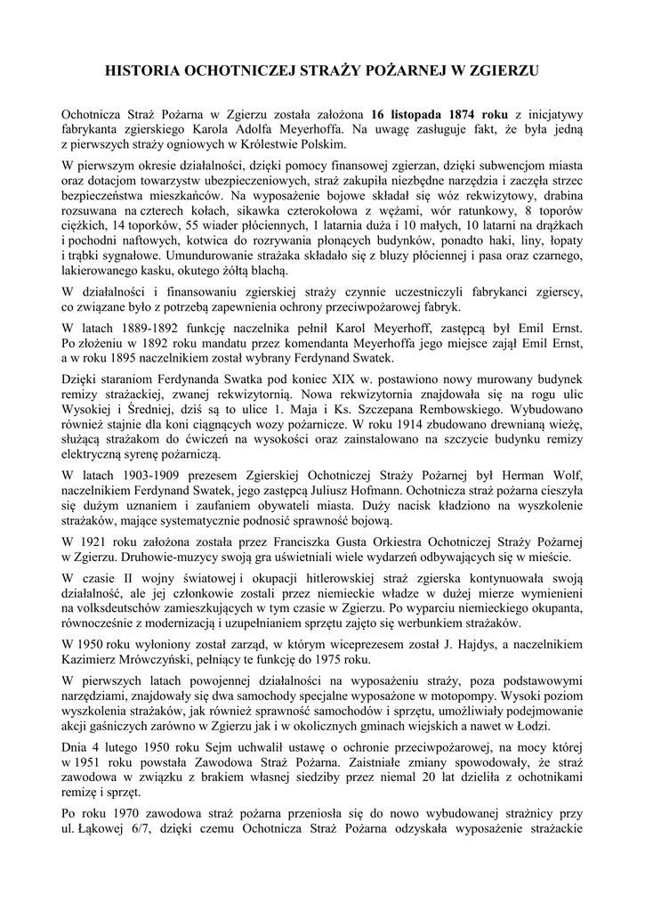 HISTORIA OCHOTNICZEJ STRAŻY POŻARNEJ W ZGIERZU Ochotnicza Straż Pożarna w Zgierzu została założona 16 listopada 1874 roku z inicjatywy fabrykanta zgierskiego Karola Adolfa Meyerhoffa. Na uwagę zasługuje fakt, że była jedną z pierwszych straży ogniowych w Królestwie Polskim. W pierwszym okresie działalności, dzięki pomocy finansowej zgierzan, dzięki subwencjom miasta oraz dotacjom towarzystw ubezpieczeniowych, straż zakupiła niezbędne narzędzia i zaczęła strzec bezpieczeństwa mieszkańców. Na wyposażenie bojowe składał się wóz rekwizytowy, drabina rozsuwana na czterech kołach, sikawka czterokołowa z wężami, wór ratunkowy, 8 toporów ciężkich, 14 toporków, 55 wiader płóciennych, 1 latarnia duża i 10 małych, 10 latarni na drążkach i pochodni naftowych, kotwica do rozrywania płonących budynków, ponadto haki, liny, łopaty i trąbki sygnałowe. Umundurowanie strażaka składało się z bluzy płóciennej i pasa oraz czarnego, lakierowanego kasku, okutego żółtą blachą. W działalności i finansowaniu zgierskiej straży czynnie uczestniczyli fabrykanci zgierscy, co związane było z potrzebą zapewnienia ochrony przeciwpożarowej fabryk. W latach 1889-1892 funkcję naczelnika pełnił Karol Meyerhoff, zastępcą był Emil Ernst. Po złożeniu w 1892 roku mandatu przez komendanta Meyerhoffa jego miejsce zajął Emil Ernst, a w roku 1895 naczelnikiem został wybrany Ferdynand Swatek. Dzięki staraniom Ferdynanda Swatka pod koniec XIX w. postawiono nowy murowany budynek remizy strażackiej, zwanej rekwizytornią. Nowa rekwizytornia znajdowała się na rogu ulic Wysokiej i Średniej, dziś są to ulice 1. Maja i Ks. Szczepana Rembowskiego. Wybudowano również stajnie dla koni ciągnących wozy pożarnicze. W roku 1914 zbudowano drewnianą wieżę, służącą strażakom do ćwiczeń na wysokości oraz zainstalowano na szczycie budynku remizy elektryczną syrenę pożarniczą. W latach 1903-1909 prezesem Zgierskiej Ochotniczej Straży Pożarnej był Herman Wolf, naczelnikiem Ferdynand Swatek, jego zastępcą Juliusz Hofmann. Ochotnicza straż pożarna cieszyła się dużym uznaniem i zaufaniem obywateli miasta. Duży nacisk kładziono na wyszkolenie strażaków, mające systematycznie podnosić sprawność bojową. W 1921 roku założona została przez Franciszka Gusta Orkiestra Ochotniczej Straży Pożarnej w Zgierzu. Druhowie-muzycy swoją gra uświetniali wiele wydarzeń odbywających się w mieście. W czasie II wojny światowej i okupacji hitlerowskiej straż zgierska kontynuowała swoją działalność, ale jej członkowie zostali przez niemieckie władze w dużej mierze wymienieni na volksdeutschów zamieszkujących w tym czasie w Zgierzu. Po wyparciu niemieckiego okupanta, równocześnie z modernizacją i uzupełnianiem sprzętu zajęto się werbunkiem strażaków. W 1950 roku wyłoniony został zarząd, w którym wiceprezesem został J. Hajdys, a naczelnikiem Kazimierz Mrówczyński, pełniący te funkcję do 1975 roku. W pierwszych latach powojennej działalności na wyposażeniu straży, poza podstawowymi narzędziami, znajdowały się dwa samochody specjalne wyposażone w motopompy. Wysoki poziom wyszkolenia strażaków, jak również sprawność samochodów i sprzętu, umożliwiały podejmowanie akcji gaśniczych zarówno w Zgierzu jak i w okolicznych gminach wiejskich a nawet w Łodzi. Dnia 4 lutego 1950 roku Sejm uchwalił ustawę o ochronie przeciwpożarowej, na mocy której w 1951 roku powstała Zawodowa Straż Pożarna. Zaistniałe zmiany spowodowały, że straż zawodowa w związku z brakiem własnej siedziby przez niemal 20 lat dzieliła z ochotnikami remizę i sprzęt. Po roku 1970 zawodowa straż pożarna przeniosła się do nowo wybudowanej strażnicy przy ul. Łąkowej 6/7, dzięki czemu Ochotnicza Straż Pożarna odzyskała wyposażenie strażackie i pomieszczenia remizy przy zbiegu ulic 1. Maja i Ks. Szczepana Rembowskiego. Mogła dzięki temu szerzej rozwinąć swoją działalność, strażacy brali udział w akcjach gaśniczych, w licznych szkoleniach i pokazach. Od lat 80-tych sytuacja finansowa zgierskiej straży ochotniczej zaczęła ulegać znacznemu pogorszeniu wskutek ograniczenia dotacji państwowych. Fundusze na działalność gromadzono jedynie ze składek członkowskich i w drodze zbiórek publicznych. Zaistniała sytuacja dość szybko spowodowała znaczny spadek liczby członków, ponieważ ze względu na braki w wyposażeniu strażackim, ograniczeniu uległa możliwość czynnego udziału w akcjach gaśniczych. Zarząd zgierskiej OSP w osobach prezesa H. Piątkowskiego, wiceprezesa S. Grzebińskiego i naczelnika R. Witczaka, przez kilka lat podejmował próby utrzymania budynku strażnicy, poprzez wynajem pomieszczeń, zbieranie składek i zabieganie o wpłaty ze środków prywatnych. Większość prac porządkowych i remontowych prowadzona była przez ochotników czysto społecznie. Sytuacja straży była na tyle zła, że niemożnością było prowadzenie działalności zarówno operacyjnej jak i kulturalno-oświatowej. Dopiero w 2012 roku po powołaniu nowego Zarządu sytuacja finansowa straży zaczęła się sukcesywnie poprawiać. Pozyskano samochód ratowniczo-gaśniczy i nowy sprzęt pożarniczy. Druhowie biorą udział w zabezpieczaniu pod względem przeciwpożarowym wydarzeń odbywających się na terenie Zgierza oraz prowadzą działalność kulturalno-oświatową dla dzieci i młodzieży. Corocznie organizowany jest Powiatowy Konkurs Plastyczny „Wypalanie traw wyniszcza świat”, który cieszy się dużą popularnością. Jednostka OSP działa dzięki dotacjom udzielanym przez Urząd Miasta Zgierza, dzięki składkom członkowskim oraz darowiznom od instytucji i osób prywatnych. Starania zarządu, któremu przewodniczy prezes Tomasz Jędrzejczak oraz zainteresowanie ze strony sympatyków, wpływają na ciągły rozwój formacji i rozszerzanie jej działalności statutowej. Historia liczącej