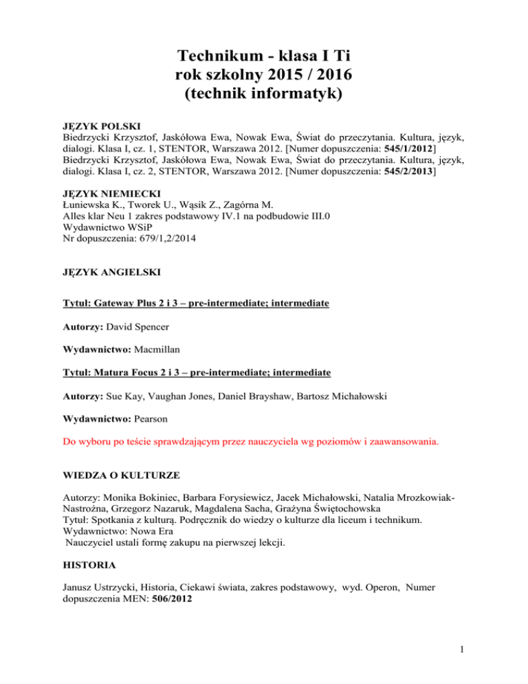 Technikum - klasa I Ti rok szkolny 2015 / 2016 (technik informatyk) JĘZYK POLSKI Biedrzycki Krzysztof, Jaskółowa Ewa, Nowak Ewa, Świat do przeczytania. Kultura, język, dialogi. Klasa I, cz. 1, STENTOR, Warszawa 2012. [Numer dopuszczenia: 545/1/2012] Biedrzycki Krzysztof, Jaskółowa Ewa, Nowak Ewa, Świat do przeczytania. Kultura, język, dialogi. Klasa I, cz. 2, STENTOR, Warszawa 2012. [Numer dopuszczenia: 545/2/2013] JĘZYK NIEMIECKI Łuniewska K., Tworek U., Wąsik Z., Zagórna M. Alles klar Neu 1 zakres podstawowy IV.1 na podbudowie III.0 Wydawnictwo WSiP Nr dopuszczenia: 679/1,2/2014 JĘZYK ANGIELSKI Tytuł: Gateway Plus 2 i 3 – pre-intermediate; intermediate Autorzy: David Spencer Wydawnictwo: Macmillan Tytuł: Matura Focus 2 i 3 – pre-intermediate; intermediate Autorzy: Sue Kay, Vaughan Jones, Daniel Brayshaw, Bartosz Michałowski Wydawnictwo: Pearson Do wyboru po teście sprawdzającym przez nauczyciela wg poziomów i zaawansowania. WIEDZA O KULTURZE Autorzy: Monika Bokiniec, Barbara Forysiewicz, Jacek Michałowski, Natalia MrozkowiakNastrożna, Grzegorz Nazaruk, Magdalena Sacha, Grażyna Świętochowska Tytuł: Spotkania z kulturą. Podręcznik do wiedzy o kulturze dla liceum i technikum. Wydawnictwo: Nowa Era Nauczyciel ustali formę zakupu na pierwszej lekcji. HISTORIA Janusz Ustrzycki, Historia, Ciekawi świata, zakres podstawowy, wyd. Operon, Numer dopuszczenia MEN: 506/2012 1 WIEDZA O SPOŁECZEŃSTWIE „Odkrywamy na nowo”. Wiedza o społeczeństwie. Podręcznik dla szkół ponadgimnazjalnych. Zakres podstawowy. Autor: Zbigniew Smutek, Jan Maleska Wydawca: OPERON Sp. z o.o. Data dopuszczenia: 2011-12-29 Numer ewidencyjny w wykazie: 407/2011 GEOGRAFIA Kliszek R., Biedermann K. –„Oblicze geografii” – podręcznik dla szkół ponadgimnazjalnych. Zakres podstawowy. Wydawnictwo Nowa Era nr ewidencyjny w wykazie MEN: 433/2012 BIOLOGIA Bonar E., W. Krzeszowiec-Jelec, Czachorowski S.- "Biologia na czasie" Poziom podstawowy Wydawnictwo Nowa Era nr dopuszczenia MEN 450/2012 CHEMIA Hassa Romuald, Mrzigod Aleksandra, Mrzigod Janusz – „To jest chemia” Podręcznik dla szkół ponadgimnazjalnych zakres podstawowy Wydawnictwo Nowa Era nr dopuszczenia: 438/2012 FIZYKA „Odkryć fizykę” Podręcznik dla szkół ponadgimnazjalnych. Zakres podstawowy Autorzy: Marcin Braun, Weronika Śliwa Wydawnictwo Nowa Era Nr ewidencyjny w wykazie: 447/2012 MATEMATYKA Babiański W. , Chańko L., Pończek D. – „Matematyka 1” Podręcznik dla szkół ponadgimnazjalnych Kształcenie ogólne w zakresie podstawowym i rozszerzonym. Wydawnictwo Nowa Era nr dopuszczenia 360/1/2011 INFORMATYKA Koba G.- Informatyka podręcznik dla szkół ponadgimnazjalnych, zakres podstawowy, wydawnictwo MiGRA, rok dopuszczenia-2012 EDUKACJA DLA BEZPIECZEŃSTWA 2 Boniek B., Kruczyński A., Wrycz - Rekowski Ł. – „Edukacja dla bezpieczeństwa” podręcznik dla szkół ponadgimnazjalnych. Wydawnictwo Operon nr dopuszczenia: 409/2012 RELIGIA Podręcznik nr AZ-41-01/10-PO-1/11; Tytuł podręcznika: "Moje miejsce w Kościele" pod red. J. Szpet i D. Jackowiak; Wydawnictwo Św. Wojciecha Poznań. PODRĘCZNIKI DO PRZEDMIOTÓW ZAWODOWYCH TECHNIKUM – technik informatyk Kwalifikacja E.12. Montaż i eksploatacja komputerów osobistych oraz urządzeń peryferyjnych. Podręcznik do nauki zawodu technik informatyk, 2013 Autor: Tomasz Kowalski Wydawnictwo: Helion Kwalifikacja E.13. Projektowanie lokalnych sieci komputerowych i administrowanie sieciami. Podręcznik do nauki zawodu technik informatyk. Część 1, 2012 Autorzy: Barbara Halska, Paweł Bensel Wydawnictwo: Helion Podejmowanie i prowadzenie działalności gospodarczej Jacek Musiałkiewicz Ekonomik ISBN -978-83-7735-029-4 3