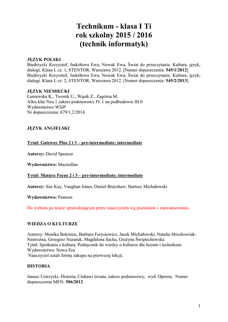 Technikum - klasa I Ti rok szkolny 2015 / 2016 (technik informatyk)