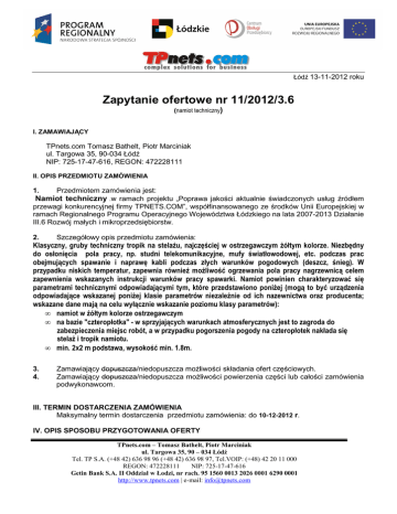 Łódź 13-11-2012 roku Zapytanie ofertowe nr 11/2012/3.6 (namiot techniczny) I. ZAMAWIAJĄCY TPnets.com Tomasz Bathelt, Piotr Marciniak ul. Targowa 35, 90-034 Łódź NIP: 725-17-47-616, REGON: 472228111 II. OPIS PRZEDMIOTU ZAMÓWIENIA 1. Przedmiotem zamówienia jest: Namiot techniczny .w ramach projektu „Poprawa jakości aktualnie świadczonych usług źródłem przewagi konkurencyjnej firmy TPNETS.COM”, współfinansowanego ze środków Unii Europejskiej w ramach Regionalnego Programu Operacyjnego Województwa Łódzkiego na lata 2007-2013 Działanie III.6 Rozwój małych i mikroprzedsiębiorstw. 2. Szczegółowy opis przedmiotu zamówienia: Klasyczny, gruby techniczny tropik na stelażu, najczęściej w ostrzegawczym żółtym kolorze. Niezbędny do osłonięcia pola pracy, np. studni telekomunikacyjne, mufy światłowodowej, etc. podczas prac obejmujących spawanie i naprawę kabli podczas złych warunków pogodowych (deszcz, śnieg). W przypadku niskich temperatur, zapewnia również możliwość ogrzewania pola pracy nagrzewnicą celem zapewnienia wskazanych instrukcji warunków pracy spawarki. Namiot powinien charakteryzować się parametrami technicznymi odpowiadającymi tym, które przedstawiono poniżej (mogą to być urządzenia odpowiadające wskazanej poniżej klasie parametrów niezależnie od ich nazewnictwa oraz producenta; wskazane dane mają na celu wyłącznie wskazanie poziomu klasy parametrów): • namiot w żółtym kolorze ostrzegawczym • na bazie "czteropłotka" - w sprzyjających warunkach atmosferycznych jest to zagroda do zabezpieczenia miejsc robót, a w przypadku pogorszenia pogody na czteropłotek nakłada się stelaż i tropik namiotu. • min. 2x2 m podstawa, wysokość min. 1.8m. 3. 4. Zamawiający dopuszcza/niedopuszcza możliwości składania ofert częściowych. Zamawiający dopuszcza/niedopuszcza możliwości powierzenia części lub całości zamówienia podwykonawcom. III. TERMIN DOSTARCZENIA ZAMÓWIENIA Maksymalny termin dostarczenia przedmiotu zamówienia: do 10-12-2012 r. IV. OPIS SPOSOBU PRZYGOTOWANIA OFERTY TPnets.com – Tomasz Bathelt, Piotr Marciniak ul. Targowa 35, 90 – 034 Łódź Tel. TP S.A. (+48 42) 636 98 96 (+48 42) 636 98 97, Tel.VOIP: (+48) 42 20 11 000 REGON: 472228111 NIP: 725-17-47-616 Getin Bank S.A. II Oddział w Łodzi, nr rach. 95 1560 0013 2026 0001 6290 0001 http://www.tpnets.com | e-mail: [email protected] Oferta powinna zawierać : - specyfikacje techniczną - oświadczenie o spełnianiu kryteriów zamówienia - ceny wyrażone w kwocie netto i brutto, - opatrzona danymi firmowymi, - posiadać datę sporządzenia, - zawierać dane teleadresowe , numer telefonu oraz numer NIP, V. MIEJSCE ORAZ TERMIN SKŁADANIA OFERT 1. Oferta powinna być przesłana / dostarczona za pośrednictwem ( do wyboru) : a) b) c) d) e) poczty elektronicznej na adres: [email protected] faksem na nr: 42 636 98 96, pocztą tradycyjną, kurierem osobiście na adres zamawiającego do dnia 20-11-2012 roku Ocena ofert zostanie dokonana w dniu 21-11-2012 roku a wyniki i wybór najkorzystniejszej oferty zostanie ogłoszony o godzinie 12:00 w siedzibie TPnets.com ul. Targowa 35 oraz na stronie internetowej pod adresem http://tpnets.com/?page_id=394 2. Oferty złożone po terminie nie będą rozpatrywane 3. Oferent może przed upływem terminu składania ofert zmienić lub wycofać swoją ofertę. 4. W toku badania i oceny ofert Zamawiający może żądać od oferentów wyjaśnień dotyczących treści złożonych ofert. Zapytanie ofertowe zamieszczono na stronie: http://tpnets.com/?page_id=394 VI. OCENA OFERT Zamawiający dokona oceny ważnych ofert na podstawie następujących kryteriów: 1. Spełnienie wymagań specyfikacji technicznej : 40 % 2. Cena - 60% VII. INFORMACJE DOTYCZĄCE WYBORU NAJKORZYSTNIEJSZEJ OFERTY O wyborze najkorzystniejszej oferty Zamawiający zawiadomi oferentów za pośrednictwem strony internetowej znajdującej się pod adresem http://tpnets.com/?page_id=394 VIII. DODATKOWE INFORMACJE Dodatkowych informacji udziela Tomasz Bathelt/Beata Bajer pod numerem telefonu 42 636 98 96 lub 42 636 98 97 oraz adresem email: [email protected] TPnets.com – Tomasz Bathelt, Piotr Marciniak ul. Targowa 35, 90 – 034 Łódź Tel. TP S.A. (+48 42) 636 98 96 (+48 42) 636 98 97, Tel.VOIP: (+48) 42 20 11 000 REGON: 472228111 NIP: 725-17-47-616 Getin Bank S.A. II Oddział w Łodzi, nr rach. 95 1560 0013 2026 0001 6290 0001 http://www.tpnets.com | e-mail: [email protected]