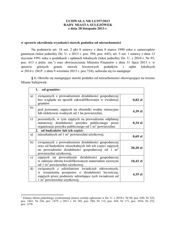 UCHWAŁA NR LI/357/2013 RADY MIASTA SULEJÓWEK z dnia 28 listopada 2013 r. w sprawie określenia wysokości stawek podatku od nieruchomości Na podstawie art. 18 ust. 2 pkt 8 ustawy z dnia 8 marca 1990 roku o samorządzie gminnym (tekst jednolity Dz. U. z 2013 r. poz. 594, poz. 645), art. 5 ust. 1 ustawy z dnia 12 stycznia 1991 roku o podatkach i opłatach lokalnych (tekst jednolity Dz. U. z 2010 r. Nr 95, poz. 613 z późn. zm.1) oraz obwieszczenia Ministra Finansów z dnia 31 lipca 2013 r. w sprawie górnych granic stawek kwotowych podatków i opłat lokalnych w 2014 r. (M.P. z dnia 9 września 2013 r. poz.724), uchwala się co następuje: § 1. Określa się następujące stawki podatku od nieruchomości obowiązujące na terenie Miasta Sulejówek: 1. a) b) od gruntów: związanych z prowadzeniem działalności gospodarczej bez względu na sposób zakwalifikowania w ewidencji gruntów i budynków od 1m2 powierzchni, pod jeziorami, zajętych na zbiorniki wodne retencyjne lub elektrowni wodnych od 1 ha powierzchni, pozostałych, w tym zajętych na prowadzenie odpłatnej statutowej działalności pożytku publicznego przez organizacje pożytku publicznego od 1 m2 powierzchni. 2. od budynków lub ich części: a) mieszkalnych od 1 m2 powierzchni użytkowej, 0,82 zł 4,39 zł c) b) c) d) 1 związanych z prowadzeniem działalności gospodarczej oraz od budynków mieszkalnych lub ich części zajętych na prowadzenie działalności gospodarczej od 1 m2 powierzchni użytkowej, zajętych na prowadzenie działalności gospodarczej w zakresie obrotu kwalifikowanym materiałem siewnym od 1 m2 powierzchni użytkowej, związanych z udzielaniem świadczeń zdrowotnych, w rozumieniu przepisów o działalności leczniczej, zajętych przez podmioty udzielające tych świadczeń od 1 m2 powierzchni użytkowej, 0,34 zł 0,69 zł 20,20 zł 10,43 zł 4,35 zł Zmiany tekstu jednolitego wymienionej ustawy zostały ogłoszone w Dz. U. z 2010 r. Nr 96, poz. 620, Nr 225, poz. 1461, Nr 226, poz. 1475; z 2011 r. Nr 102, poz. 584, Nr 112, poz. 654, Nr 171, poz. 1016, Nr 232, poz. 1378. e) pozostałych, w tym zajętych na prowadzenie odpłatnej statutowej działalności pożytku publicznego przez organizacje pożytku publicznego od 1 m2 powierzchni użytkowej, z wyjątkiem: 7,05 zł 1) garaży mających charakter przybudówki lub wolnostojących od 1 m2 powierzchni użytkowej, 6,48 zł 2) budynków gospodarczych od 1 m2 powierzchni użytkowej. 5,71 zł 3. od budowli: wodociągów i kanalizacji - od wartości określonej na podstawie 1) art. 4 ust. 1 pkt 3 i ust. 3-7 ustawy o podatkach i opłatach lokalnych, pozostałych - od wartości określonej na podstawie art. 4 2) ust.1 pkt 3 i ust. 3-7 ustawy o podatkach i opłatach lokalnych. 1,5% 2% § 2. Wykonanie uchwały powierza się Burmistrzowi Miasta Sulejówek. § 3. Traci moc Uchwała Rady Miasta Sulejówek Nr XXXIV/256/2012 z dnia 22 listopada 2012 r. (Dziennik Urzędowy Województwa Mazowieckiego z 2012 r. poz. 9513) w sprawie określenia wysokości stawek podatku od nieruchomości. § 4. Uchwała wchodzi w życie po upływie 14 dni od dnia jej ogłoszenia w Dzienniku Urzędowym Województwa Mazowieckiego z mocą obowiązującą od dnia 1 stycznia 2014 r. Przewodniczy Rady Miasta Sulejówek Adam Lesiński UZASADNIENIE Uchwałę w sprawie wysokości stawek podatku od nieruchomości podejmuje się na podstawie art. 18 ust. 2 pkt 8 ustawy z dnia 8 marca 1990 roku o samorządzie gminnym (tekst jednolity Dz. U. z 2013 r. poz. 594, poz. 645), art. 5 ust. 1 ustawy z dnia 12 stycznia 1991 roku o podatkach i opłatach lokalnych (tekst jednolity Dz. U. z 2010 r. Nr 95, poz. 613 z późn. zm.) Zgodnie z wyżej przytoczonymi przepisami, organem upoważnionym do określania wysokości stawek podatkowych jest rada gminy, która uwzględniając ustawowe ograniczenia w zakresie możliwości ustalania stawek określa ich wysokość w drodze uchwały z tym, że górne granice stawek kwotowych na dany rok podatkowy nie mogą przekroczyć maksymalnych stawek ogłoszonych przez Ministra Finansów w drodze obwieszczenia. W myśl art. 20 ust. 1 ww. ustawy górne granice stawek kwotowych obowiązujące w danym roku podatkowym ulegają corocznie zmianie na następny rok podatkowy w stopniu odpowiadającym wskaźnikowi cen towarów i usług konsumpcyjnych w okresie pierwszego półrocza roku, w którym stawki ulegają zmianie, w stosunku do analogicznego okresu roku poprzedniego. Wskaźnik cen, o którym mowa powyżej, został ustalony na podstawie komunikatu Prezesa Głównego Urzędu Statystycznego z dnia 15 lipca 2013 r. ogłoszonego w Monitorze Polskim z 2013 r. poz. 595. Zgodnie z powyższym komunikatem wskaźnik cen towarów i usług konsumpcyjnych w pierwszym półroczu 2013 r. w stosunku do pierwszego półrocza 2012 r. wyniósł 100,9 (wzrost cen o 0,9 %). Na podstawie w/w komunikatu Minister Finansów ogłosił w obwieszczeniu górne granice stawek kwotowych podatków i opłat lokalnych na 2014 r. ogłoszone w Monitorze Polskim z dnia 9 września 2013 r. poz. 724. Zaproponowane stawki na 2014 r. spełniają powyższy wymóg. Podatek od nieruchomości jest najbardziej powszechnym podatkiem lokalnym. Płacą go wszyscy właściciele nieruchomości lub obiektów budowlanych, posiadacze samoistni nieruchomości lub obiektów budowlanych, użytkownicy wieczyści gruntów a także posiadacze nieruchomości lub ich części stanowiących własność Skarbu Państwa lub jednostki samorządu terytorialnego. W uchwale na 2014 rok zaproponowano wzrost stawek o wskaźnik wynoszący 1,0 % z wyłączeniem stawki dla gruntów pozostałych, w tym zajętych na prowadzenie odpłatnej statutowej działalności pożytku publicznego przez organizacje pożytku publicznego, która pozostała w wysokości nie zmienionej z 2013 r.. Określając stawki podatku na takim poziomie brano pod uwagę znaczące wpływy podatku od nieruchomości stanowiące istotne źródło zabezpieczenia realizacji podstawowyc