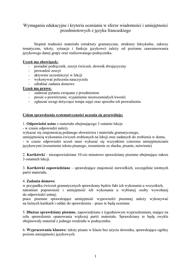 Wymagania edukacyjne i kryteria oceniania w sferze wiadomości i umiejętności przedmiotowych z języka francuskiego Stopień trudności materiału (struktury gramatyczne, struktury leksykalne, zakresy tematyczne, teksty, sytuacje i funkcje językowe) zależy od poziomu zaawansowania językowego danej grupy oraz realizowanego podręcznika. Uczeń ma obowiązek: - posiadać podręcznik, zeszyt ćwiczeń, słownik dwujęzyczny - prowadzić zeszyt - aktywnie uczestniczyć w lekcji - wykonywać polecenia nauczyciela - odrabiać zadania domowe Uczeń ma prawo: - zadawać pytania związane z przedmiotem - prosić o powtórzenie, wyjaśnienie niezrozumiałych kwestii - zgłaszać uwagi dotyczące tempa zajęć oraz sposobu ich prowadzenia Celem sprawdzenia systematyczności uczenia się przewiduję: 1. Odpowiedzi ustne z materiału obejmującego 3 ostatnie lekcje - w czasie odpowiedzi należy wykazać się znajomością podanego słownictwa i materiału gramatycznego, umiejętnością wykonania ćwiczeń zrobionych na lekcji oraz zadanych do zrobienia w domu, - w czasie odpowiedzi uczeń musi wykazać się wszystkimi czterema umiejętnościami językowymi (rozumienie tekstu pisanego, rozumienie ze słuchu, pisanie, mówienie) 2. Kartkówki – niezapowiedziane 10-cio minutowe sprawdziany pisemne obejmujące zakres 3 ostatnich lekcji. 3. Kartkówki zapowiedziane – sprawdzające znajomość niewielkich, szczególnie istotnych partii materiału. 4. Zadania domowe w przypadku ćwiczeń gramatycznych sprawdzany będzie fakt ich wykonania u wszystkich, natomiast poprawność i umiejętność ich wykonania u wybranej osoby wywołanej do odpowiedzi ustnej; prace pisemne sprawdzające umiejętność wypowiedzi pisemnej należy wykonywać na luźnych kartkach i oddać do sprawdzenia – prace te będą oceniane 5. Dłuższe sprawdziany pisemne, zapowiedziane z tygodniowym wyprzedzeniem, mające na celu sprawdzenie opanowania większej partii materiału. Sprawdziany te będą zwykle obejmowały materiał z jednego rozdziału w podręczniku. 6. Wypracowania klasowe: teksty pisane w klasie bez użycia słownika, sprawdzające ogólny poziom umiejętności językowych. 1 7. Testy sprawdzające rozumienie ze słuchu oraz rozumienie tekstu pisanego. Ocena semestralna i końcowo roczna nie jest wystawiana na podstawie wyliczenia średniej arytmetycznej ze wszystkich wystawionych ocen. Przy jej wystawianiu bierze się pod uwagę różną wagę poszczególnych ocen. Kryteria oceny: Ocenę dopuszczającą otrzymuje uczeń, który: - posiada najprostsze, najbardziej użyteczne i niezbędne do dalszej nauki wiadomości i umiejętności i potrafi odtworzyć je i zastosować w kontekstach, sytuacjach identycznych do tych, które poznał na lekcji przy niewielkiej pomocy nauczyciela - mimo licznych błędów ortograficznych, fonetycznych, strukturalnych, jego wypowiedź ustna i pisemna jest zrozumiała - w zakresie rozumienia ze słuchu i tekstu pisanego potrafi odpowiedzieć na formułowane w języku polskim pytania do poznanych wcześniej tekstów Ocenę dostateczną otrzymuje uczeń, który: - posiada podstawowe wiadomości i umiejętności, odtwarza je i stosuje w kontekstach, sytuacjach identycznych do tych, które poznał na lekcji bez pomocy nauczyciela - mimo błędów ortograficznych, fonetycznych, strukturalnych jego wypowiedź jest zrozumiała - w zakresie rozumienia ze słuchu i tekstu pisanego, potrafi odpowiedzieć na formułowane w języku francuskim pytania do poznanych wcześniej tekstów Ocenę dobrą otrzymuje uczeń, który: - posiada wiadomości i umiejętności odtworzenia ich i zastosowania w kontekstach i sytuacjach zbliżonych do tych, które poznał na lekcji - popełnia sporadyczne błędy niezakłócające komunikacji - w zakresie rozumienia ze słuchu i tekstu pisanego, potrafi odpowiedzieć na formułowane w języku francuskim pytania do tekstów podobnych do tych, które poznał na lekcji Ocenę bardzo dobrą otrzymuje uczeń, który: - posiada wiadomości i umiejętności trudne do opanowania, złożone i nietypowe, alternatywne do podstawowych - samodzielnie i twórczo posługuje się nimi w kontekstach, sytuacjach nowych, różnych od tych, które poznał na lekcji - jego wypowiedzi ustne i pisemne są prawie bezbłędne w zakresie przerobionego materiału - w zakresie rozumienia ze słuchu i tekstu pisanego, potrafi odpowiedzieć na formułowane w języku francuskim pytania do tekstów niepoznanych na lekcji Ocenę celującą otrzymuje uczeń, który: -posiada wiedzę i umiejętności wykraczające poza program, szczególnie złożone i trudne na danym etapie nauki, poświadczone uzyskanymi certyfikatami językowymi, -uczestniczył w etapie międzyszkolnym Olimpiady Języka Francuskiego 2 Zadania zamknięte oceniane będą wg następującej skali: 50-59 % - dopuszczający 60-74 % - dostateczny 75-84 % - dobry 85-99 % - bardzo dobry 100 % -celujący Inne kryteria 1. W przypadku nieobecności ucznia na zapowiedzianym sprawdzianie pisemnym, uczeń jest zobowiązany do napisania go na następnej lekcji; W przypadku usprawiedliwionej nieobecności spowodowanej dłuższą, (co najmniej 1 tydzień) chorobą, lub przygotowaniami do olimpiady czy innego konkursu przedmiotowego, po powrocie do szkoły uczeń ustala z nauczycielem termin napisania zaległej pracy, musi się to jednak odbyć w ciągu 2 tygodni. Po upływie tego terminu, uczeń otrzymuje ocenę niedostateczną. 2. W przypadku nieoddania pracy pisemnej w wyznaczonym terminie, za każdy tydzień opóźnienia będzie obniżana ocena o 1 stopień. 3. Uczeń ma prawo zgłosić 2 nieprzygotowania w ciągu trymestru. Musi to jednak mieć miejsce przed rozpoczęciem przez nauczyciela działań związanych z kontrolą przygotowania do lekcji. 4. Uczeń ma prawo do poprawienia raz oceny z zapowiedzianego sprawdzianu pisemnego, w terminie uzgodnionym z nauczycielem. 5. Ocenę z odpowiedzi ustnej lub niezapowiedzianej kartkówki można pop