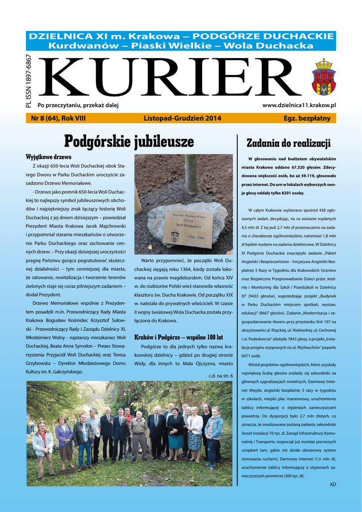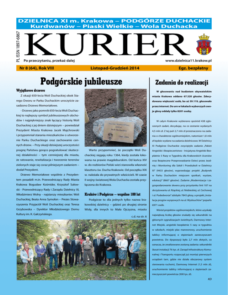 PL ISSN 1897-6867 DZIELNICA XI m. Krakowa – PODGÓRZE DUCHACKIE Kurdwanów – Piaski Wielkie – Wola Duchacka Po przeczytaniu, przekaż dalej Nr 8 (64), Rok VIII www.dzielnica11.krakow.pl Listopad-Grudzień 2014 Egz. bezpłatny Podgórskie jubileusze Zadania do realizacji Wyjątkowe drzewo Z okazji 650-lecia Woli Duchackiej obok Sta- miasta Krakowa oddano 67.320 głosów. Zdecy- rego Dworu w Parku Duchackim uroczyście za- dowana większość osób, bo aż 59.119, głosowało sadzono Drzewo Memoriałowe. przez internet. Do urn w lokalach wyborczych swo- je głosy oddały tylko 8201 osoby. - Drzewo jako pomnik 650-lecia Woli Duchac- W głosowaniu nad budżetem obywatelskim kiej to najlepszy symbol jubileuszowych obchodów i najpiękniejszy znak łączący historię Woli Duchackiej z jej dniem dzisiejszym – powiedział szonych zadań, decydując, na co zostanie wydanych Prezydent Miasta Krakowa Jacek Majchrowski 4,5 mln zł. Z tej puli 2,7 mln zł przeznaczono na zada- i przypomniał starania mieszkańców o utworze- nia o charakterze ogólnomiejskim, natomiast 1,8 mln nie Parku Duchackiego oraz zachowanie cen- zł będzie wydane na zadania dzielnicowe. W Dzielnicy nych drzew. – Przy okazji dzisiejszej uroczystości W całym Krakowie wybierano spośród 438 zgło- XI Podgórze Duchackie zwyciężyło zadanie „Pakiet pragnę Państwu gorąco pogratulować skutecz- Warto przypomnieć, że początki Woli Du- Angielski i Bezpieczeństwo - Inicjatywa Angielski Bez- nej działalności – tym cenniejszej dla miasta, chackiej sięgają roku 1364, kiedy została loko- płatnie 5 Razy w Tygodniu dla Krakowskich Uczniów że ratowanie, rewitalizacja i tworzenie terenów wana na prawie magdeburskim. Od końca XIV oraz Bezpieczne Przeprowadzanie Dzieci przez Jezd- zielonych staje się coraz pilniejszym zadaniem – w. do rozbiorów Polski wieś stanowiła własność nię i Monitoring dla Szkół i Przedszkoli w Dzielnicy dodał Prezydent. klasztoru św. Ducha Krakowie. Od początku XIX XI” (9433 głosów), wyprzedzając projekt „Budynek Drzewo Memoriałowe wspólnie z Prezyden- w. należała do prywatnych właścicieli. W czasie w Parku Duchackim miejscem spotkań, wystaw, tem posadzili m.in. Przewodniczący Rady Miasta II wojny światowej Wola Duchacka została przy- edukacji” (8667 głosów). Zadanie „Modernizacja i za- Krakowa Bogusław Kośmider, Krzysztof Sułow- łączona do Krakowa. gospodarowanie skweru przy przystanku linii 107 na ski - Przewodniczący Rady i Zarządu Dzielnicy XI, skrzyżowaniu ul. Rżąckiej, ul. Niebieskiej, ul. Cechowej Włodzimierz Wolny - najstarszy mieszkaniec Woli Kraków i Podgórze – wspólne 100 lat Duchackiej, Beata Anna Symołon – Prezes Stowa- Podgórze to dla jednych tylko nazwa kra- lacja progów wyspowych na ul. Wysłouchów” poparło rzyszenia Przyjaciół Woli Duchackiej oraz Teresa kowskiej dzielnicy – gdzieś po drugiej stronie 6971 osób. Grzybowska – Dyrektor Młodzieżowego Domu Wisły, dla innych to Mała Ojczyzna, miasto Kultury im. K. Gałczyńskiego. c.d. na str. 6 i ul. Podedworze” zdobyło 7843 głosy, a projekt „Insta- Wśród projektów ogólnomiejskich, które uzyskały największą liczbę głosów znalazły się sekundniki na głównych sygnalizacjach świetlnych, Darmowy Internet Miejski, angielski bezpłatnie 5 razy w tygodniu w szkołach, miejski plac manewrowy, uruchomienie tablicy informującej o stężeniach zanieczyszczeń powietrza. Do dyspozycji było 2,7 mln złotych, co oznacza, że zrealizowane zostaną zadania: sekundniki (koszt instalacji 76 tys. zł. Zarząd Infrastruktury Komunalnej i Transportu rozpoczął już montaż pierwszych urządzeń tam, gdzie nie działa obszarowy system sterowania ruchem), Darmowy Internet (1,5 mln zł), uruchomienie tablicy informującej o stężeniach zanieczyszczeń powietrza (300 tys. zł). KD KURIER DZIELNICY XI 2 Szanowni Państwo! Dyżury Zarządu Dzielnicy XI Krzysztof Sułowski Przewodniczący Rady i Zarządu Dzielnicy XI Wtorek w godz. 17.30 – 18.30 Piątek w godz. 12.00 – 13.00 Janusz Kostrz Nr 8, Listopad-grudzień 2014 W związku z tym, że i wspólnot mieszkaniowych, dyrektorom i kierow- to już ostatni numer nikom placówek kulturalnych, osiedlowych bi- „Kuriera” w tej kadencji bliotek, działaczom organizacji pozarządowych, Rady Dzielnicy XI, ko- naszym dzielnicowym twórcom i animatorom rzystając z okazji chcę życia kulturalnego. podziękować wszystkim osobom czynnie zaan- Chciałbym także zwrócić Państwa uwagę gażowanym w okresie ostatnich 4 lat w rozwój na fakt, że w mijającej kadencji Rada Dzielnicy naszej Małej Ojczyzny - Dzielnicy XI. XI była jedną z nielicznych wśród samorządów Stanisław Jaworski Słowa podziękowania, kieruję przede wszyst- krakowskich dzielnic, w której większość stano- Członek Zarządu Dzielnicy XI kim do mieszkańców, którzy w okresie mijającej wili radni niezależni, nie związani z żadną partią Środa w godz. 10.00 – 12.00 kadencji dali liczne dowody osobistego zaanga- polityczną. Dzięki temu udało się nam uniknąć Jarosław Kajdański żowania i determinacji w rozwiązywaniu lokal- bezsensownych, całkowicie jałowych między- Członek Zarządu Dzielnicy XI nych problemów, w działaniu na rzecz poprawy partyjnych sporów i kłótni. Koncentrowaliśmy na Wtorek w godz. 10.00 – 12.00 naszej dzielnicowej rzeczywistości. Dziękuję także merytorycznej pracy. Z jej wynikami możecie się wszystkim osobom i podmiotom zaangażowa- Państwo zapoznać na kilku stronach wewnątrz nym w realizację zadań Dzielnicy XI, w szczegól- tego numeru „Kuriera”. ności dyrektorom szkół, przedszkoli i żłobków, Wiceprzewodniczący Rady i Zarządu Dzielnicy XI Czwartek w godz. 18.00 – 20.00 Jerzy Wolak Członek Zarządu Dzielnicy XI Poniedziałek w godz. 10.00 – 12.00 .......................... Biuro Dzielnicy XI Krzysztof Sułowski dzielnicowych klubów sportowych, spółdzi