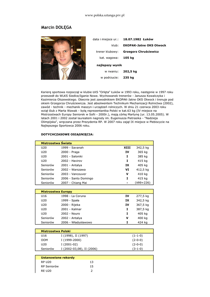 www.polska.sztanga.prv.pl Marcin DOŁĘGA data i miejsce ur.: klub: trener klubowy: kat. wagowa: 18.07.1982 Łuków EKOPAK-Jatne OKS Otwock Grzegorz Chruściewicz 105 kg najlepszy wynik w rwaniu: w podrzucie: 202,5 kg 235 kg Karierę sportowa rozpoczął w klubie ŁKS "Orlęta" Łuków w 1993 roku, następnie w 1997 roku przeszedł do WLKS Siedlce/Iganie Nowe. Wychowanek trenerów - Janusza Kowalczyka i Kazimierza Olszewskiego. Obecnie jest zawodnikiem EKOPAK-Jatne OKS Otwock i trenuje pod okiem Grzegorza Chruściewicza. Jest absolwentem Technikum Mechanizacji Rolnictwa (2002), zawód - technik - mechanik maszyn i urządzeń rolniczych. W dniu 21 czerwca 2003 roku wziął ślub z Marta Wawak - byłą reprezentantka Polski w kat.63 kg (IV miejsce na Mistrzostwach Europy Seniorek w Sofii - 2000r.), mają córkę Martynę (ur. 13.05.2005). W latach 2001 i 2002 został laureatem nagrody im. Eugeniusza Pietrasika - "Nadzieja Olimpijska", wręczana przez Prezydenta RP. W 2007 roku zajął IX miejsce w Plebiscycie na Najlepszego Sportowca 2006 roku. DOTYCHCZASOWE OSIĄGNIĘCIA: Mistrzostwa Świata U20 1999 - Savanah U20 2000 - Praga XIII 342,5 kg IV U20 365 kg 2001 - Saloniki I 385 kg U20 2002 - Havirov I 415 kg Seniorów 2001 - Antalya IX 405 kg Seniorów 2002 - Warszawa VI 412,5 kg Seniorów 2003 - Vancouver V 410 kg Seniorów 2006 - Santo Domingo I Seniorów 2007 - Chiang Mai - 415 kg (193+226) Mistrzostwa Europy U16 1998 - La Coruna IV 277,5 kg U20 1999 - Spała IX 342,5 kg U20 2000 - Rijeka IV 367,5 kg 387,5 kg U20 2001 - Kalmar I U20 2002 - Nouro I 405 kg Seniorów 2002 - Antalya V 400 kg Seniorów 2006 - Władysławowo I 424 kg Mistrzostwa Polski U16 I (1998), II (1997) (1-1-0) OOM I (1999-2000) (2-0-0) U20 I (2001-02) (2-0-0) Seniorów I (2002-03,08), II (2006) (3-1-0) Ustanowione rekordy RP U20 13 RP Seniorów 15 RE U20 2 www.polska.sztanga.prv.pl RE Seniorów 2 RŚ U20 2 RŚ Seniorów 2
