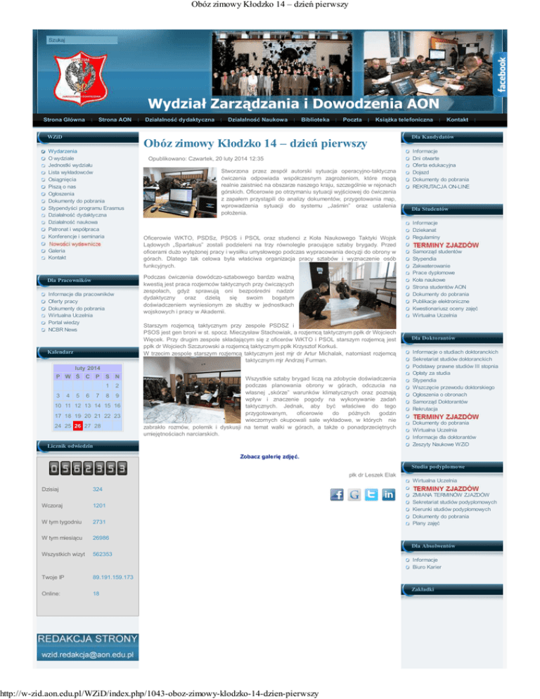 Obóz zimowy Kłodzko 14 – dzień pierwszy Szukaj Wydział Zarządzania i Dowodzenia AON Strona Główna Strona AON WZiD Wydarzenia O wydziale Jednostki wydziału Lista wykładowców Osiągnięcia Piszą o nas Ogłoszenia Dokumenty do pobrania Stypendyści programu Erasmus Działalność dydaktyczna Działalność naukowa Patronat i współpraca Konferencje i seminaria Galeria Kontakt Działalność dydaktyczna Działalność Naukowa Biblioteka Poczta Książka telefoniczna Obóz zimowy Kłodzko 14 – dzień pierwszy Opublikowano: Czwartek, 20 luty 2014 12:35 Stworzona przez zespół autorski sytuacja operacyjno-taktyczna ćwiczenia odpowiada współczesnym zagrożeniom, które mogą realnie zaistnieć na obszarze naszego kraju, szczególnie w rejonach górskich. Oficerowie po otrzymaniu sytuacji wyjściowej do ćwiczenia z zapałem przystąpili do analizy dokumentów, przygotowania map, wprowadzenia sytuacji do systemu „Jaśmin” oraz ustalenia położenia. Oficerowie WKTO, PSDSz, PSOS i PSOL oraz studenci z Koła Naukowego Taktyki Wojsk Lądowych „Spartakus” zostali podzieleni na trzy równolegle pracujące sztaby brygady. Przed oficerami dużo wytężonej pracy i wysiłku umysłowego podczas wypracowania decyzji do obrony w górach. Dlatego tak celowa była właściwa organizacja pracy sztabów i wyznaczenie osób funkcyjnych. Podczas ćwiczenia dowódczo-sztabowego bardzo ważną kwestią jest praca rozjemców taktycznych przy ćwiczących zespołach, gdyż sprawują oni bezpośredni nadzór dydaktyczny oraz dzielą się swoim bogatym doświadczeniem wyniesionym ze służby w jednostkach wojskowych i pracy w Akademii. Dla Pracowników Informacje dla pracowników Oferty pracy Dokumenty do pobrania Wirtualna Uczelnia Portal wiedzy NCBR News Starszym rozjemcą taktycznym przy zespole PSDSZ i PSOS jest gen broni w st. spocz. Mieczysław Stachowiak, a rozjemcą taktycznym ppłk dr Wojciech Więcek. Przy drugim zespole składającym się z oficerów WKTO i PSOL starszym rozjemcą jest ppłk dr Wojciech Szczurowski a rozjemcą taktycznym ppłk Krzysztof Korkuś. W trzecim zespole starszym rozjemcą taktycznym jest mjr dr Artur Michalak, natomiast rozjemcą taktycznym mjr Andrzej Furman. Kalendarz luty 2014 P W Ś C P 3 4 5 6 7 S N 1 2 8 9 10 11 12 13 14 15 16 17 18 19 20 21 22 23 24 25 26 27 28 Wszystkie sztaby brygad liczą na zdobycie doświadczenia podczas planowania obrony w górach, odczucia na własnej „skórze” warunków klimatycznych oraz poznają wpływ i znaczenie pogody na wykonywanie zadań taktycznych. Jednak, aby być właściwe do tego przygotowanym, oficerowie do późnych godzin wieczornych okupowali sale wykładowe, w których nie zabrakło rozmów, polemik i dyskusji na temat walki w górach, a także o ponadprzeciętnych umiejętnościach narciarskich. Licznik odwiedzin Kontakt Dla Kandydatów Informacje Dni otwarte Oferta edukacyjna Dojazd Dokumenty do pobrania REKRUTACJA ON-LINE Dla Studentów Informacje Dziekanat Regulaminy Samorząd studentów Stypendia Zakwaterowanie Prace dyplomowe Koła naukowe Strona studentów AON Dokumenty do pobrania Publikacje elektroniczne Kwestionariusz oceny zajęć Wirtualna Uczelnia Dla Doktorantów Informacje o studiach doktoranckich Sekretariat studiów doktoranckich Podstawy prawne studiów III stopnia Opłaty za studia Stypendia Wszczęcie przewodu doktorskiego Ogłoszenia o obronach Samorząd Doktorantów Rekrutacja Dokumenty do pobrania Wirtualna Uczelnia Informacje dla doktorantów Zeszyty Naukowe WZiD Zobacz galerię zdjęć. Studia podyplomowe płk dr Leszek Elak Wirtualna Uczelnia Dzisiaj 324 Wczoraj 1201 W tym tygodniu 2731 W tym miesiącu 26986 Wszystkich wizyt 562353 ZMIANA TERMINÓW ZJAZDÓW Sekretariat studiów podyplomowych Kierunki studiów podyplomowych Dokumenty do pobrania Plany zajęć Dla Absolwentów Informacje Biuro Karier Twoje IP 89.191.159.173 Online: 18 http://w-zid.aon.edu.pl/WZiD/index.php/1043-oboz-zimowy-klodzko-14-dzien-pierwszy Zakładki
