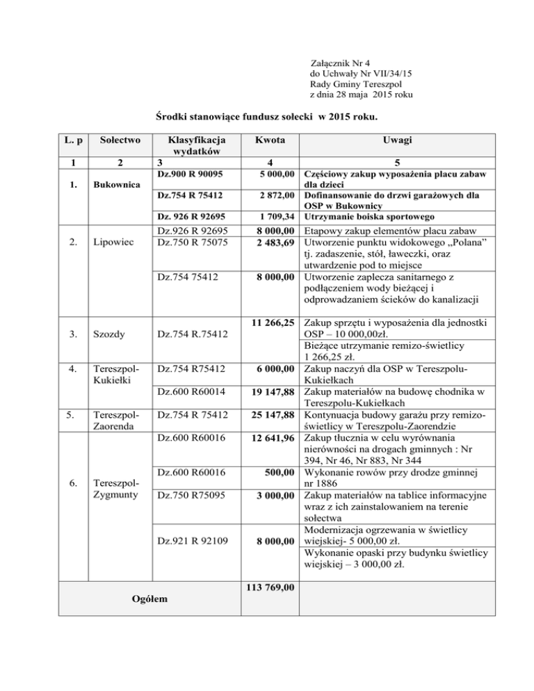 Załącznik Nr 4 do Uchwały Nr VII/34/15 Rady Gminy Tereszpol z dnia 28 maja 2015 roku Środki stanowiące fundusz sołecki w 2015 roku. L. p Sołectwo 1 2 Klasyfikacja wydatków 3 Dz.900 R 90095 1. Bukownica Dz.754 R 75412 Dz. 926 R 92695 2. Lipowiec Dz.926 R 92695 Dz.750 R 75075 Dz.754 75412 3. Szozdy Dz.754 R.75412 4. TereszpolKukiełki Dz.754 R75412 Dz.600 R60014 5. TereszpolZaorenda Dz.754 R 75412 Dz.600 R60016 Dz.600 R60016 6. TereszpolZygmunty Dz.750 R75095 Dz.921 R 92109 Kwota Uwagi 4 5 5 000,00 Częściowy zakup wyposażenia placu zabaw dla dzieci 2 872,00 Dofinansowanie do drzwi garażowych dla OSP w Bukownicy 1 709,34 Utrzymanie boiska sportowego 8 000,00 Etapowy zakup elementów placu zabaw 2 483,69 Utworzenie punktu widokowego „Polana” tj. zadaszenie, stół, ławeczki, oraz utwardzenie pod to miejsce 8 000,00 Utworzenie zaplecza sanitarnego z podłączeniem wody bieżącej i odprowadzaniem ścieków do kanalizacji 11 266,25 Zakup sprzętu i wyposażenia dla jednostki OSP – 10 000,00zł. Bieżące utrzymanie remizo-świetlicy 1 266,25 zł. 6 000,00 Zakup naczyń dla OSP w TereszpoluKukiełkach 19 147,88 Zakup materiałów na budowę chodnika w Tereszpolu-Kukiełkach 25 147,88 Kontynuacja budowy garażu przy remizoświetlicy w Tereszpolu-Zaorendzie 12 641,96 Zakup tłucznia w celu wyrównania nierówności na drogach gminnych : Nr 394, Nr 46, Nr 883, Nr 344 500,00 Wykonanie rowów przy drodze gminnej nr 1886 3 000,00 Zakup materiałów na tablice informacyjne wraz z ich zainstalowaniem na terenie sołectwa Modernizacja ogrzewania w świetlicy 8 000,00 wiejskiej- 5 000,00 zł. Wykonanie opaski przy budynku świetlicy wiejskiej – 3 000,00 zł. 113 769,00 Ogółem